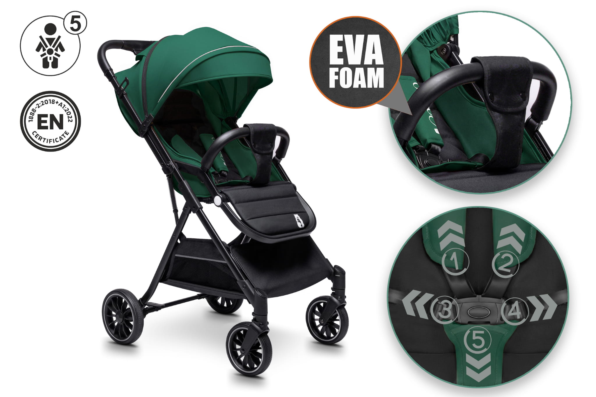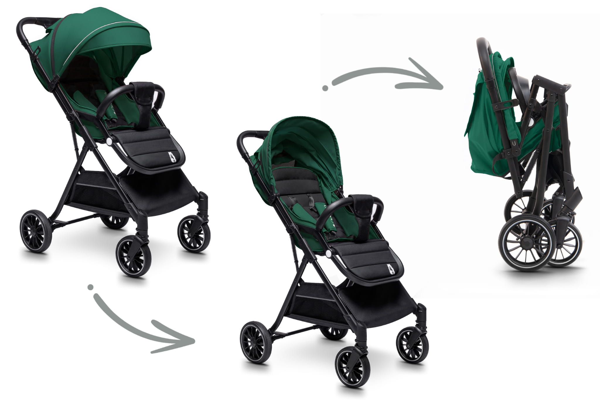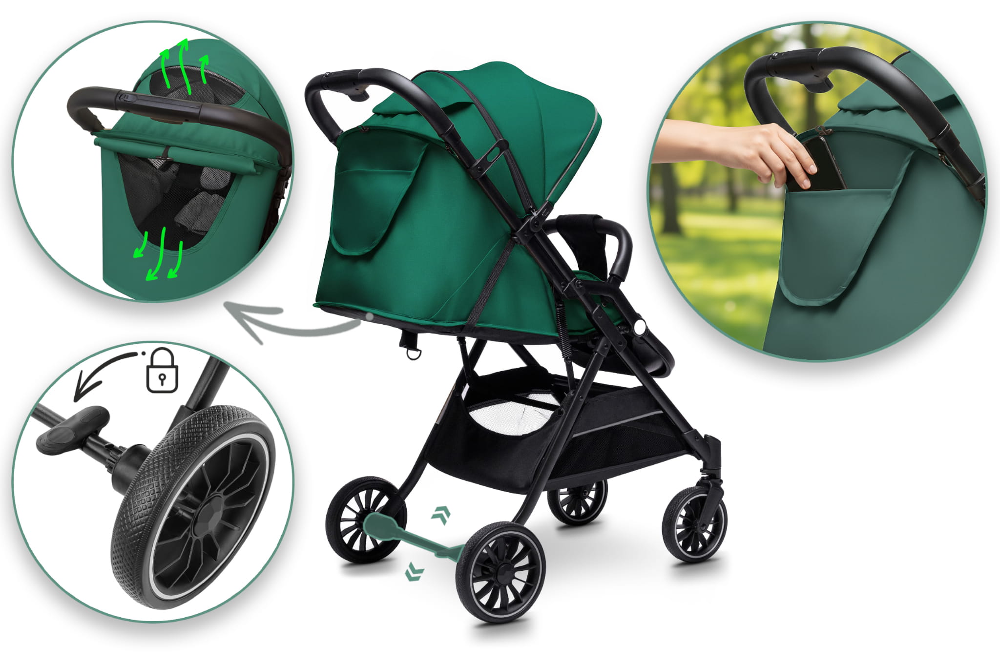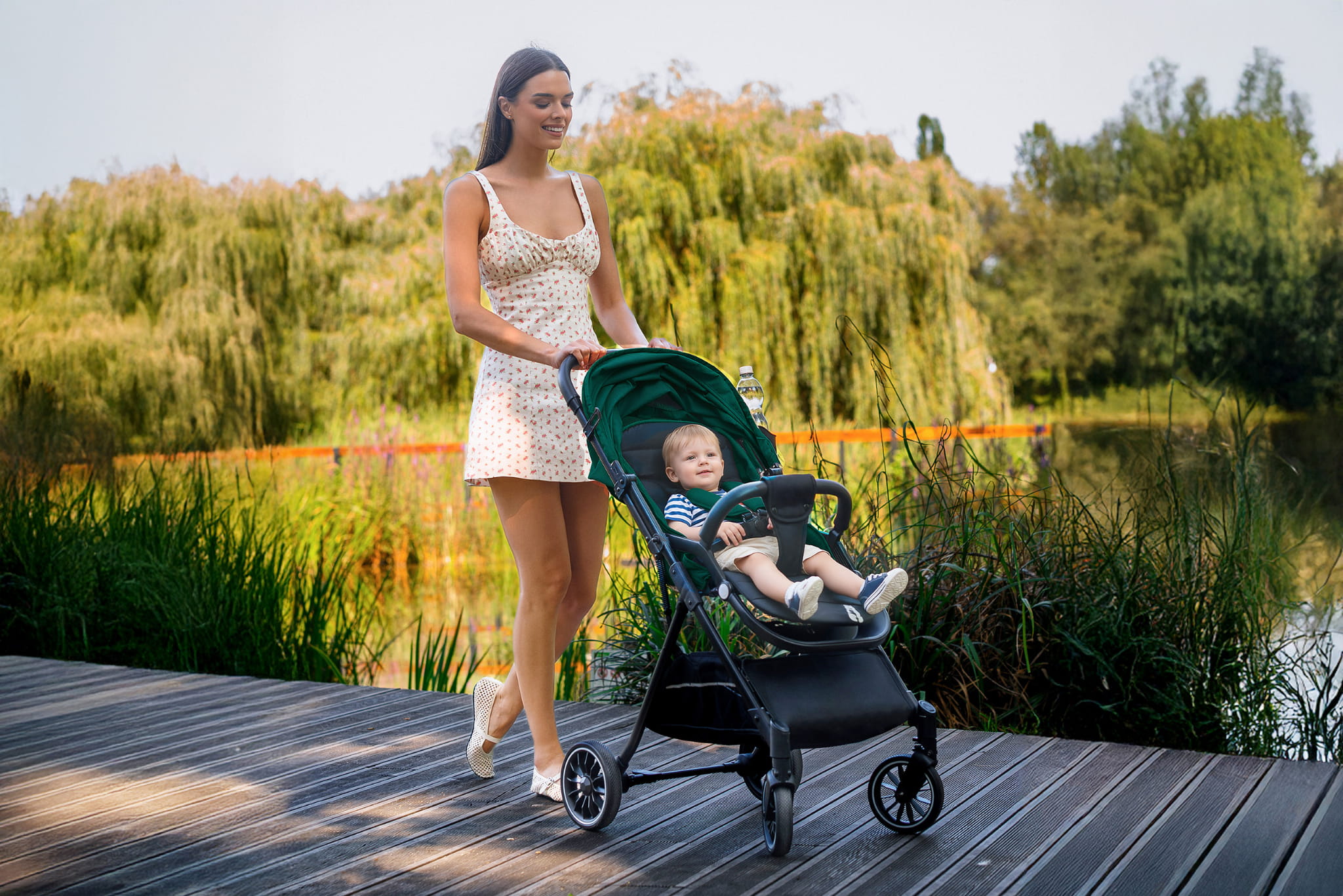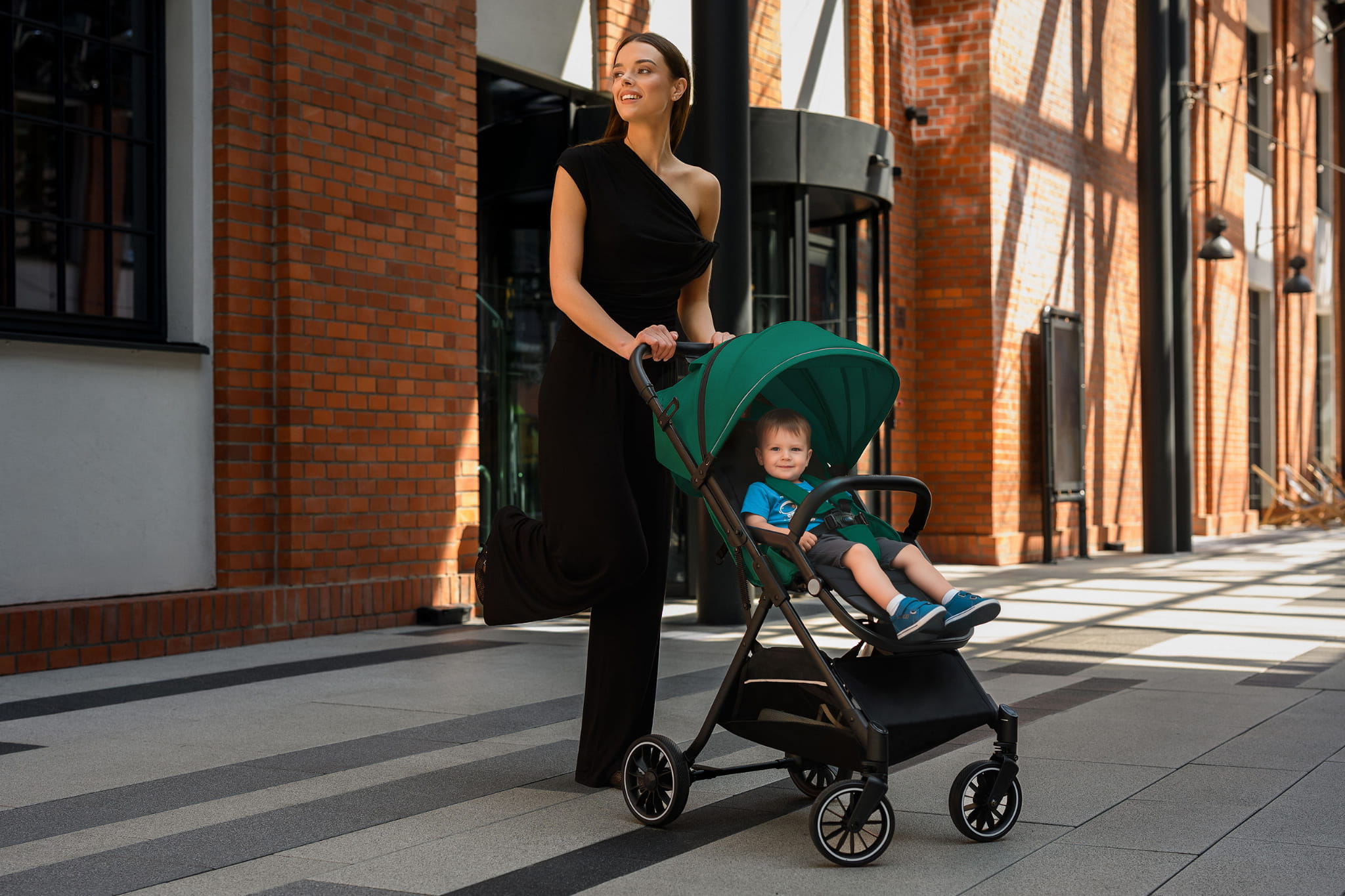 - Łatwy system składania jedną ręką – w kilka sekund złożysz wózek do kompaktowych rozmiarów, co jest niezwykle praktyczne podczas codziennych spacerów czy podróży.