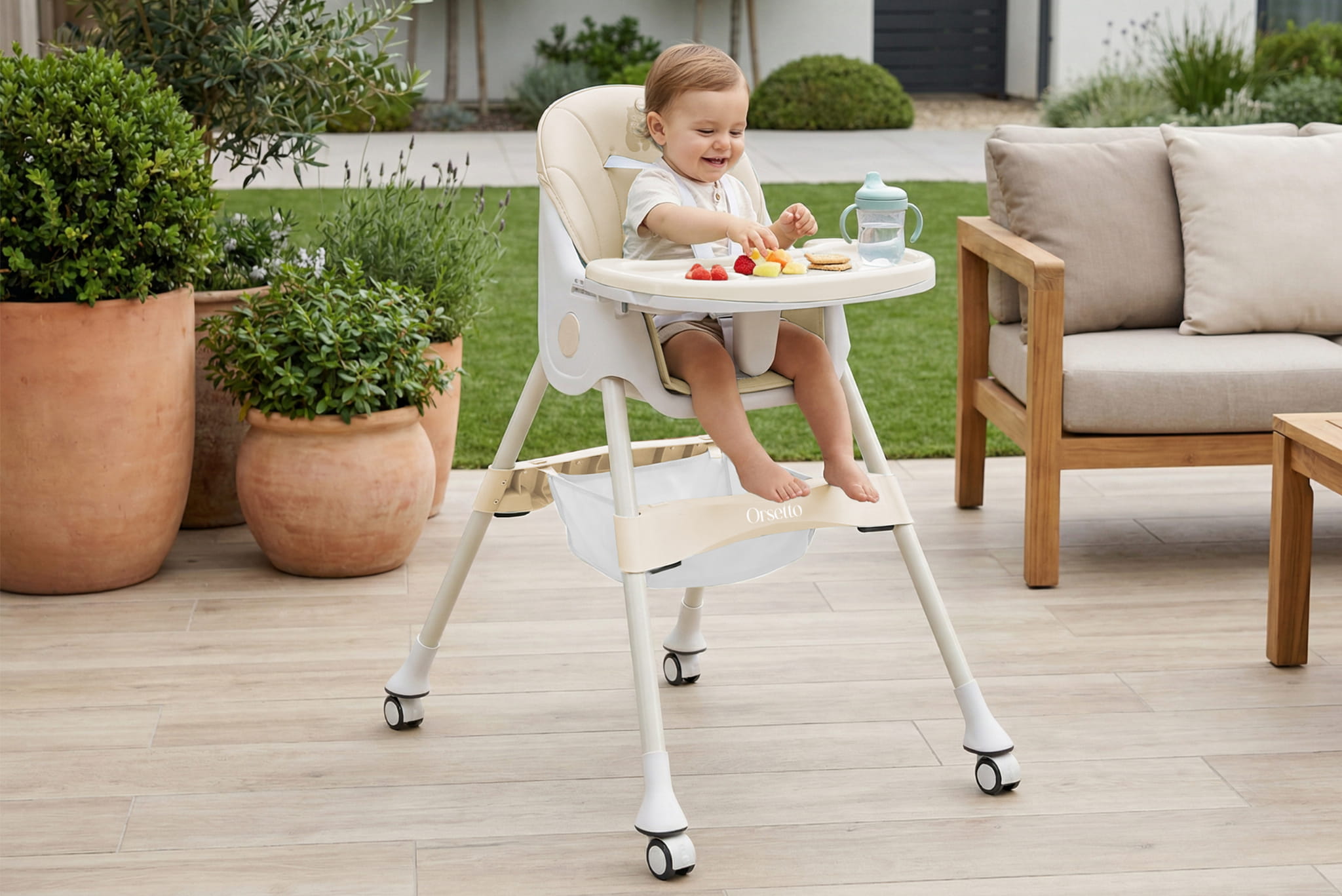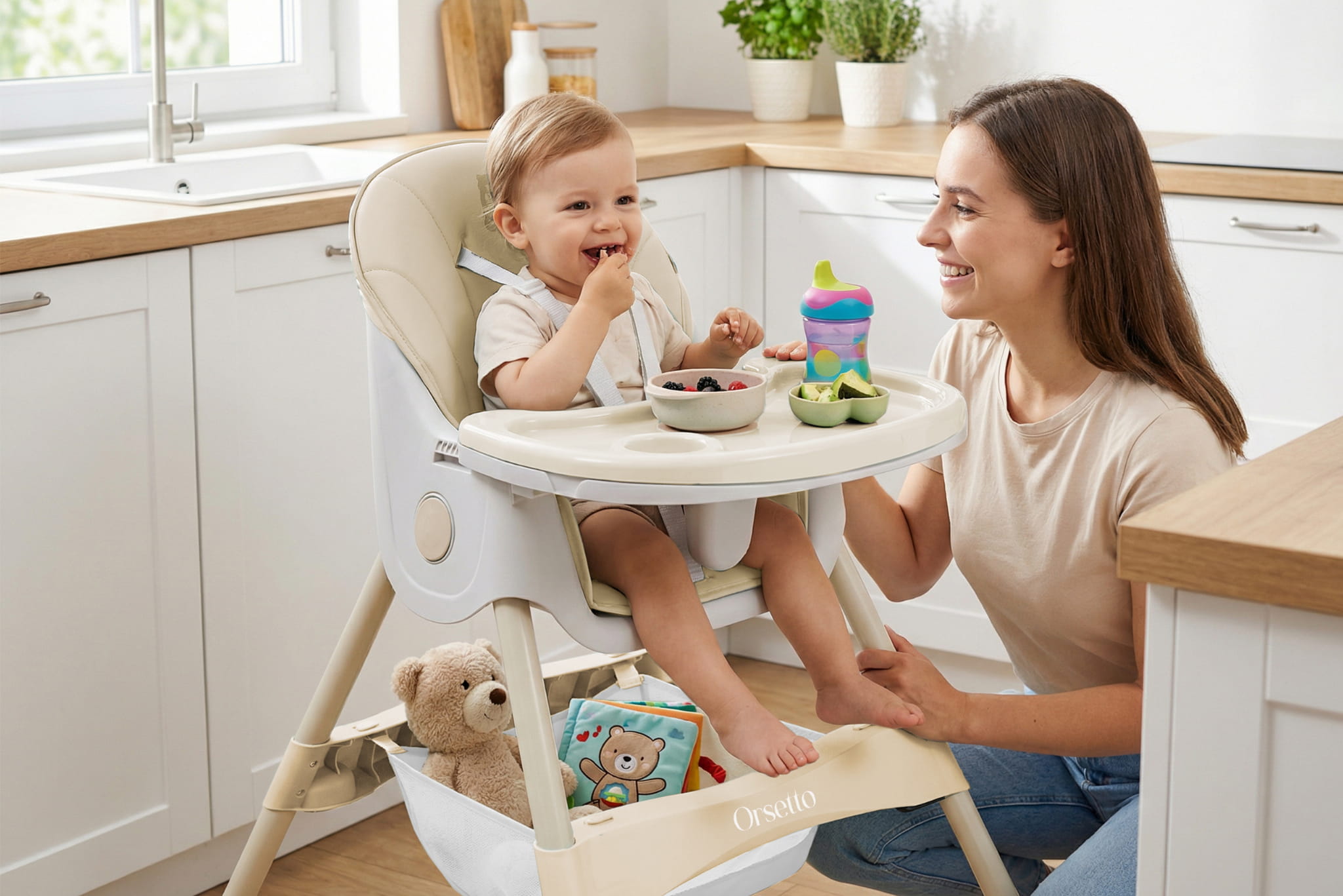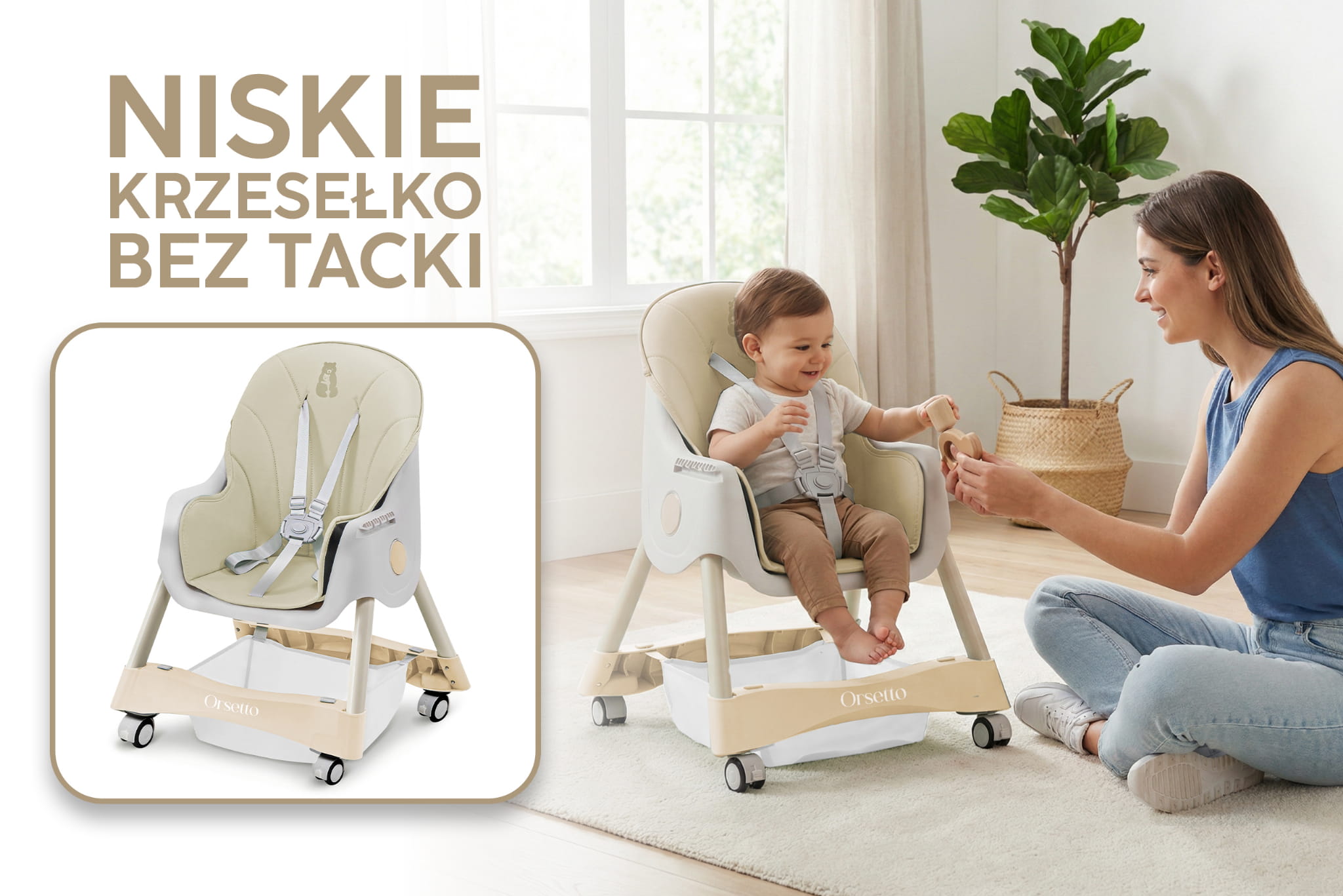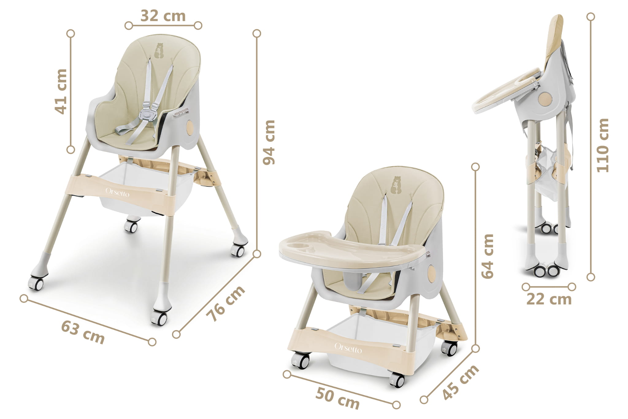 Krzesełko ORSETTO KARMELEK zostało wyposażone w liczne udogodnienia, które ułatwiają karmienie i codzienną opiekę nad dzieckiem. Wysokie krzesełko z tacką pozwala wygodnie nakarmić dziecko, gdy jest ono na podobnej wysokości co rodzice. Z kolei możliwość demontażu tacki i dosunięcia krzesełka do stołu umożliwia wspólne spożywanie posiłków. Niskie konfiguracje sprawdzą się, gdy dziecko zaczyna samodzielnie chodzić lub potrzebuje niezależnego mebelka.