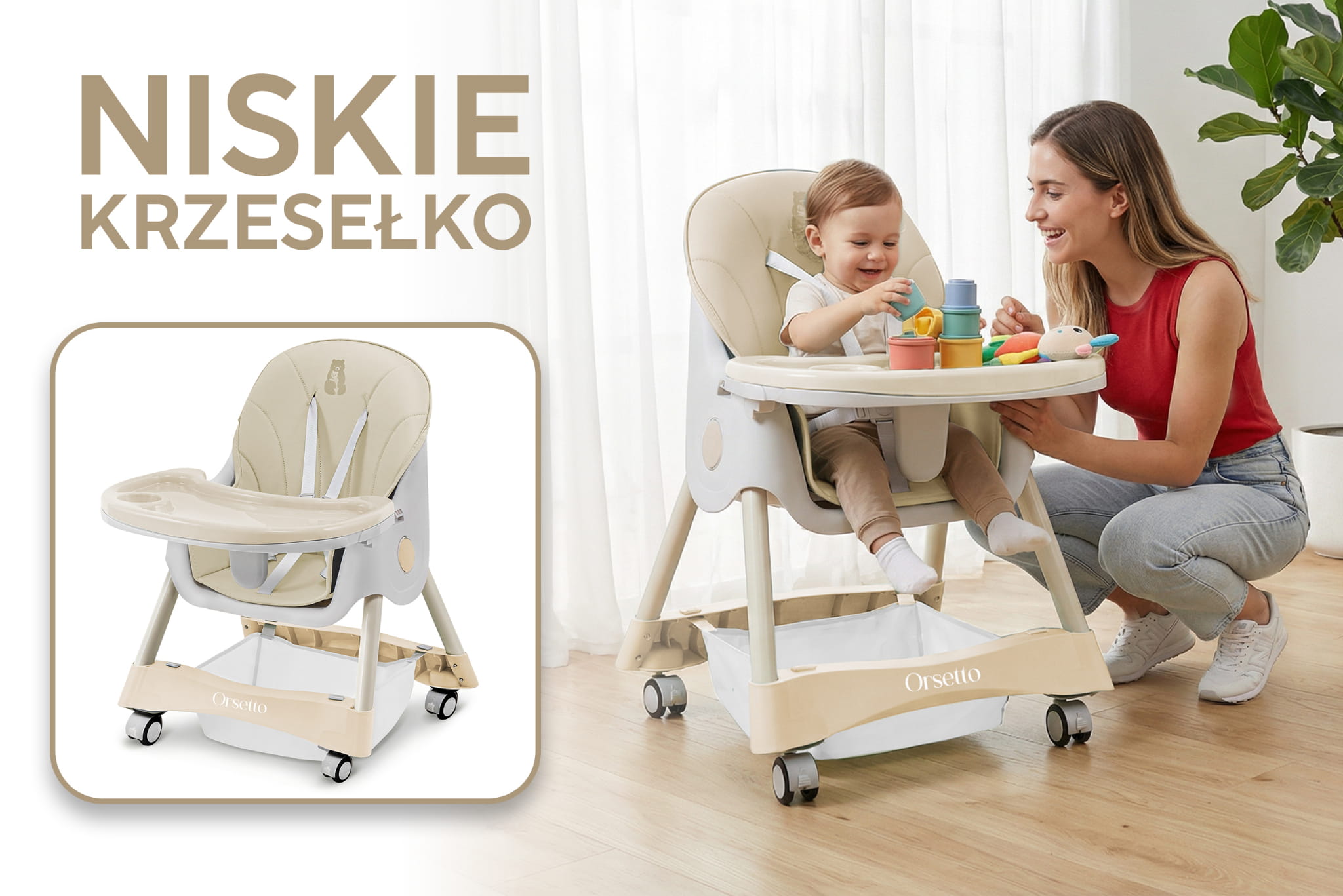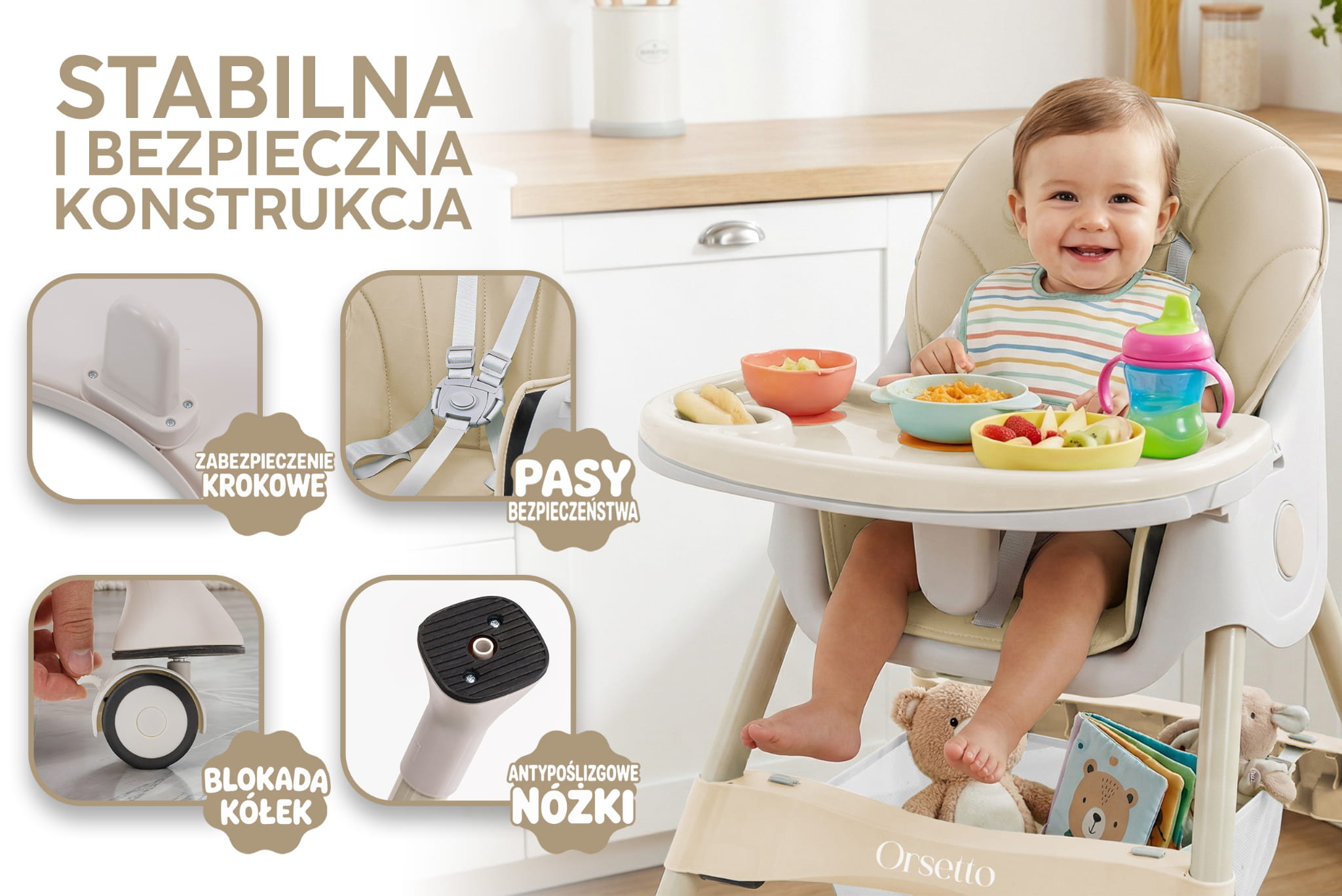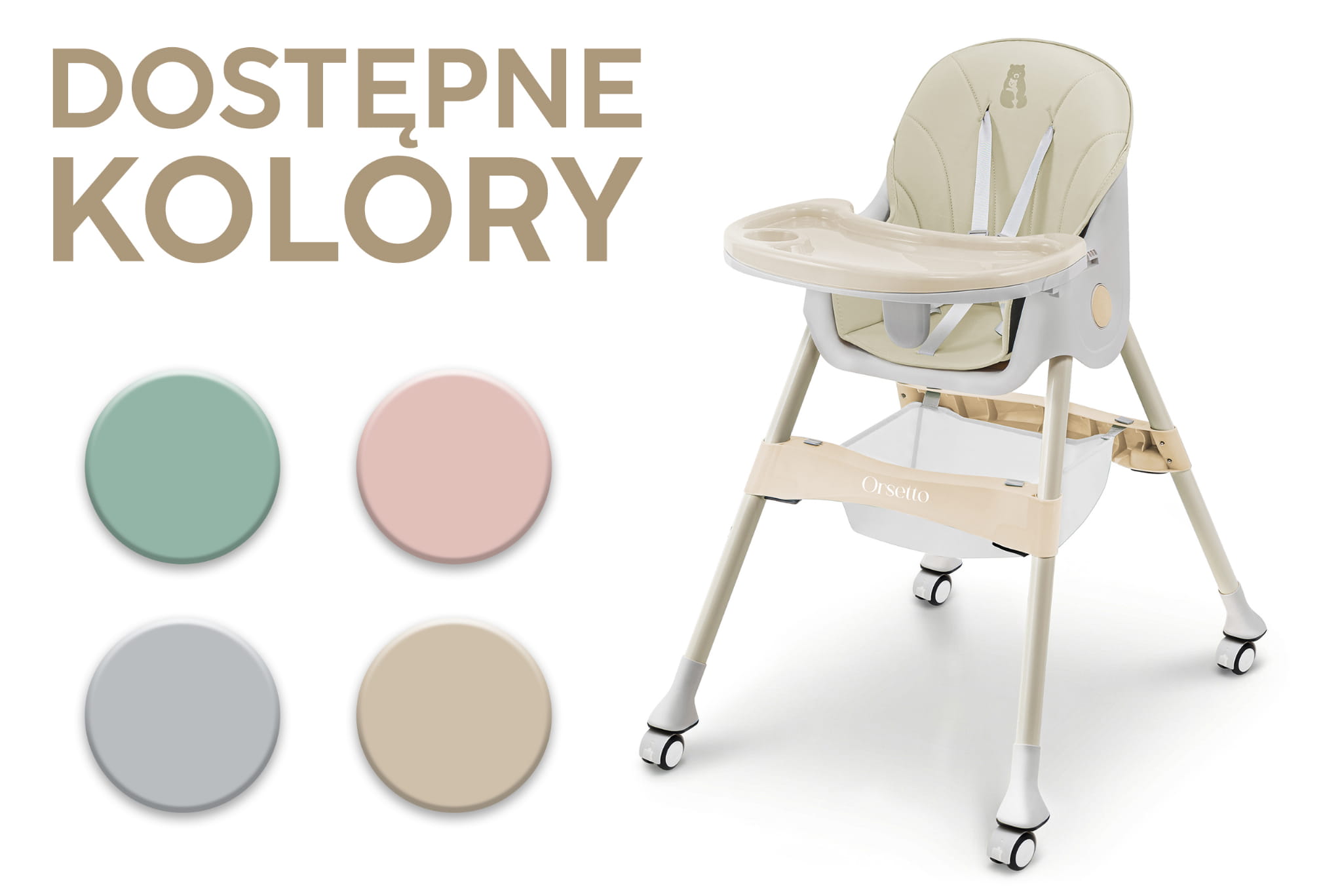 W codziennym życiu rodzica nie brakuje wyzwań, dlatego z przyjemnością przedstawiamy nasze krzesełko do karmienia ORSETTO KARMELEK. Zostało ono stworzone, aby ułatwić i uprzyjemnić codzienne obowiązki. Poznaj wszechstronne krzesełko 4w1, które dostosowuje się do potrzeb Twojego dziecka w miarę jego wzrostu. Dzięki różnym konfiguracjom - wysokie wolnostojące krzesełko, wysokie krzesełko dosunięte do stołu, niskie wolnostojące krzesełko oraz niskie krzesełko - codzienne zadania staną się prostsze i mniej czasochłonne. ORSETTO KARMELEK to Twój niezastąpiony pomocnik w każdej sytuacji. Specyfikacja:
