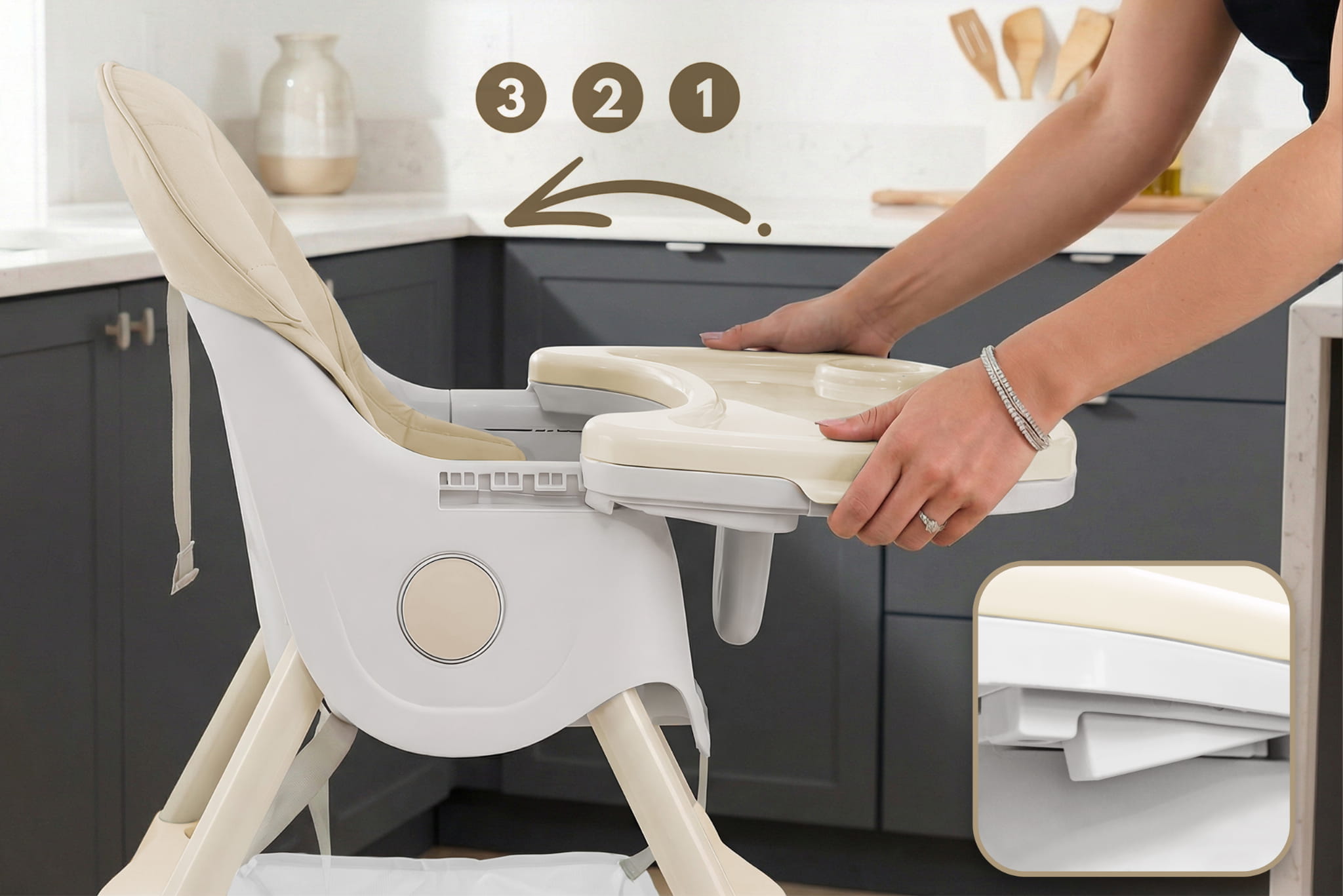 Dzięki zastosowaniu dwóch tacek, krzesełko krzesełko KARMELEK jest niezwykle praktyczne. Zewnętrzną tackę można szybko zdemontować, co ułatwia sprzątanie po posiłku, a główna tacka nadal zapewnia zabezpieczenie dla dziecka. Obie tacki można również całkowicie zdjąć, co umożliwia dosunięcie krzesełka bezpośrednio do blatu stołu, aby dziecko mogło spożywać posiłki razem z rodzicami. Tacki można z powodzeniem czyścić w zmywarce. KONSERWACJA I PIELĘGNACJA Krzesełko ORSETTO KARMELEK zostało zaprojektowane z myślą o łatwej konserwacji. Elementy plastikowe należy regularnie czyścić wilgotną ściereczką, aby zachować estetyczny wygląd i higienę. Nie zaleca się stosowania środków chemicznych ani substancji żrących. Zdemontowaną tackę można czyścić w zmywarce. Więcej informacji znajdą Państwo w instrukcji montażu i użytkowania. Link do pobrania: INSTRUKCJA