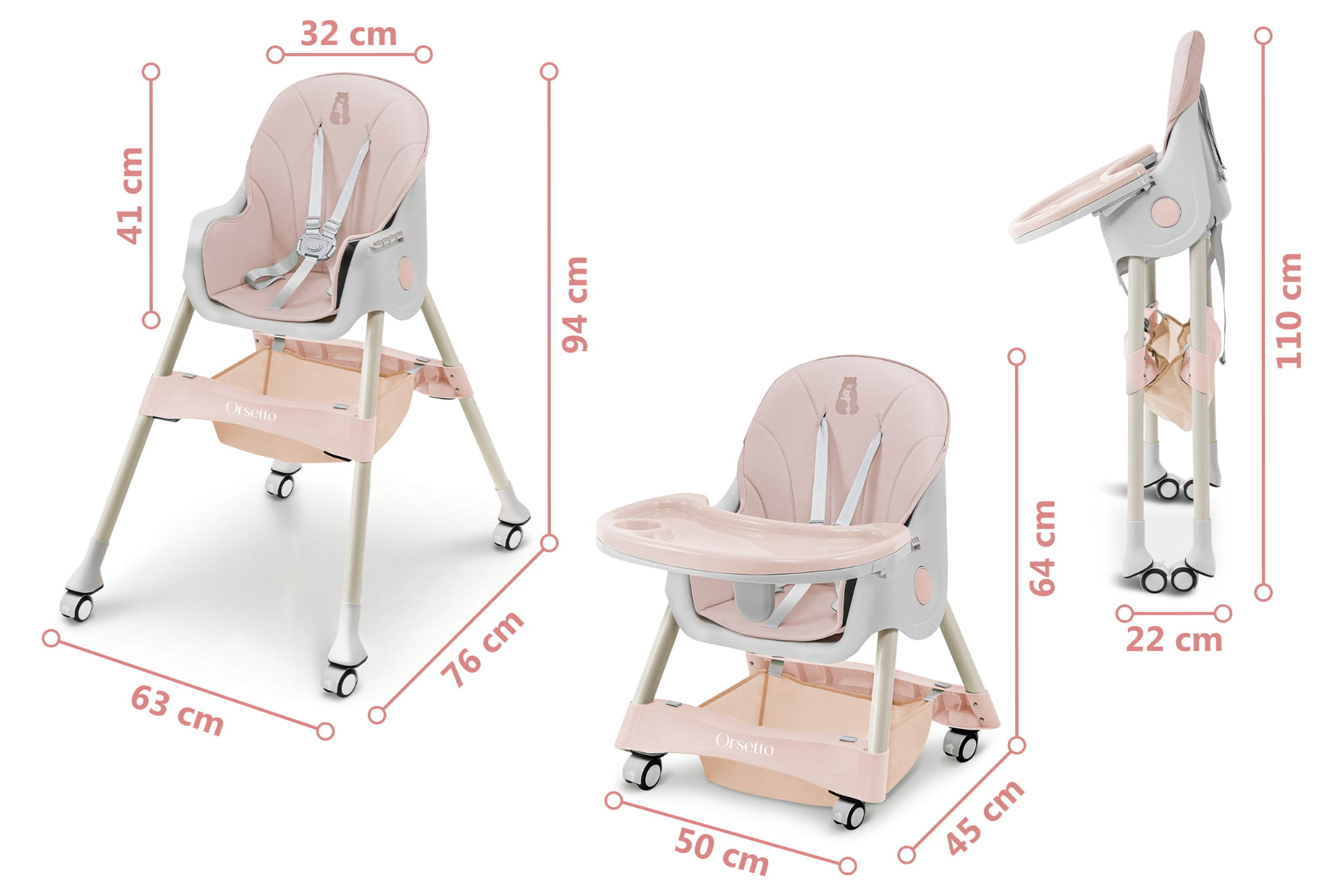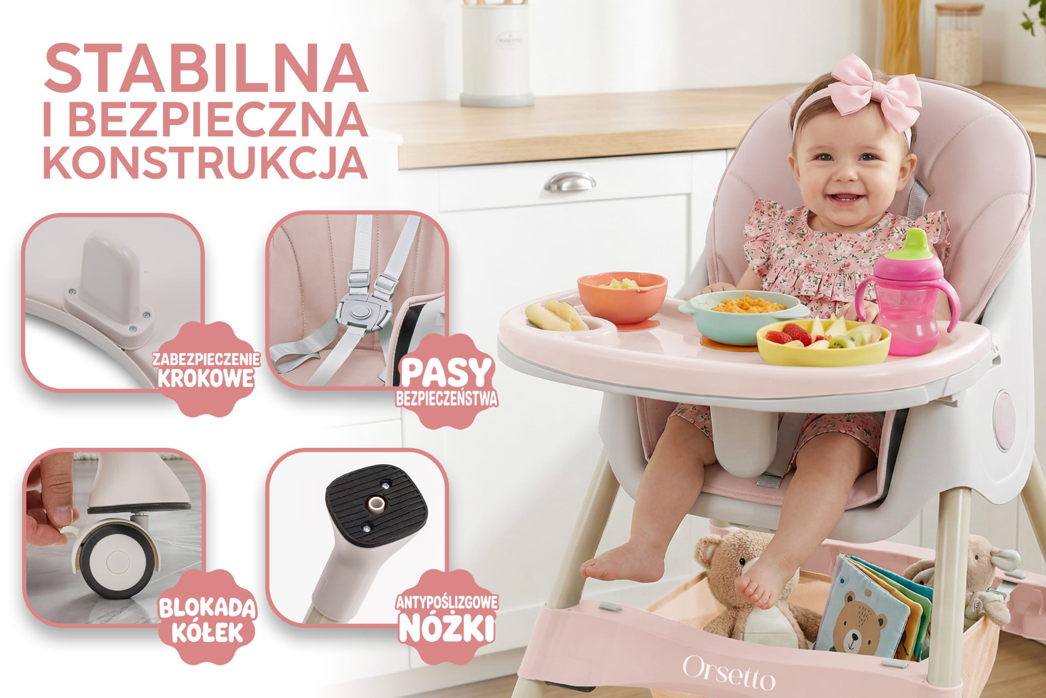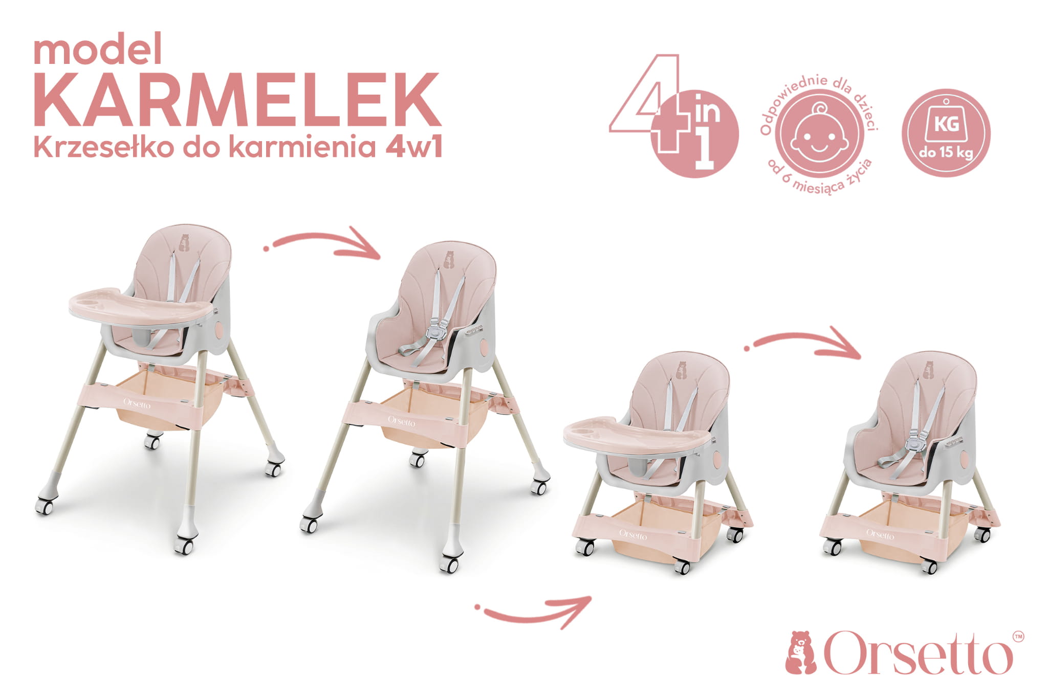 Krzesełko ORSETTO KARMELEK zostało wyposażone w liczne udogodnienia, które ułatwiają karmienie i codzienną opiekę nad dzieckiem. Wysokie krzesełko z tacką pozwala wygodnie nakarmić dziecko, gdy jest ono na podobnej wysokości co rodzice. Z kolei możliwość demontażu tacki i dosunięcia krzesełka do stołu umożliwia wspólne spożywanie posiłków. Niskie konfiguracje sprawdzą się, gdy dziecko zaczyna samodzielnie chodzić lub potrzebuje niezależnego mebelka.