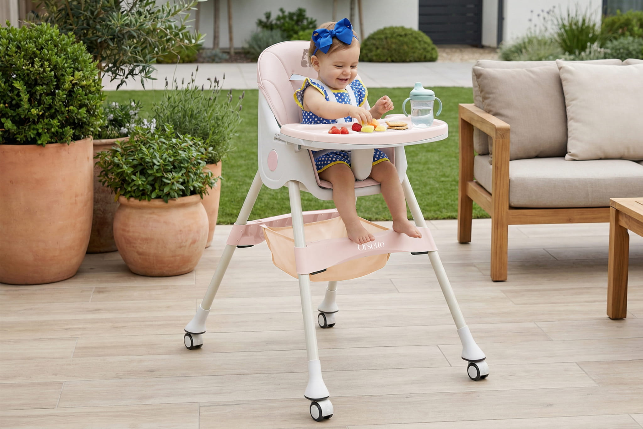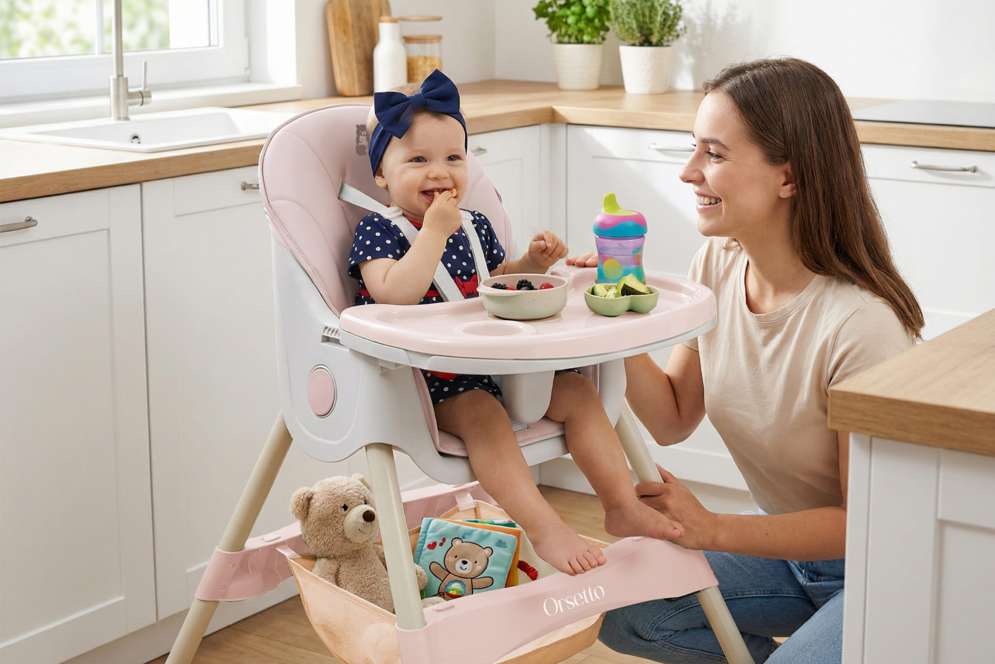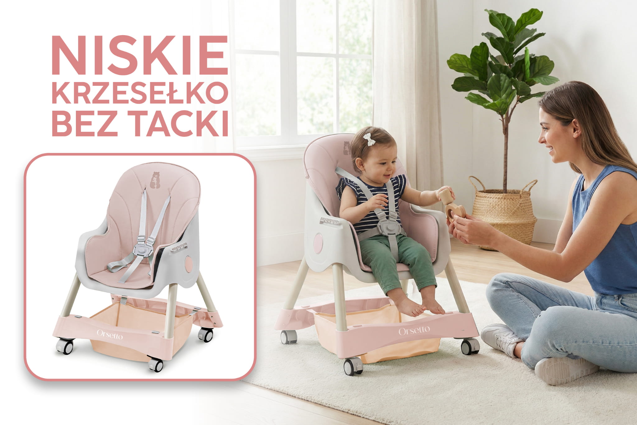 Krzesełko ORSETTO KARMELEK zostało wyposażone w liczne udogodnienia, które ułatwiają karmienie i codzienną opiekę nad dzieckiem. Wysokie krzesełko z tacką pozwala wygodnie nakarmić dziecko, gdy jest ono na podobnej wysokości co rodzice. Z kolei możliwość demontażu tacki i dosunięcia krzesełka do stołu umożliwia wspólne spożywanie posiłków. Niskie konfiguracje sprawdzą się, gdy dziecko zaczyna samodzielnie chodzić lub potrzebuje niezależnego mebelka.