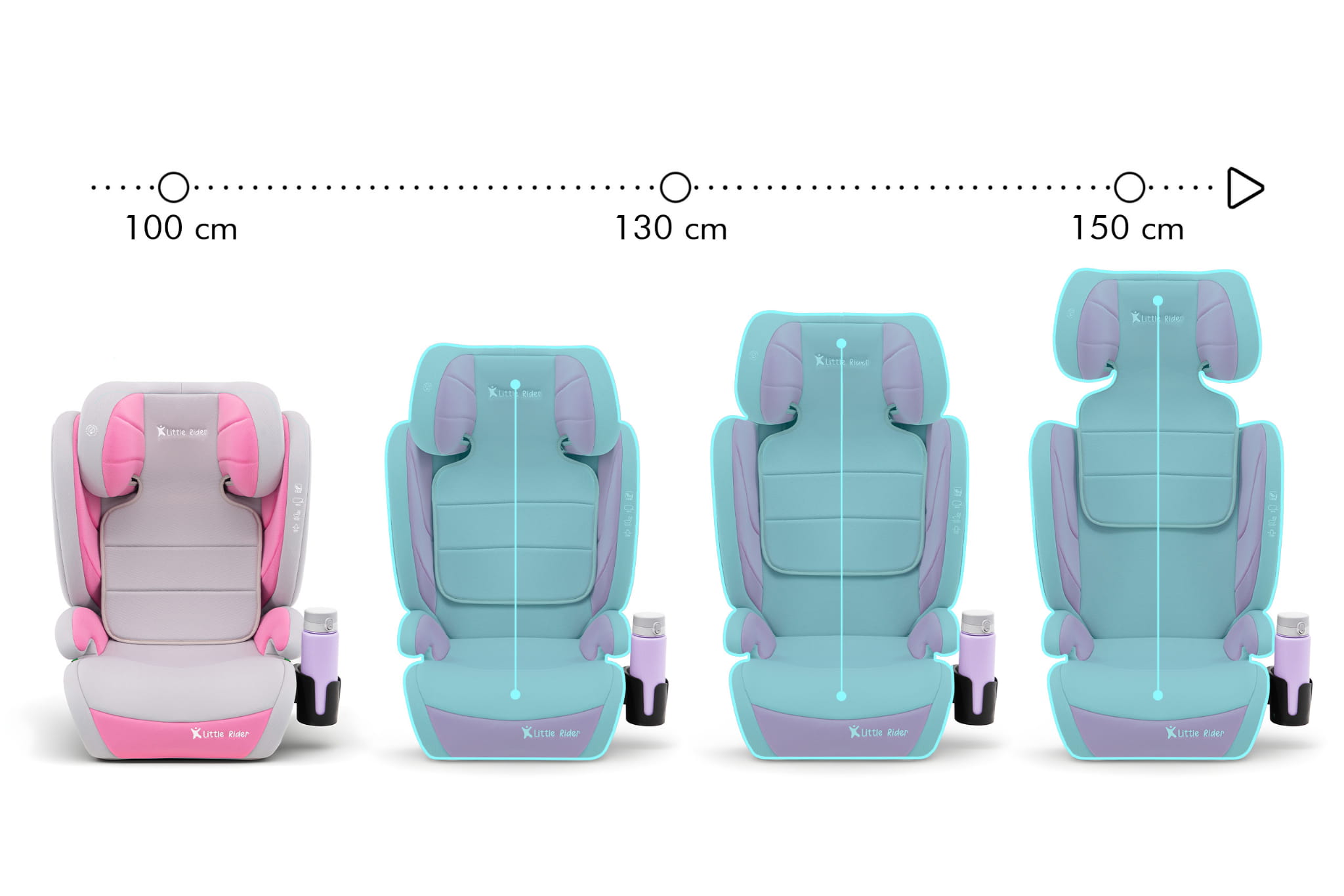 Certyfikowany fotelik samochodowy przeznaczony jest dla dzieci o wzroście 100-150 cm. Może być użytkowany przez dziecko do osiągnięcia 150 cm wzrostu, czyli do osiągnięcia około 12 roku życia. Fotelik może być montowany tylko i wyłącznie przodem do kierunku jazdy. Fotelik posiada 13-stopniowy system regulacji wysokości zagłówka, co pozwala na dostosowanie fotelika do wzrostu dziecka, dlatego może być użytkowany przez lata.