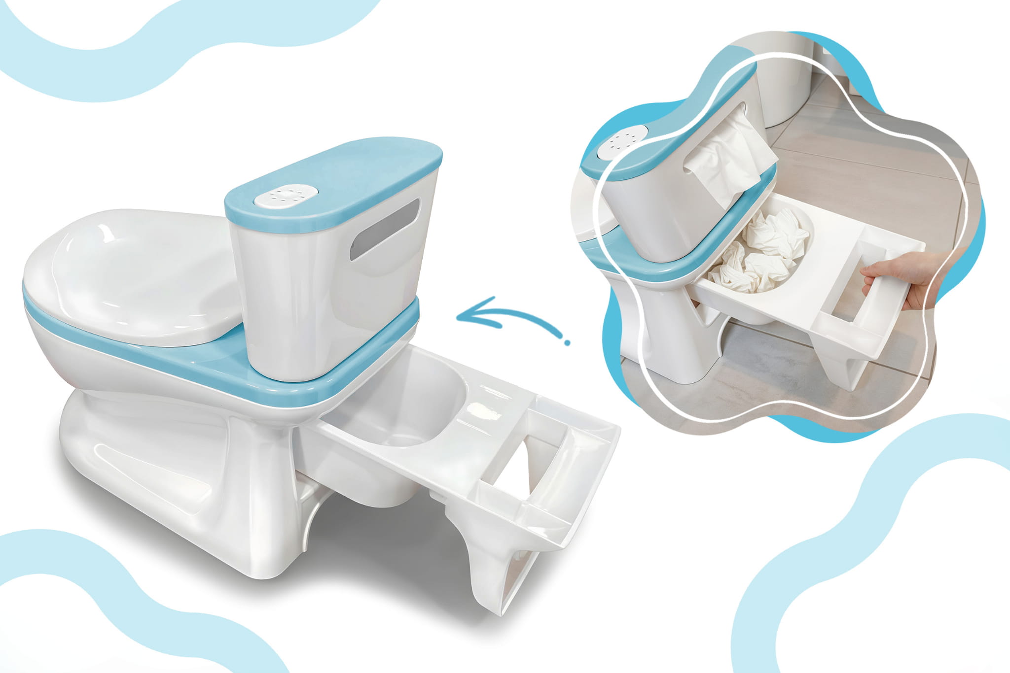 W obudowie nocnika znajduje się praktyczny schowek na wilgotne chusteczki. Dzięki specjalnemu otworowi można je łatwo wyciągać, co pozwala szybko i wygodnie zadbać o higienę dziecka zaraz po skorzystaniu z nocnika. To sprytne rozwiązanie sprawia, że wszystko, czego potrzebujesz, masz zawsze pod ręką. Antypoślizgowe podkładki zapobiegają przypadkowym przesunięciom, dzięki czemu konstrukcja jest stabilna, a użytkowanie bezpieczne.
