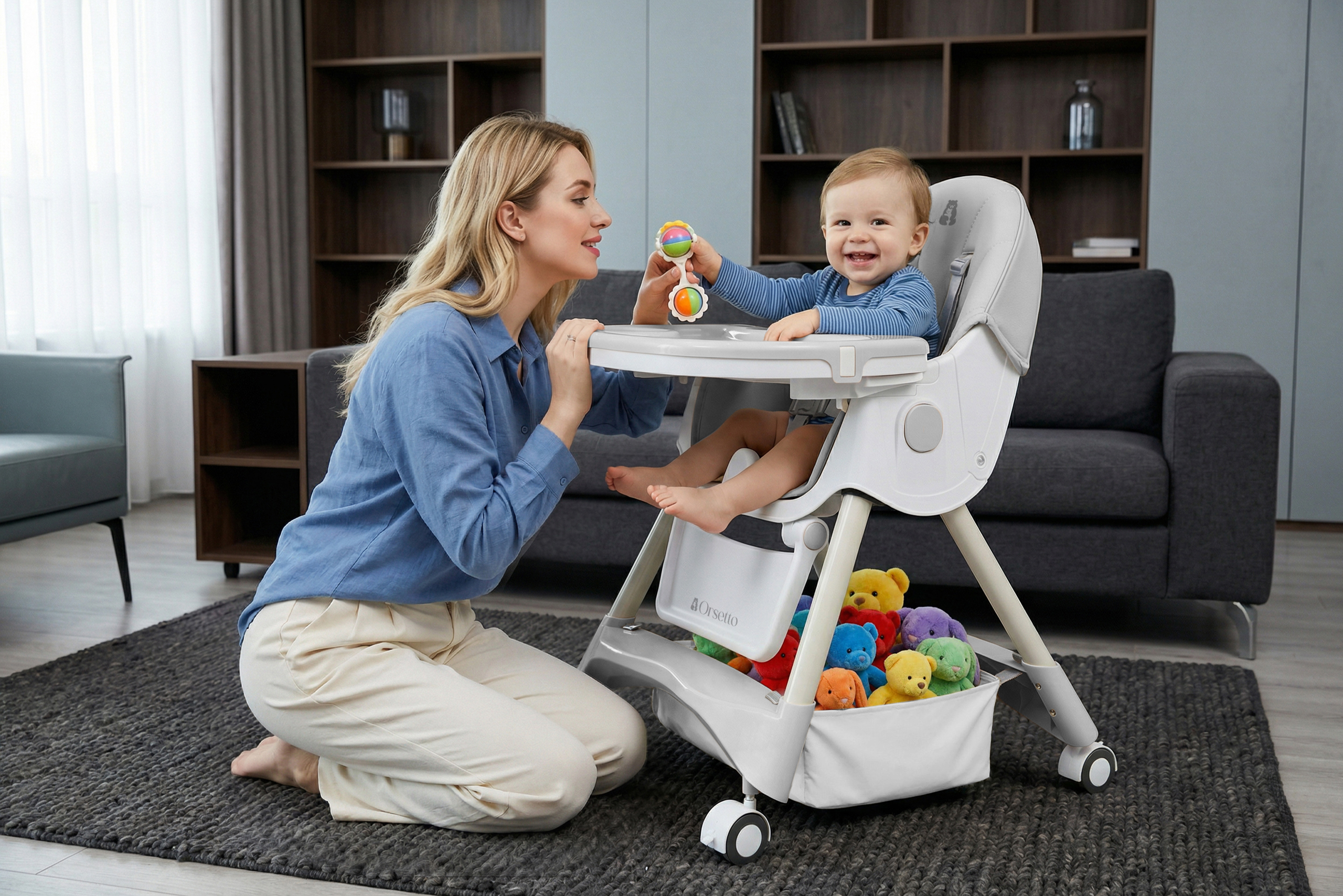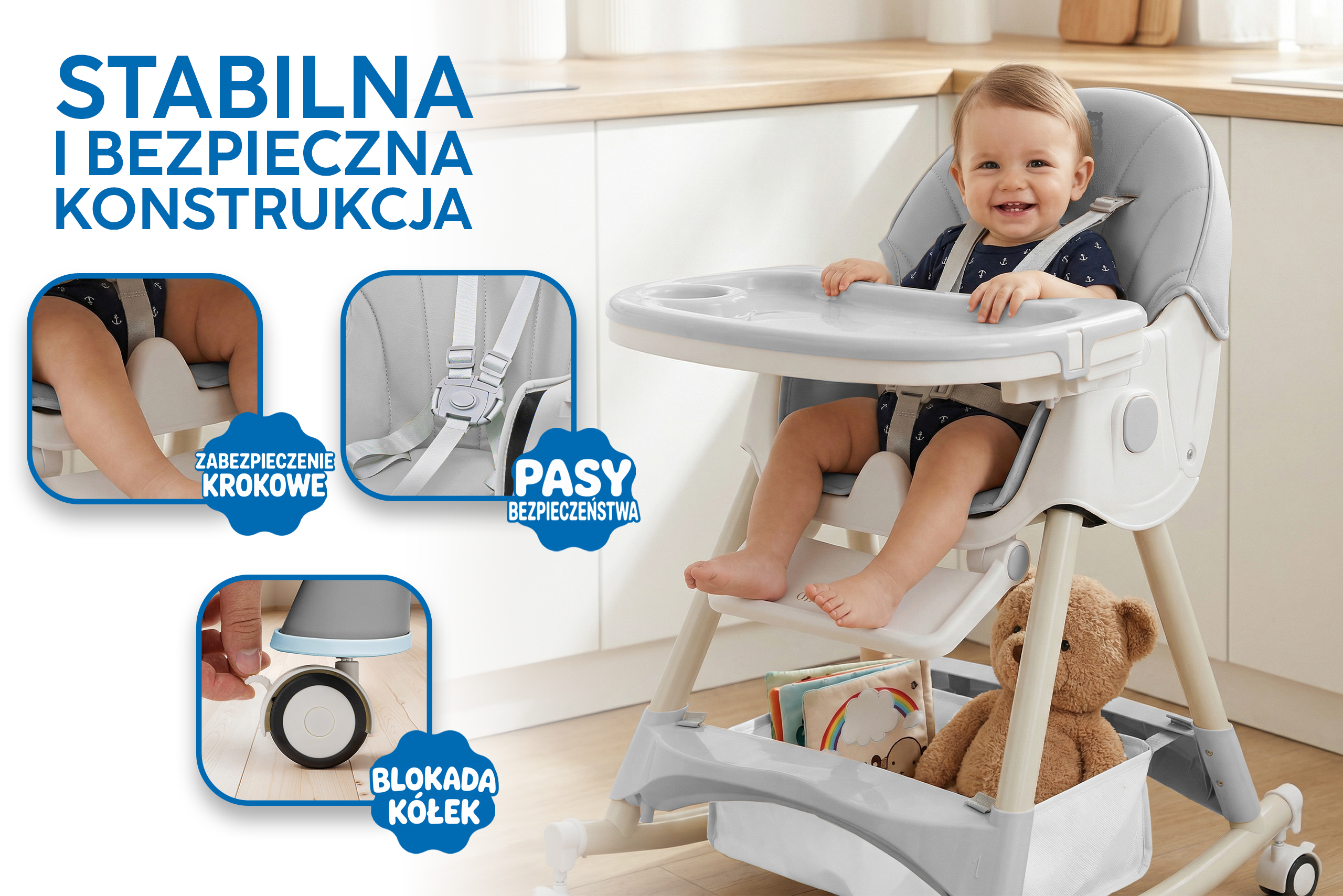 • Wysokie wolnostojące krzesełko do karmienia: wyposażone w długie nogi i tackę, idealne do samodzielnego karmienia.