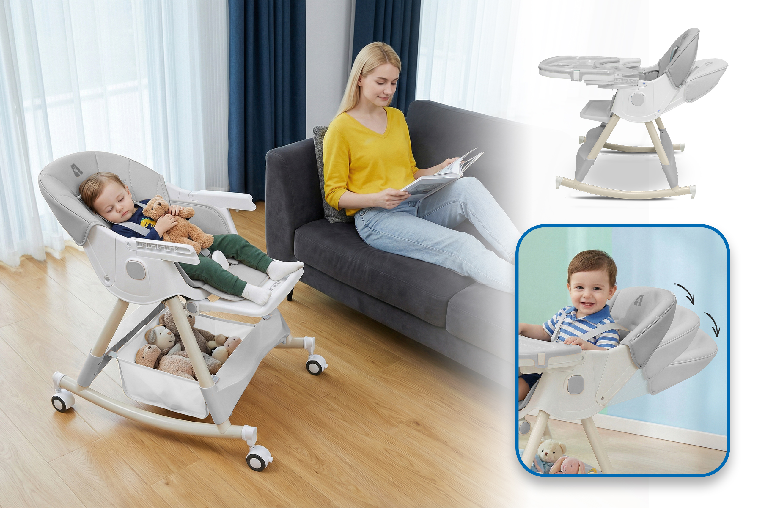 Poznaj wszechstronne krzesełko 6w1, które rośnie razem z Twoim dzieckiem! Dzięki różnym konfiguracjom – bujaczek, wysokie i niskie krzesełko, wersja z kółkami – codzienna opieka nad maluchem stanie się wygodniejsza i bardziej funkcjonalna. To niezastąpiony pomocnik w każdej sytuacji!