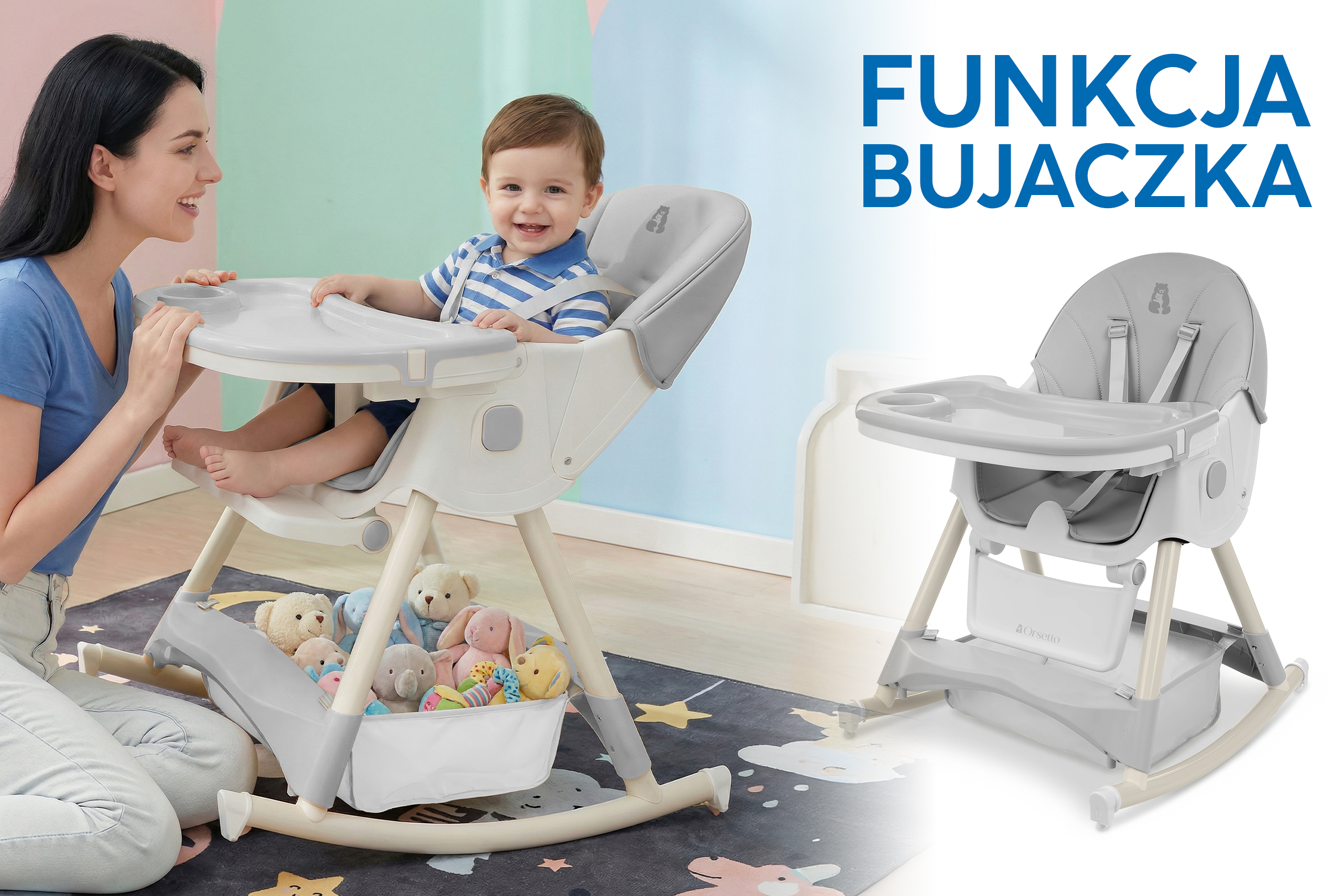 • Krzesełko na biegunach - bujaczek: zapewnia relaks, zabawę i wspomaga rozwój motoryczny dziecka.