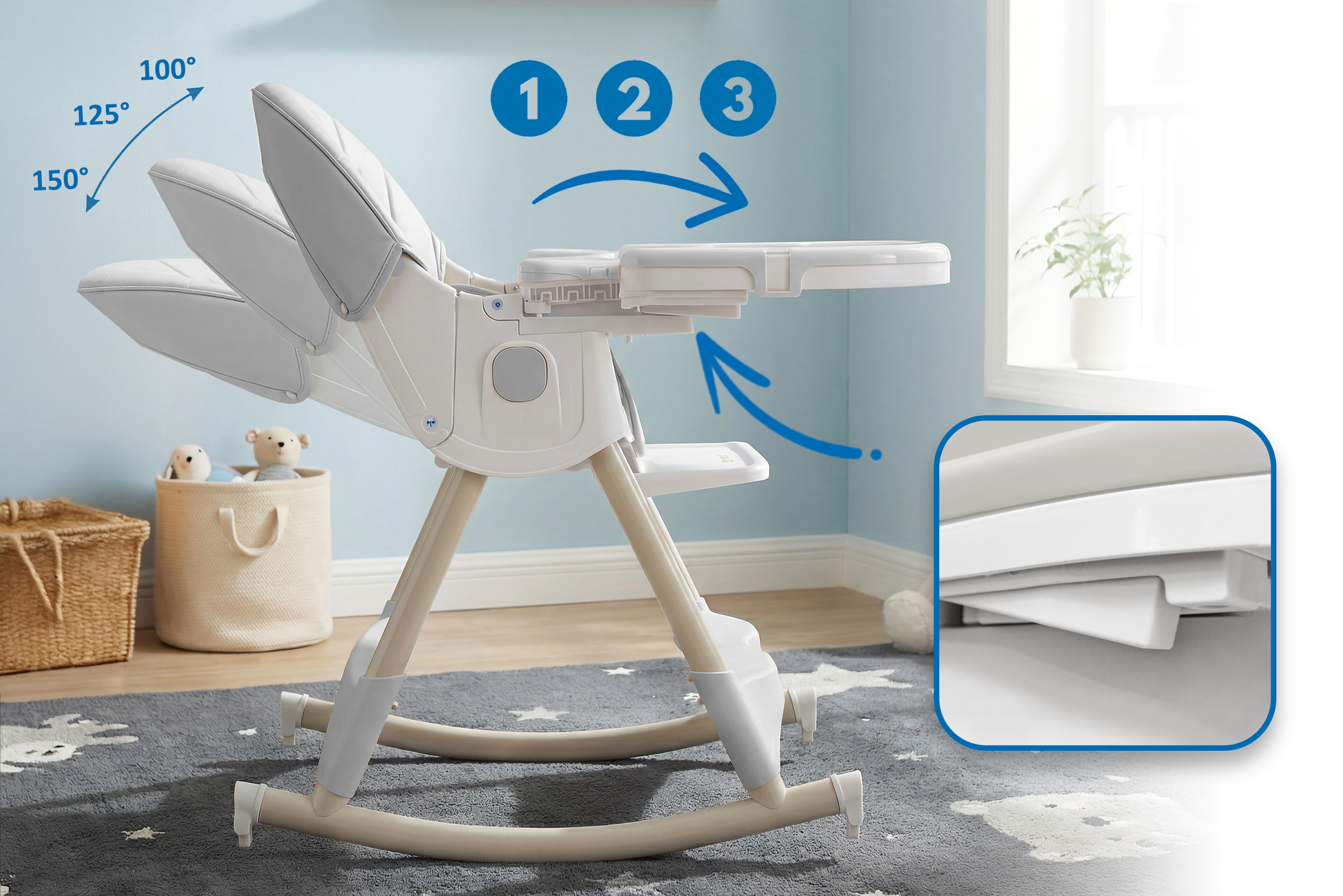 • Demontowane płozy pozwalają szybko przekształcić krzesełko w bezpieczny bujaczek.