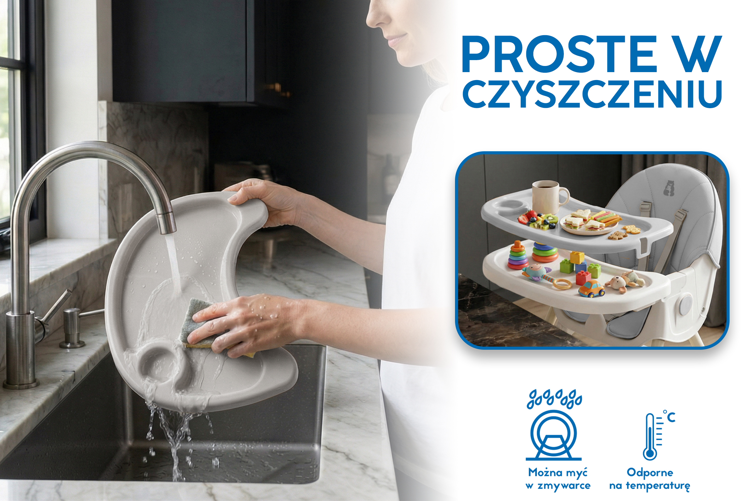 • Zewnętrzną tackę można szybko zdemontować, co ułatwia sprzątanie po posiłku, a główna tacka nadal zapewnia zabezpieczenie dla dziecka.