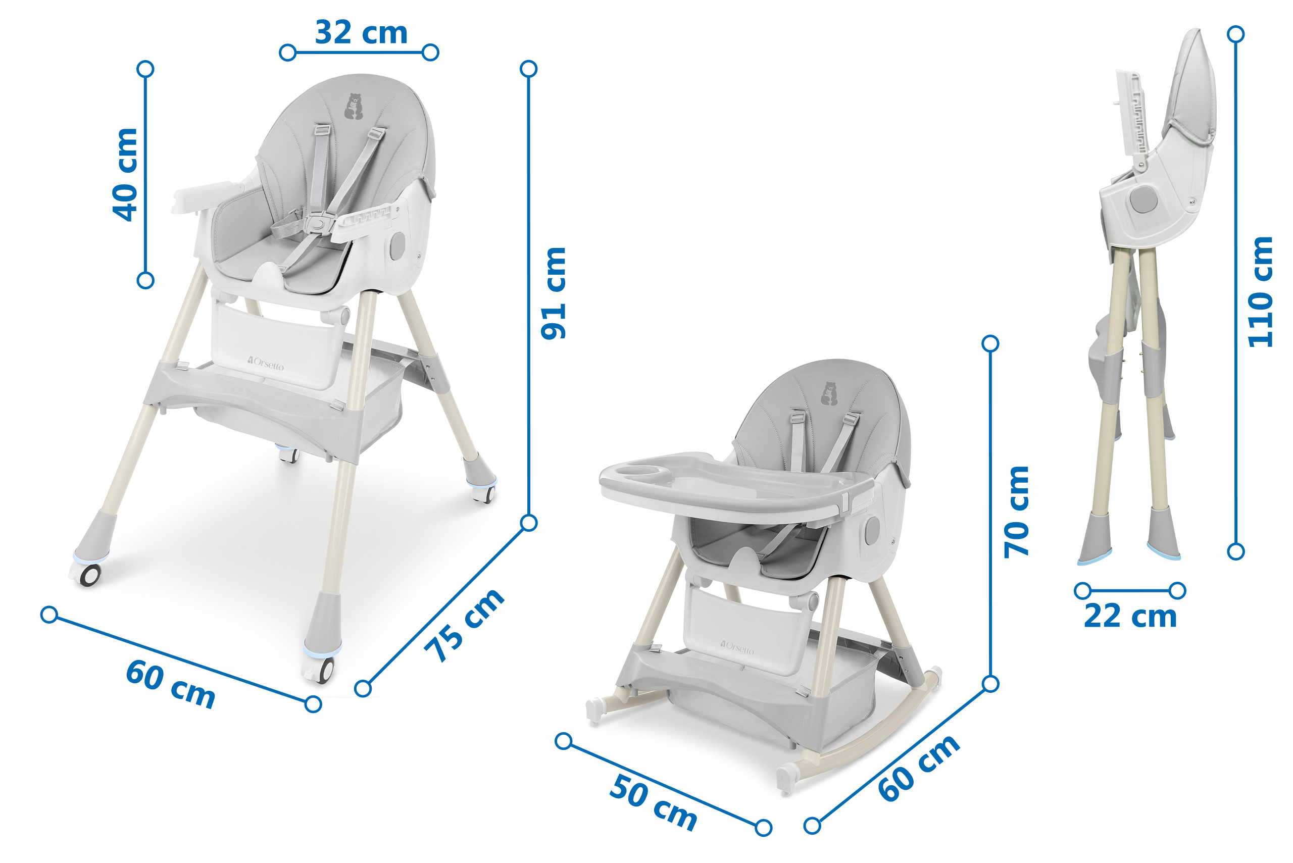 • Wymiary: wysokie krzesełko (91x60x75 cm), bujaczek (70x50x60 cm), złożone (110x60x22 cm).