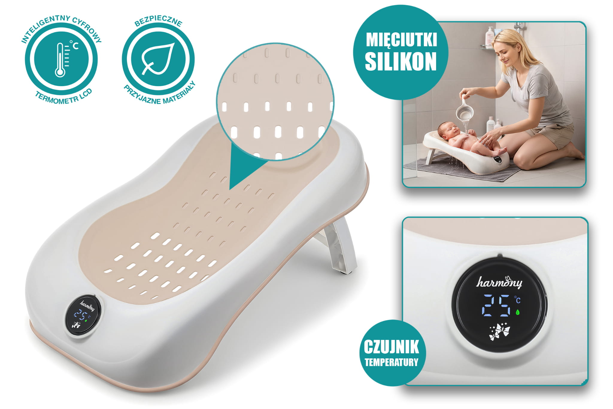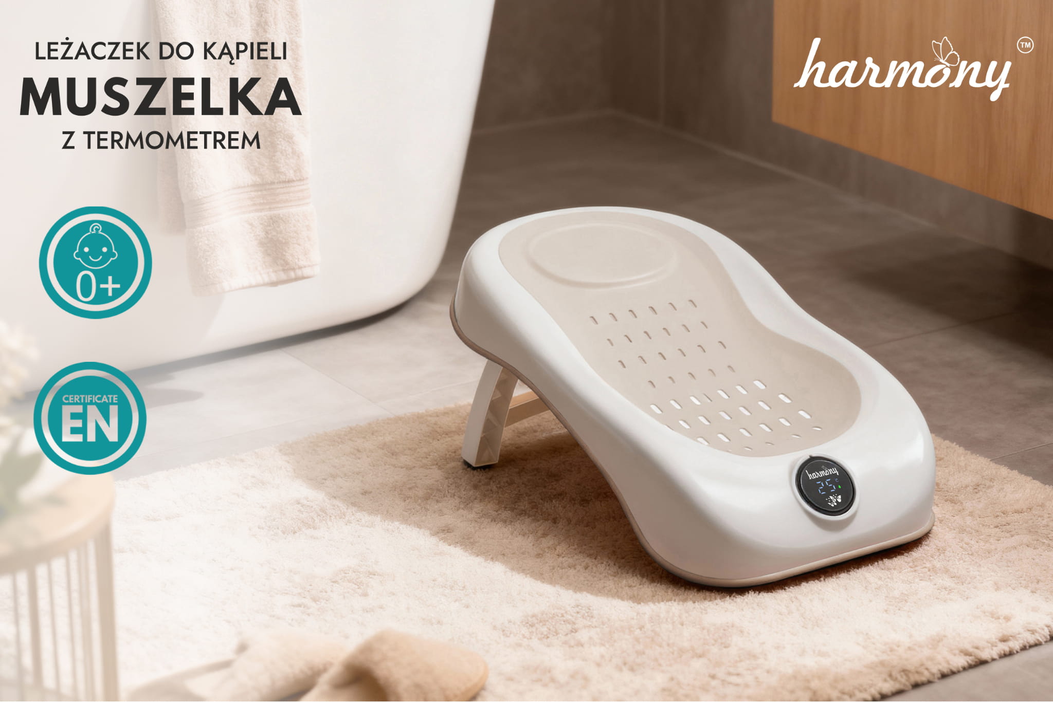 Leżaczek do kąpieli dla niemowląt HARMONY MUSZELKA z termometrem