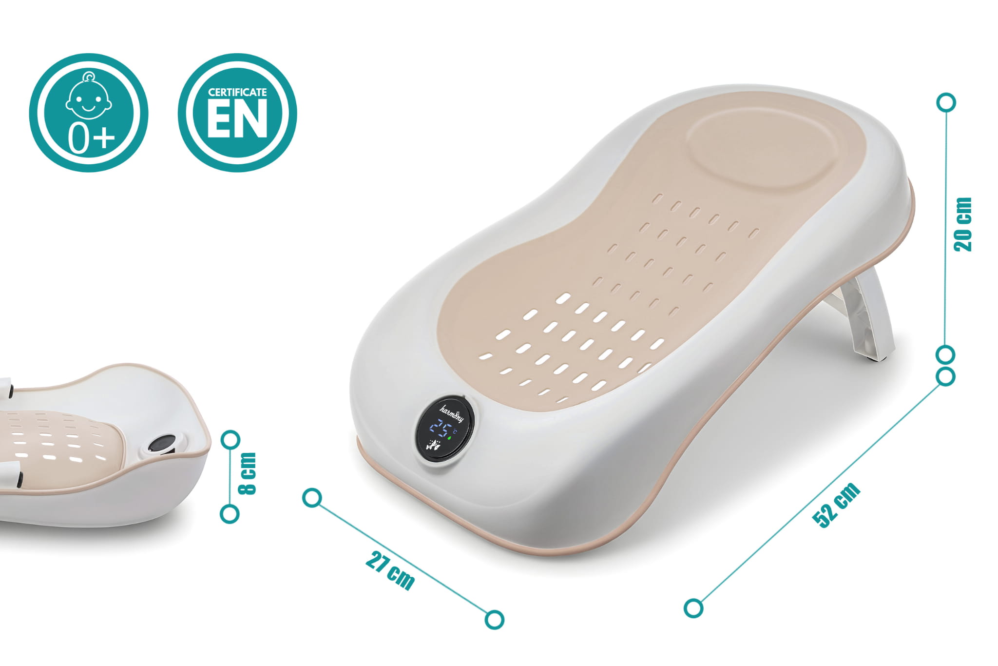 - Wbudowany elektroniczny termometr pozwala na bieżąco kontrolować temperaturę wody, dzięki czemu każda kąpiel jest bezpieczna i komfortowa. Stabilność leżaczka zapewniają antypoślizgowe nóżki, które zapobiegają przesuwaniu się w wanience.