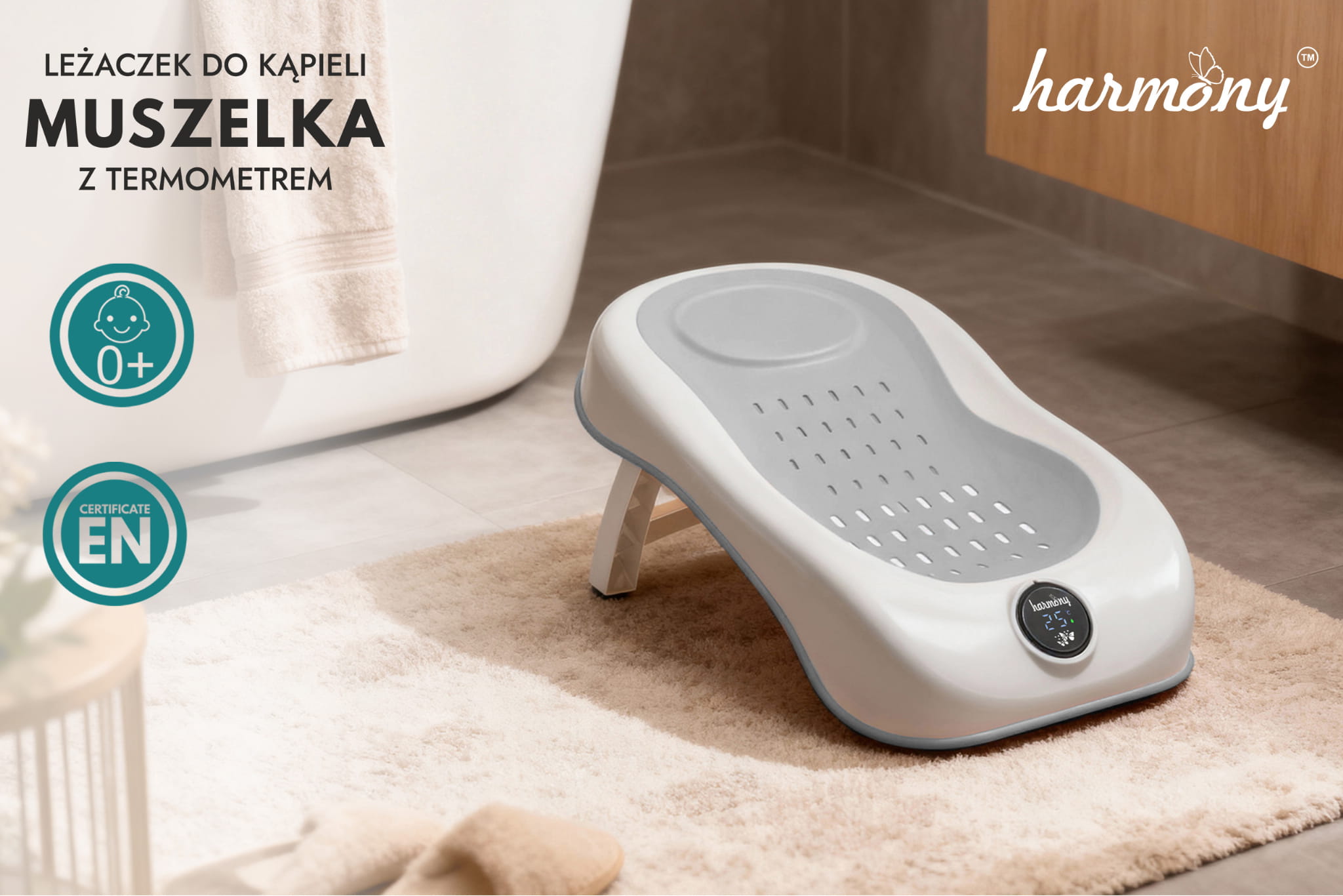 Leżaczek do kąpieli dla niemowląt HARMONY MUSZELKA z termometrem