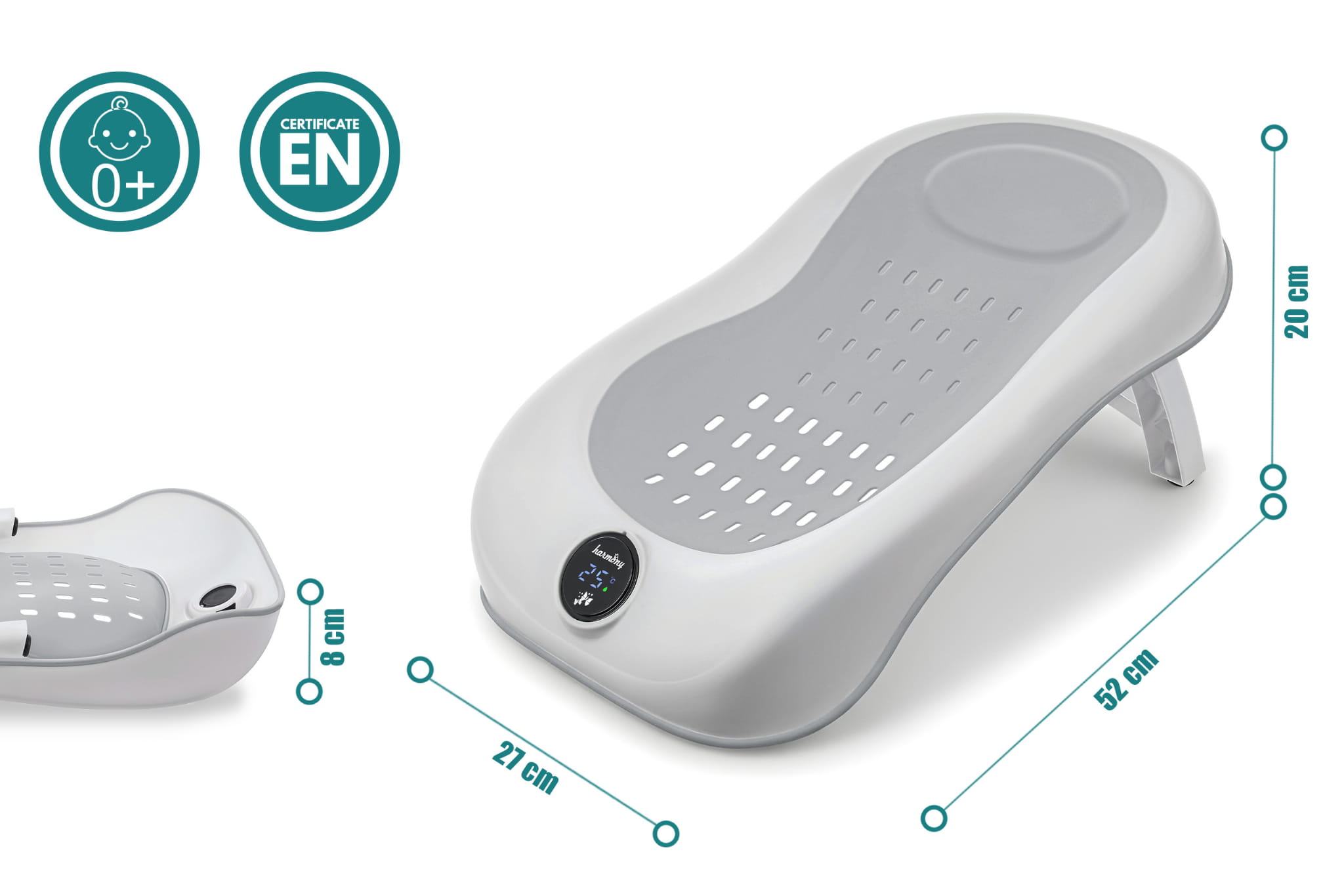 - Wbudowany elektroniczny termometr pozwala na bieżąco kontrolować temperaturę wody, dzięki czemu każda kąpiel jest bezpieczna i komfortowa. Stabilność leżaczka zapewniają antypoślizgowe nóżki, które zapobiegają przesuwaniu się w wanience..