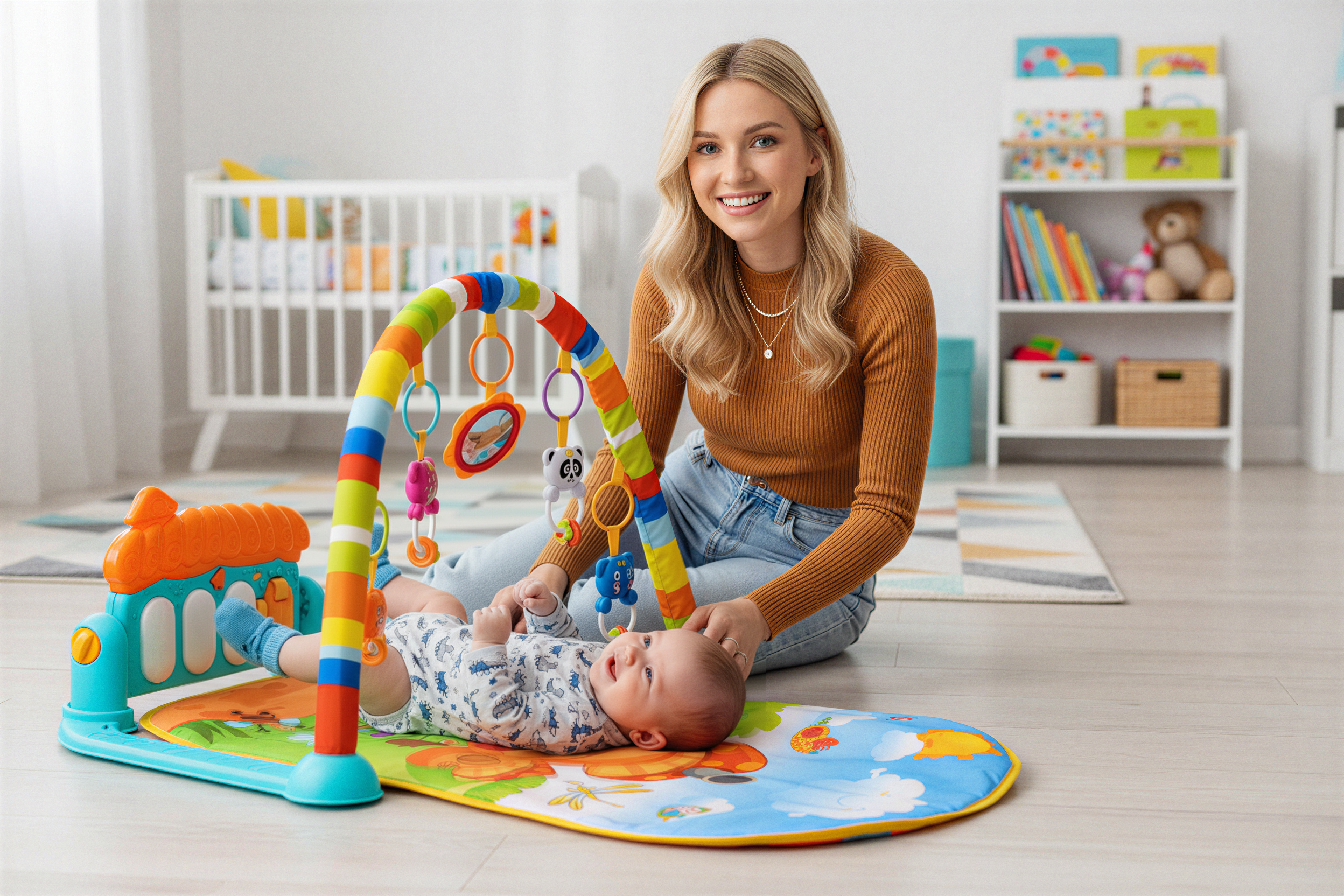 - Maluch leżący na plecach może cieszyć się interaktywną zabawą, uderzając nóżkami w klawisze pianinka, co nie tylko rozwija koordynację ruchową, ale także wprowadza dziecko w świat dźwięków.