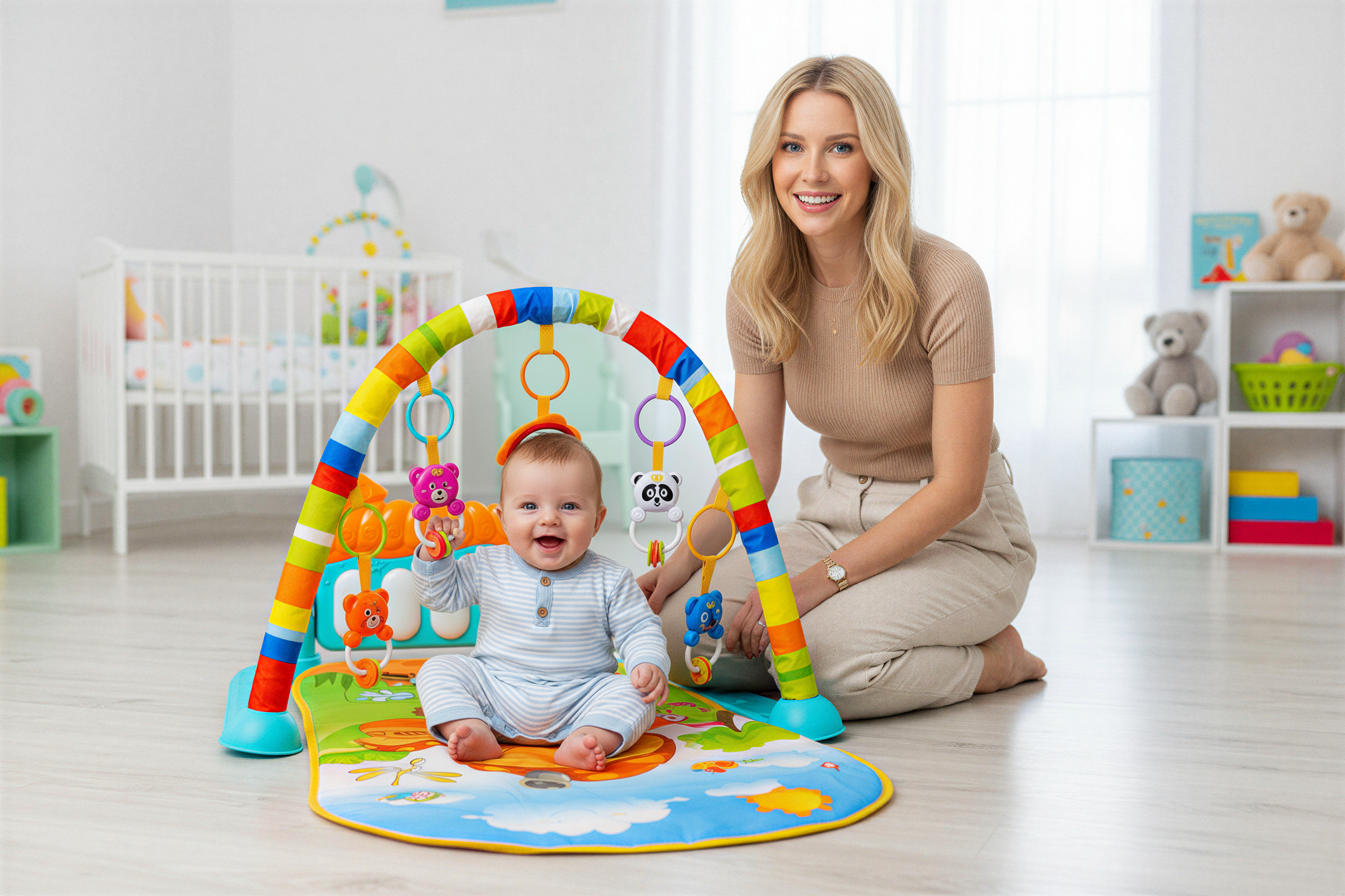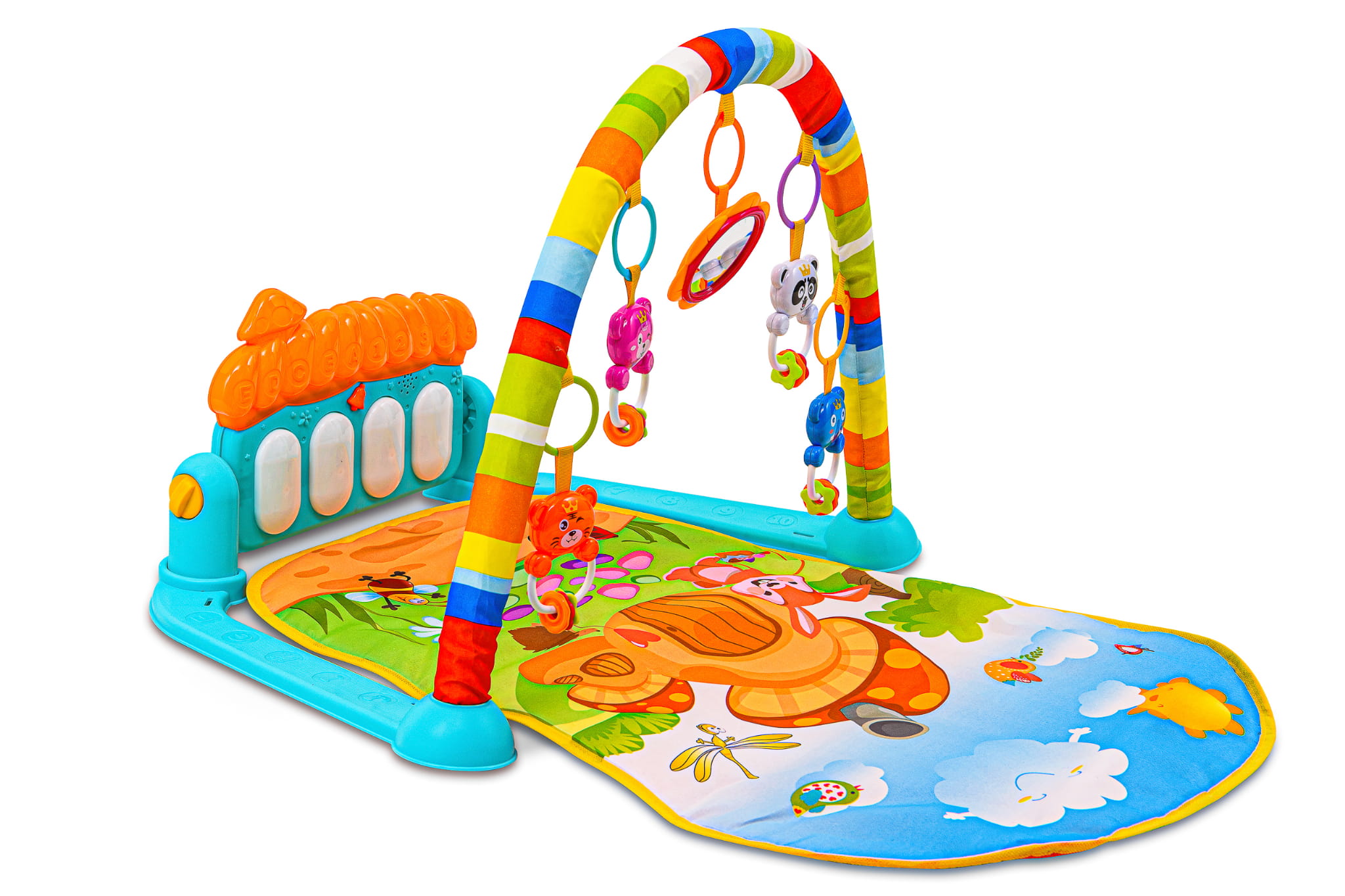 - Gdy zabawki są umieszczone na macie, maluszek może bawić się i ćwiczyć na brzuszku, rozwijając siłę mięśniową i zdolności motoryczne.