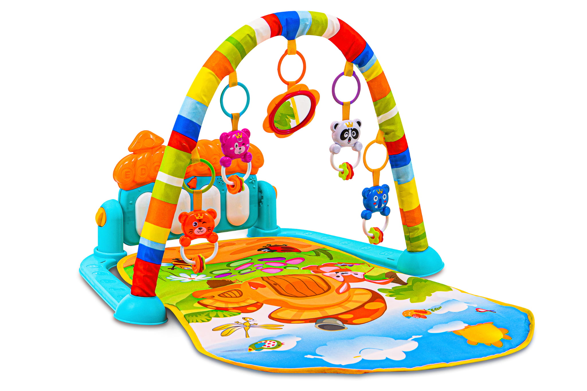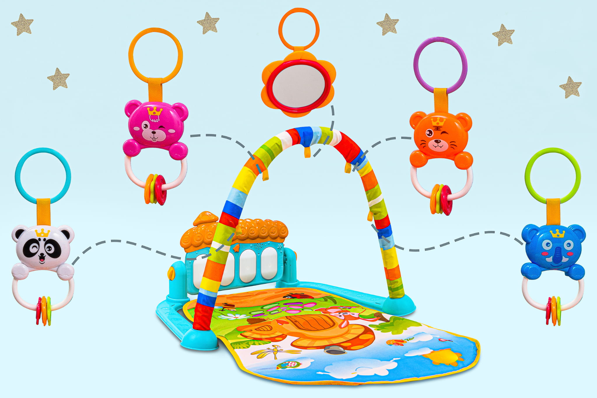 - Cztery plastikowe zawieszki-grzechotki i lusterko nad głową stymulują rozwój motoryki, narządu wzroku i odruchu chwytania.