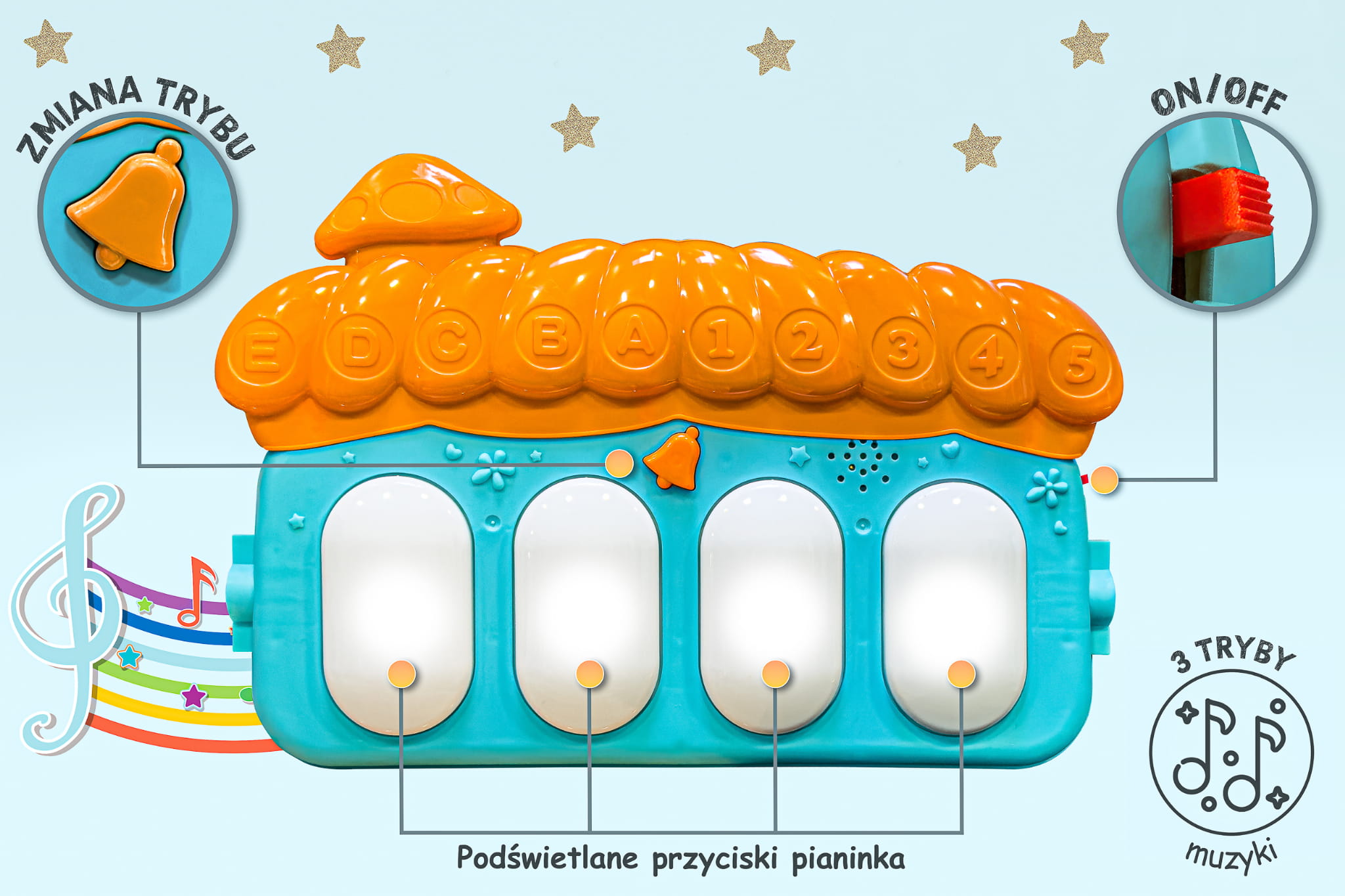 - Trzy różne tryby dźwiękowe, obejmujące dźwięki pianina, krótkie dźwięki oraz unikalne melodie, zachęcają dziecko do interakcji i eksploracji.