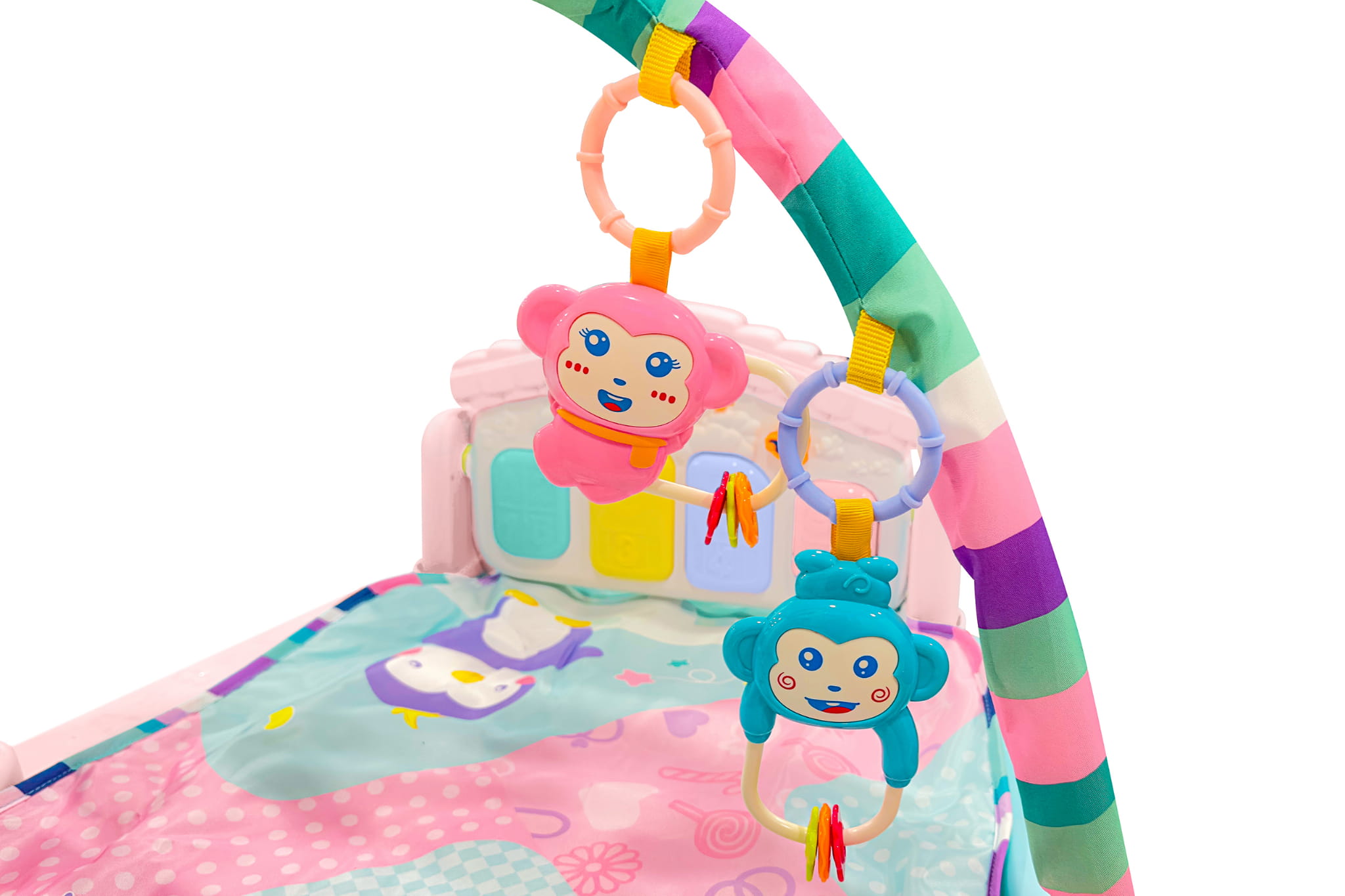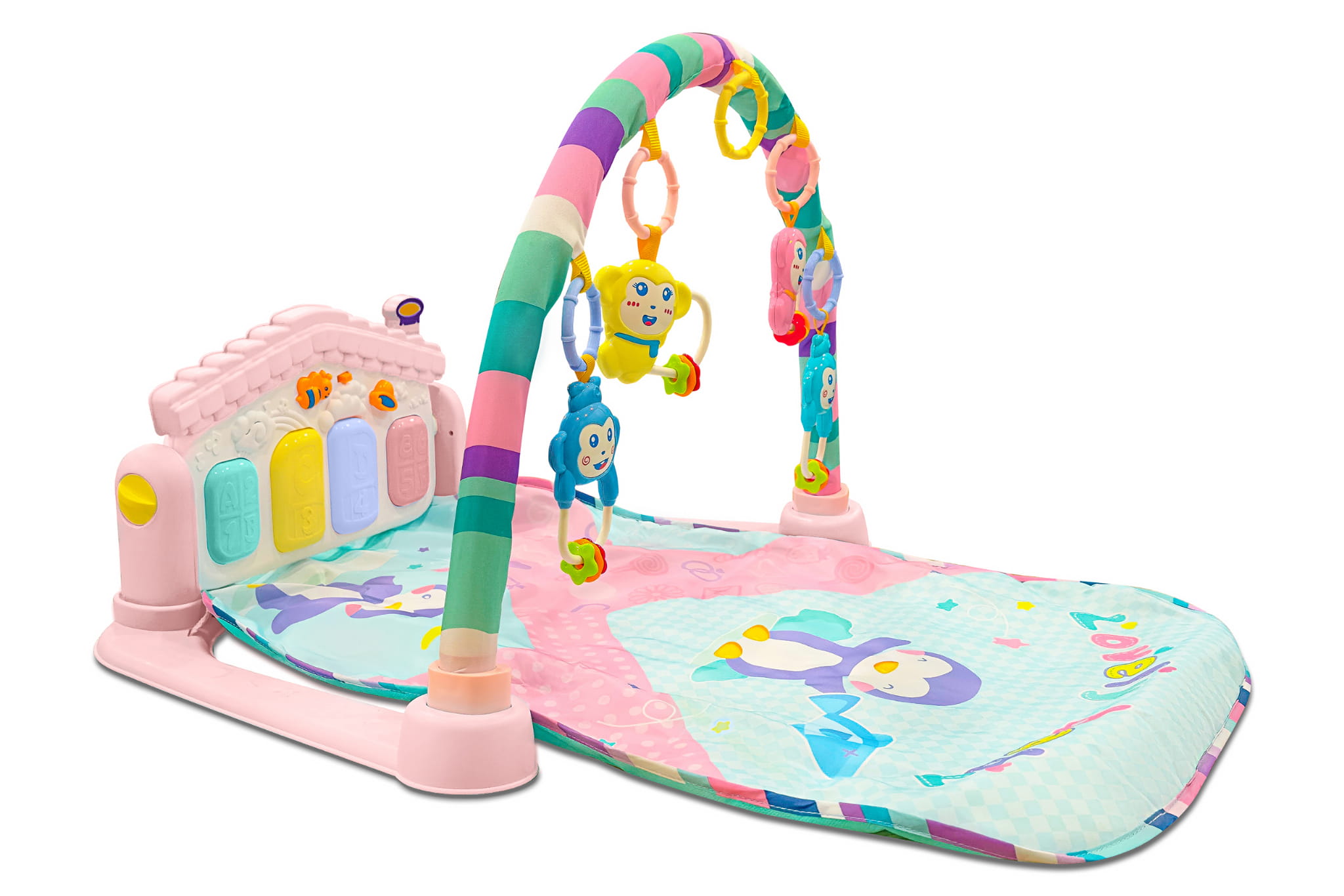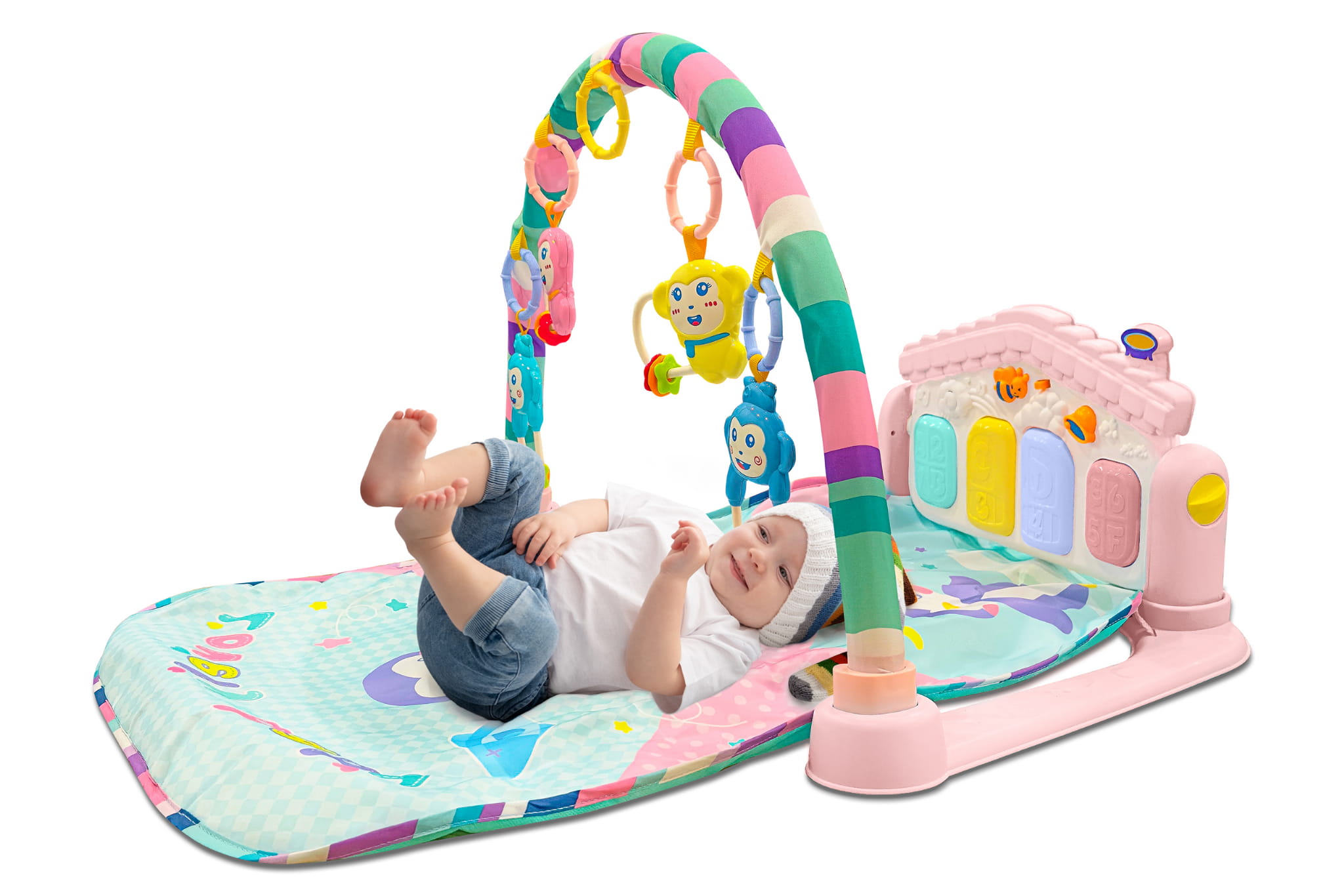 - Gdy zabawki są umieszczone na macie, maluszek może bawić się i ćwiczyć na brzuszku, rozwijając siłę mięśniową i zdolności motoryczne.