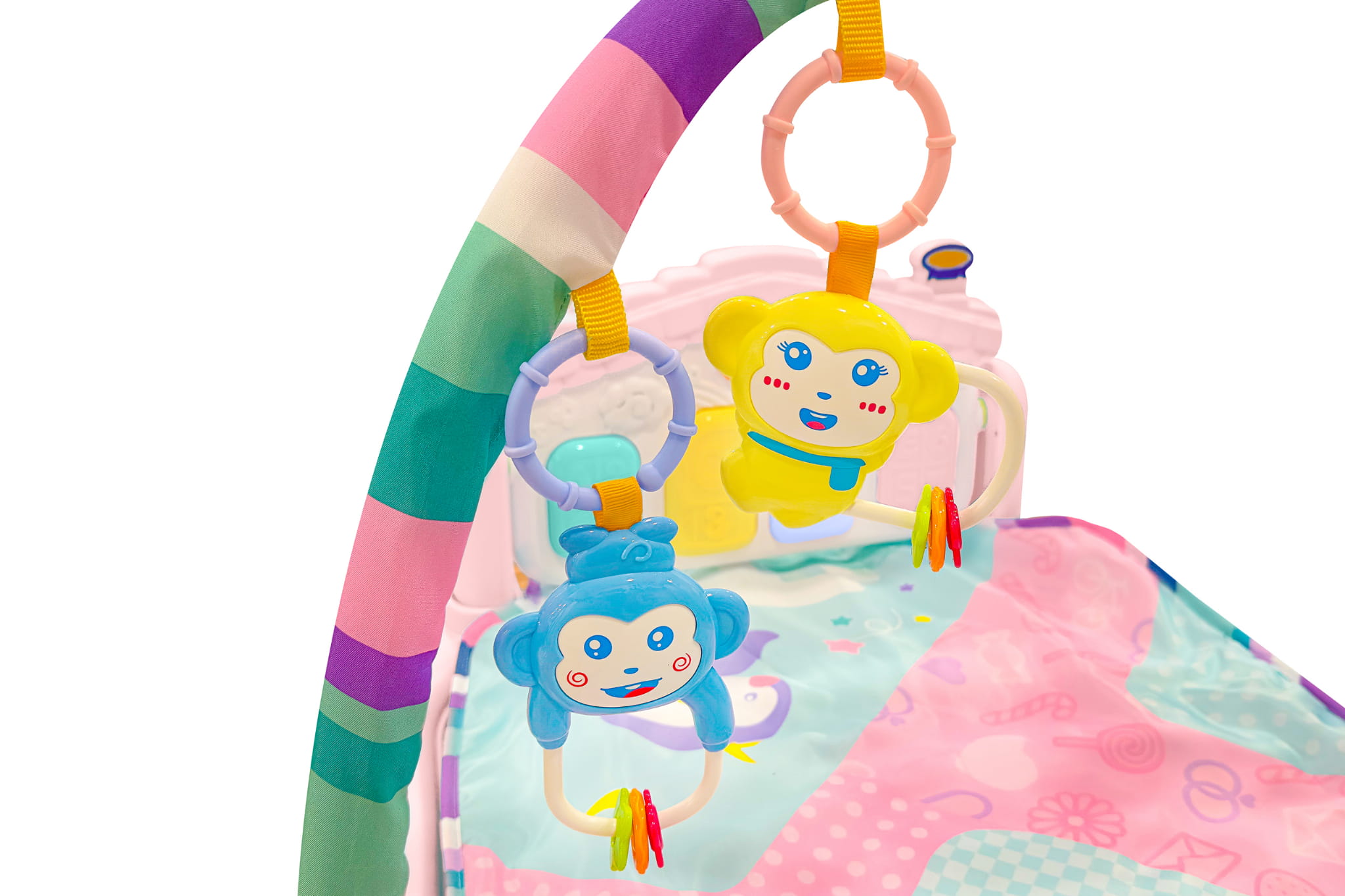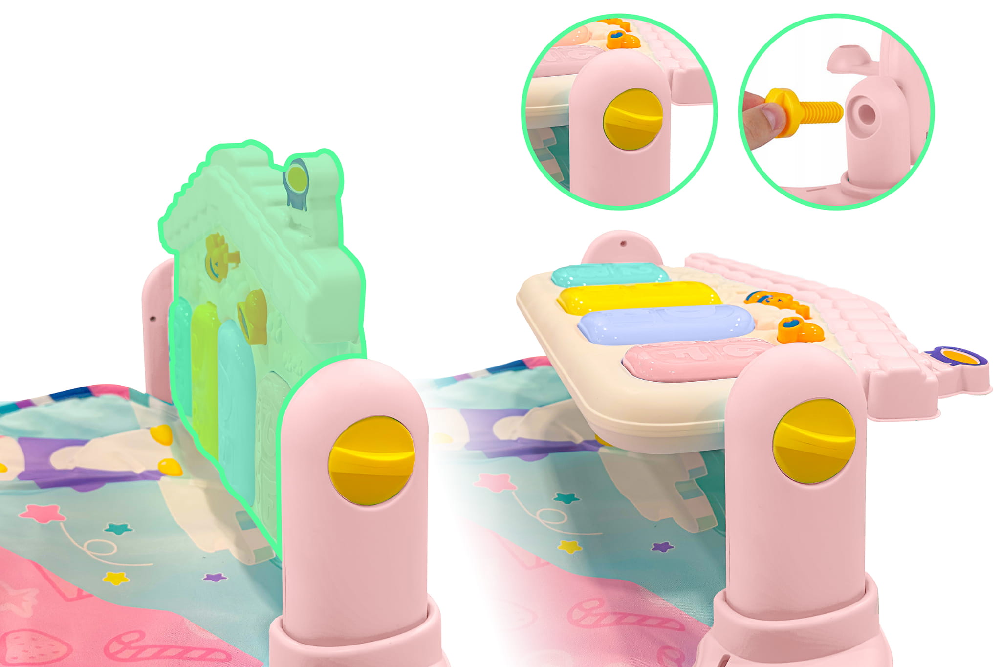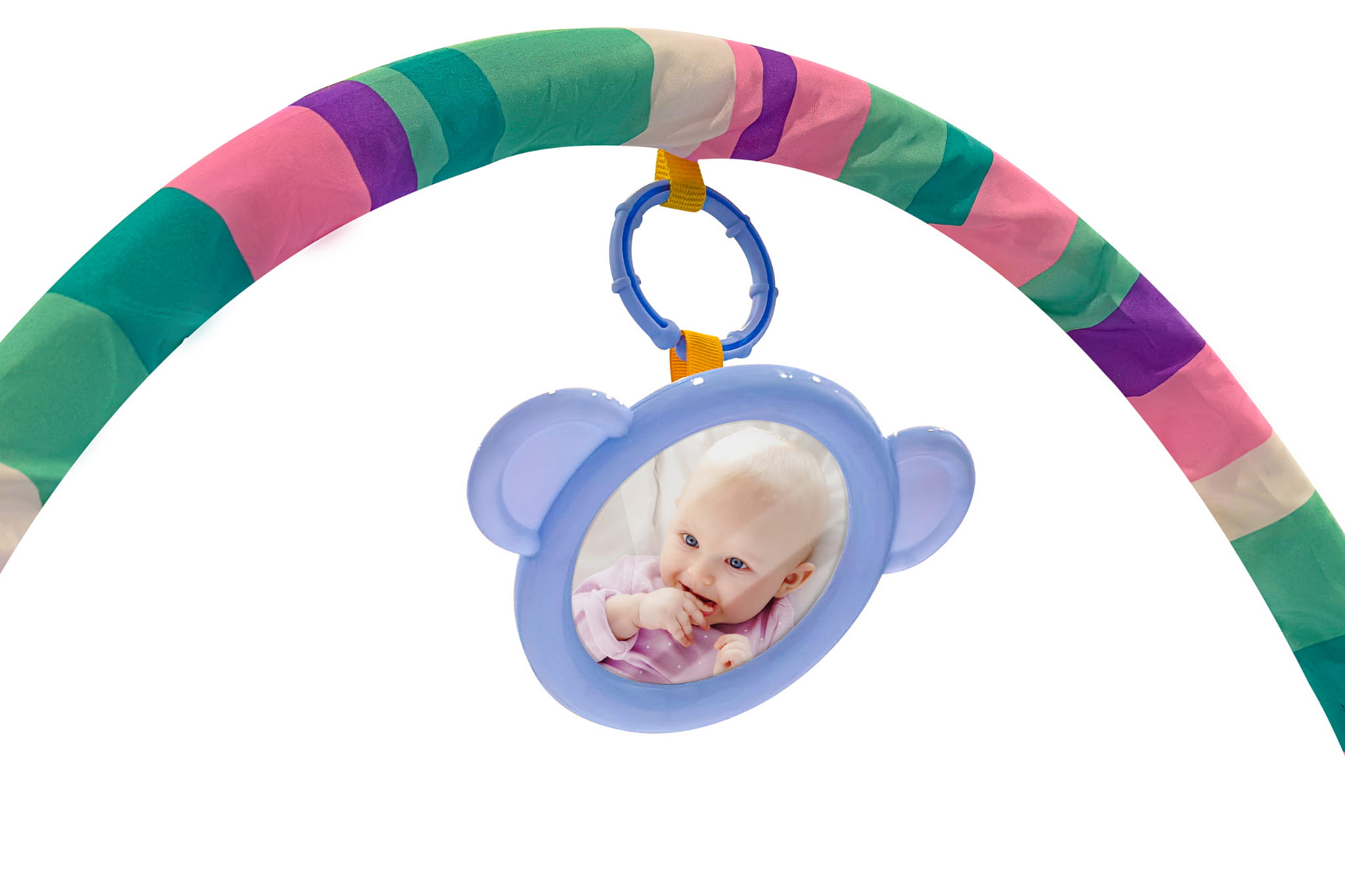 - Cztery plastikowe zawieszki-grzechotki i lusterko nad głową stymulują rozwój motoryki, narządu wzroku i odruchu chwytania.