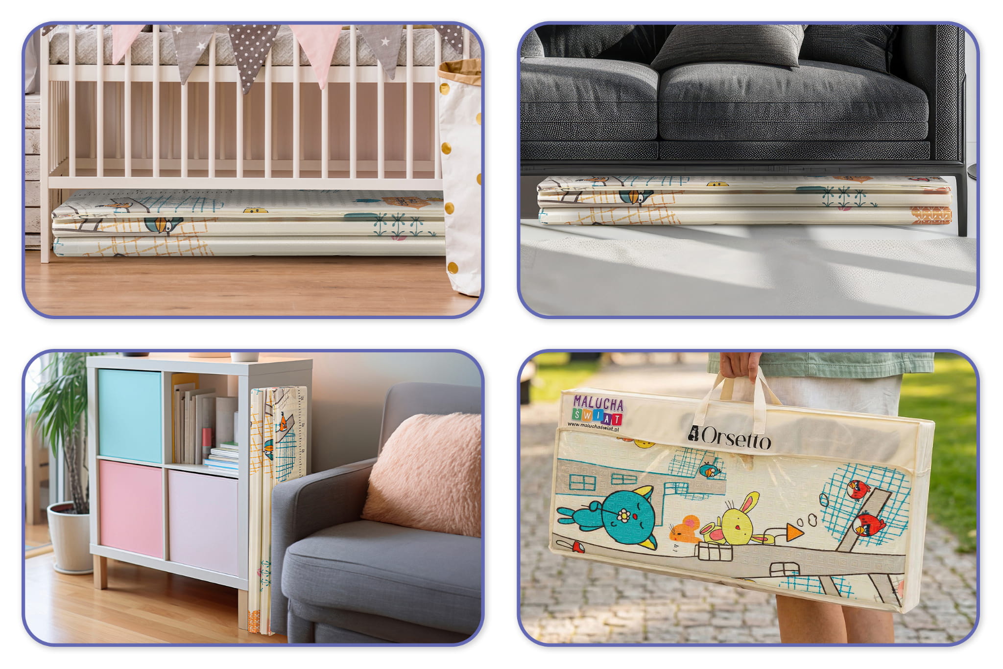 - Dzięki kompaktowemu rozmiarowi, mata może być wygodnie przechowywana np. pod dziecięcym łóżeczkiem.