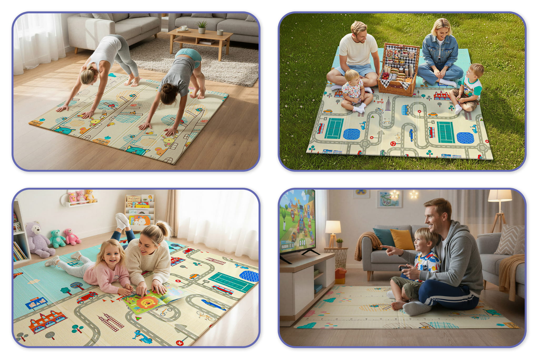 Mata dwustronna została stworzona z myślą o dzieciach w różnym wieku, aby wspierać ich rozwój na każdym etapie. Z jednej strony znajduje się delikatny wzór, idealny dla najmłodszych dzieci.
