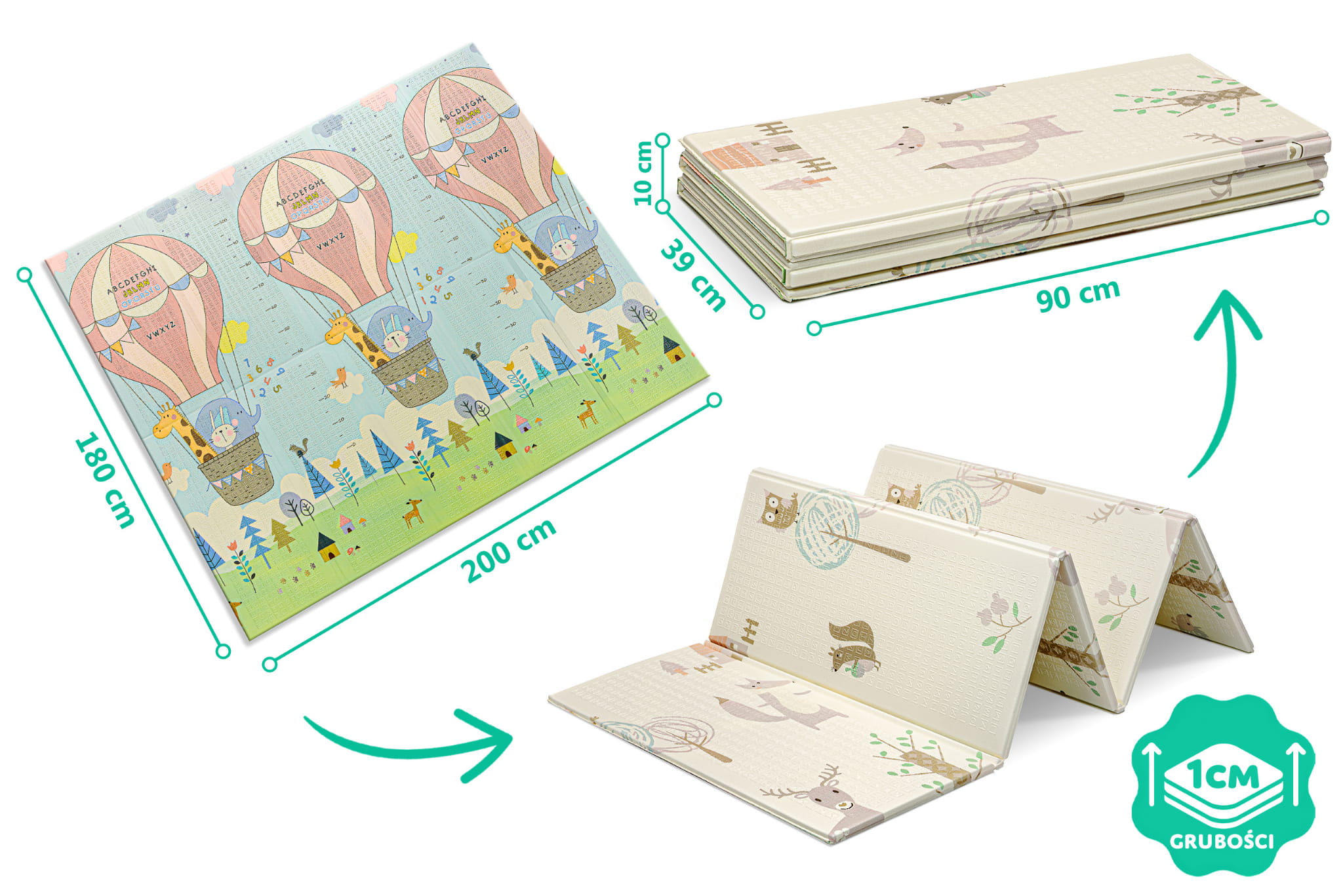 Certyfikowana piankowa mata edukacyjna, składana XXL, o wymiarze 180x200 cm. Mata idealna dla dzieci od pierwszych dni życia!