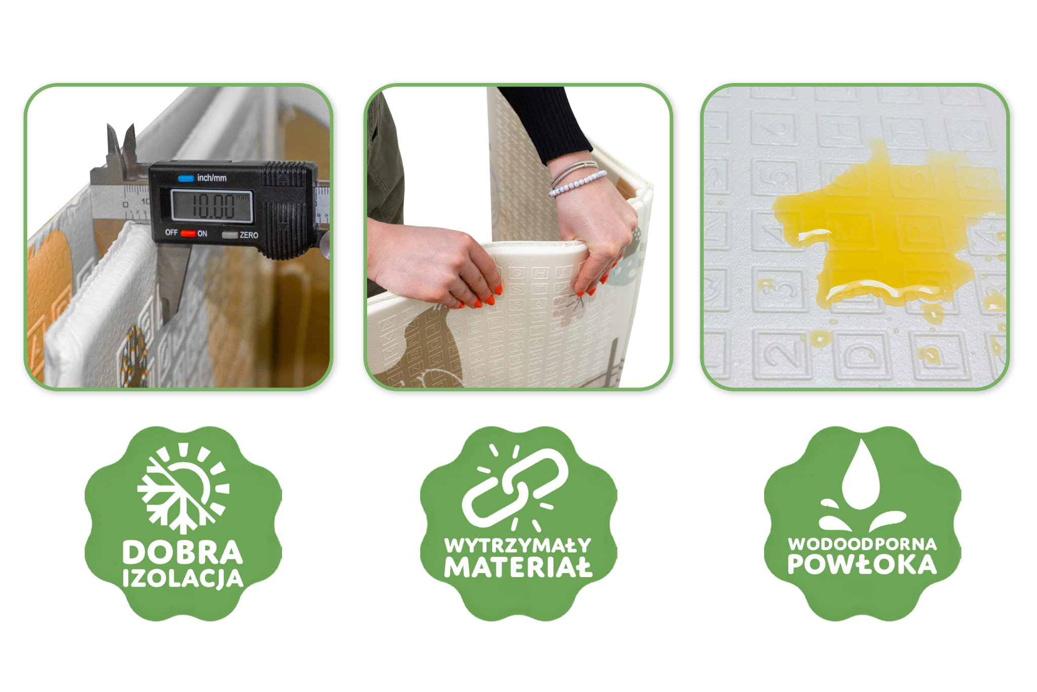 Mata wykonana została z bezzapachowej, najwyższej jakości pianki XPE, bezpiecznej dla Twojego malucha. Dzięki grubej piance (1 cm), mata idealnie amortyzuje dziecko przed upadkiem na twardą podłogę, jak i izoluje przed zimnym podłożem.