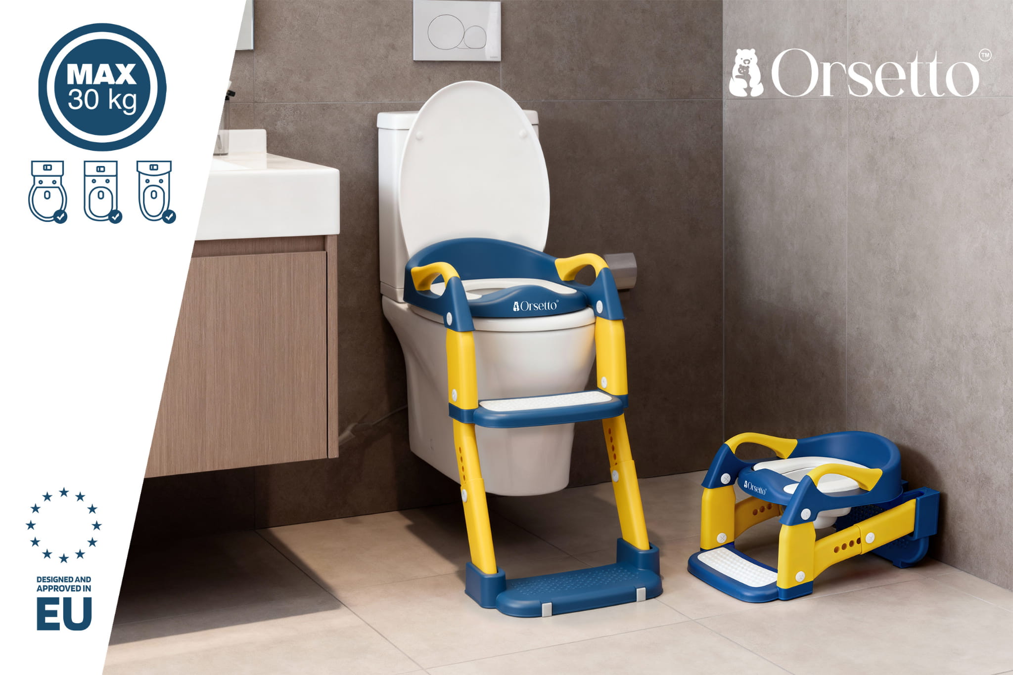 Nakładka ORSETTO została zaprojektowana tak, by idealnie dopasować się do kształtu dziecięcej sylwetki i do większości standardowych sedesów. Montaż i demontaż jest szybki i intuicyjny, a całość jest lekka i łatwa do przenoszenia.