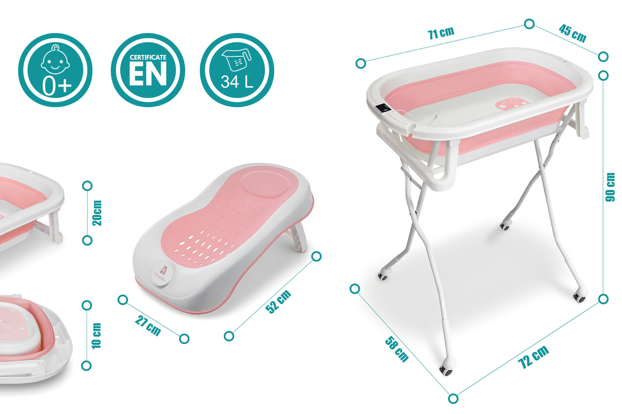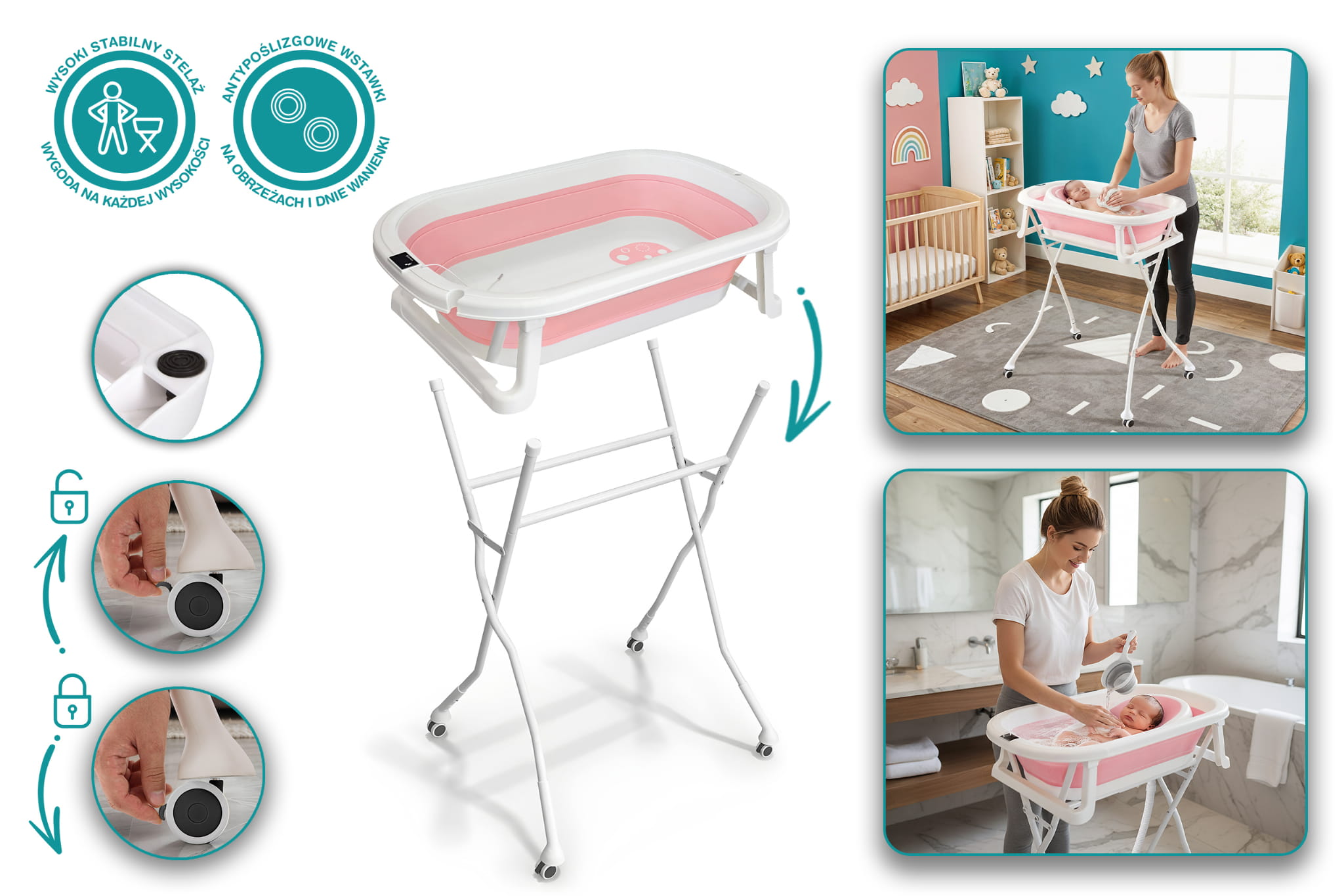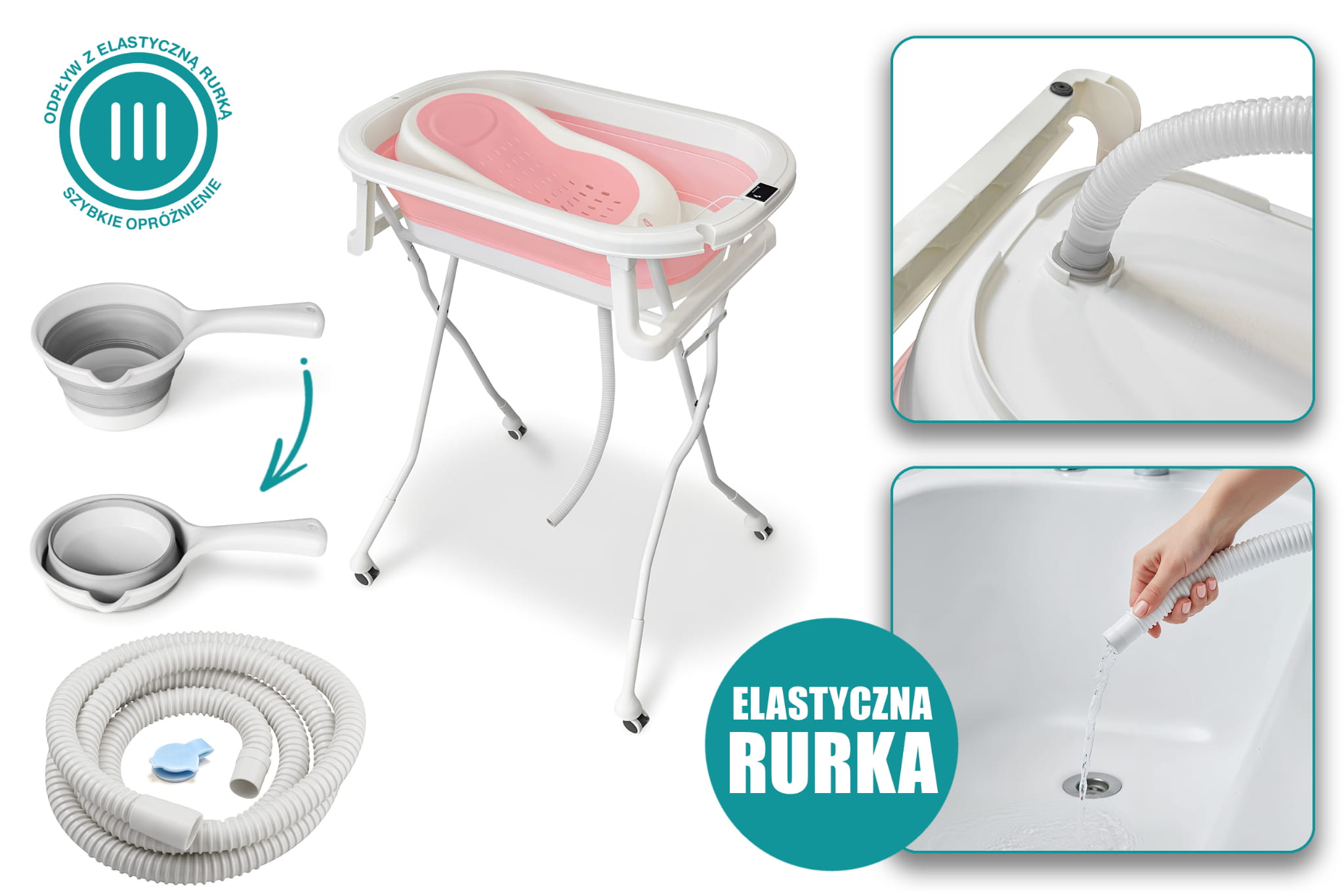 Składana wanienka dziecięca COMFORT z termometrem, stelażem, leżaczkiem i polewaczką - ORSETTO.