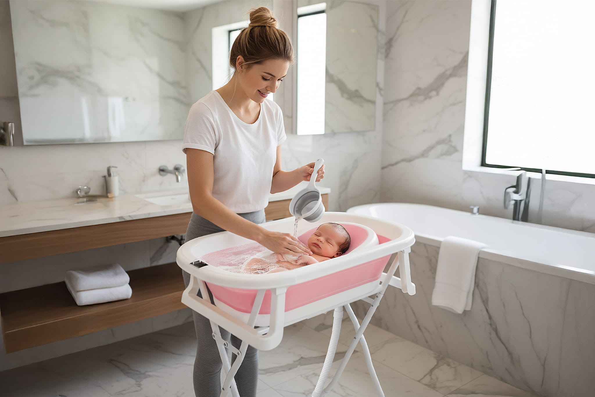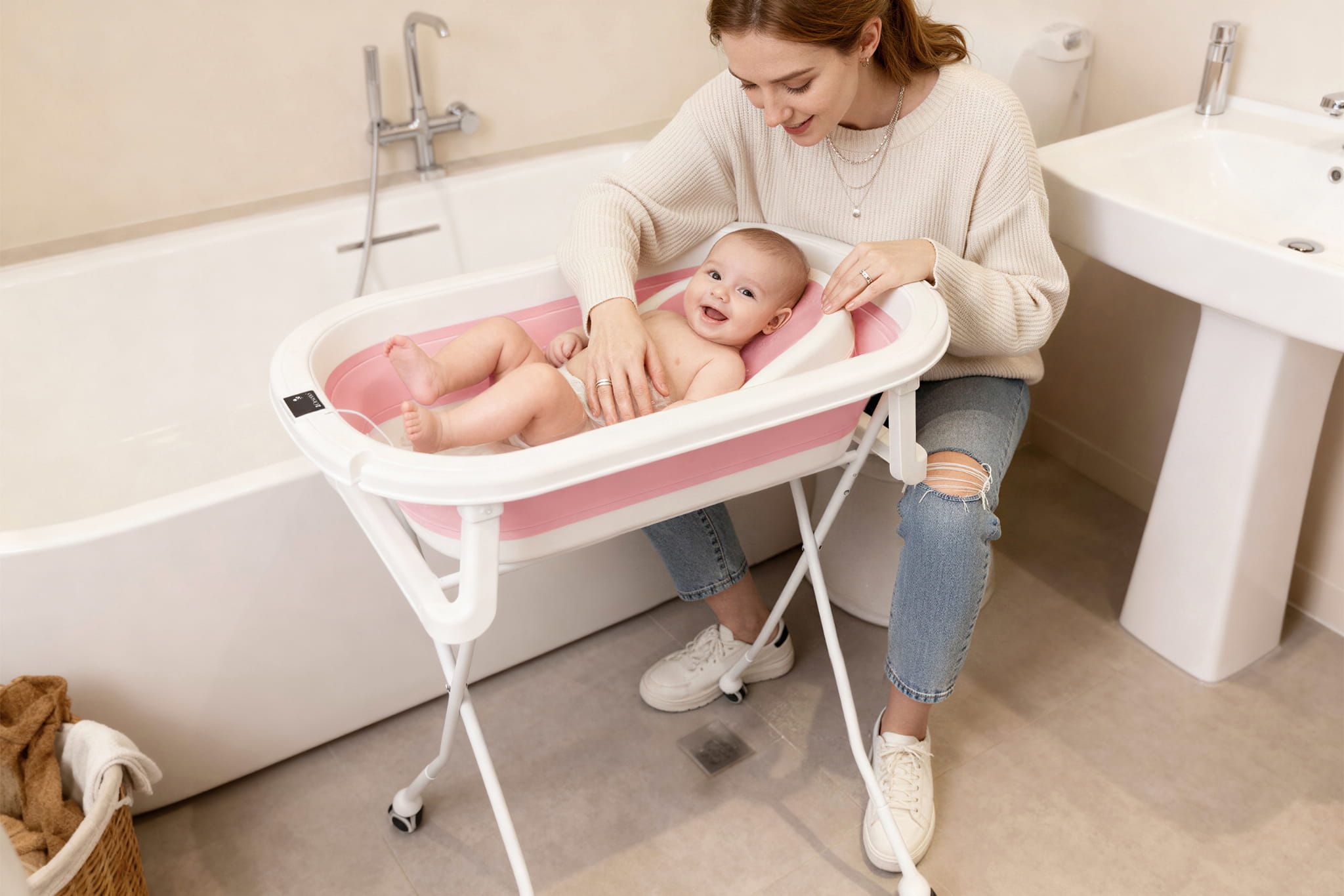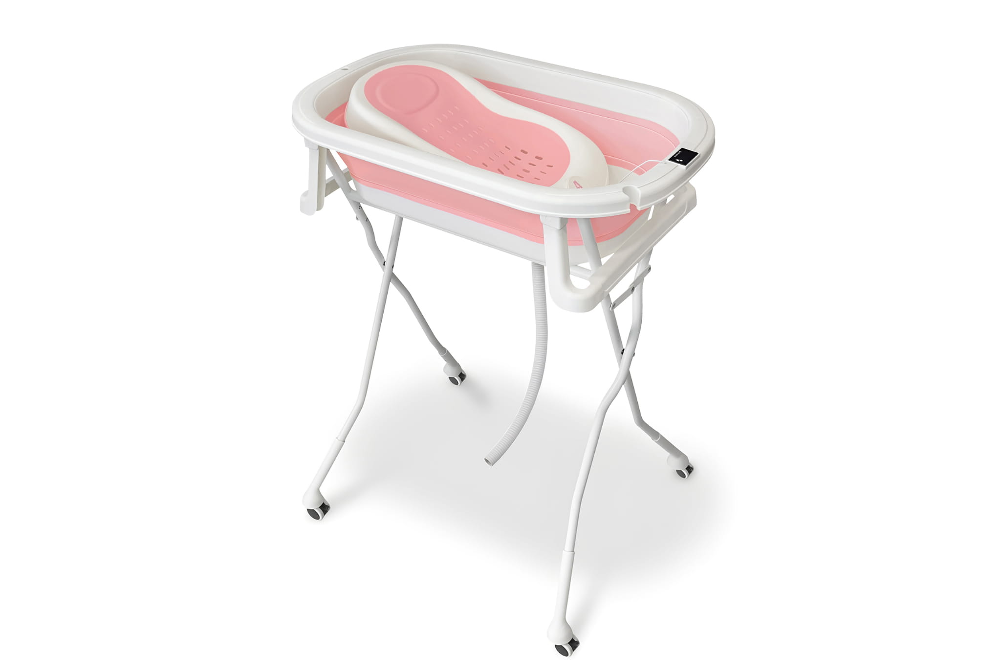 Składana wanienka dziecięca COMFORT z termometrem, stelażem, leżaczkiem i polewaczką - ORSETTO.
