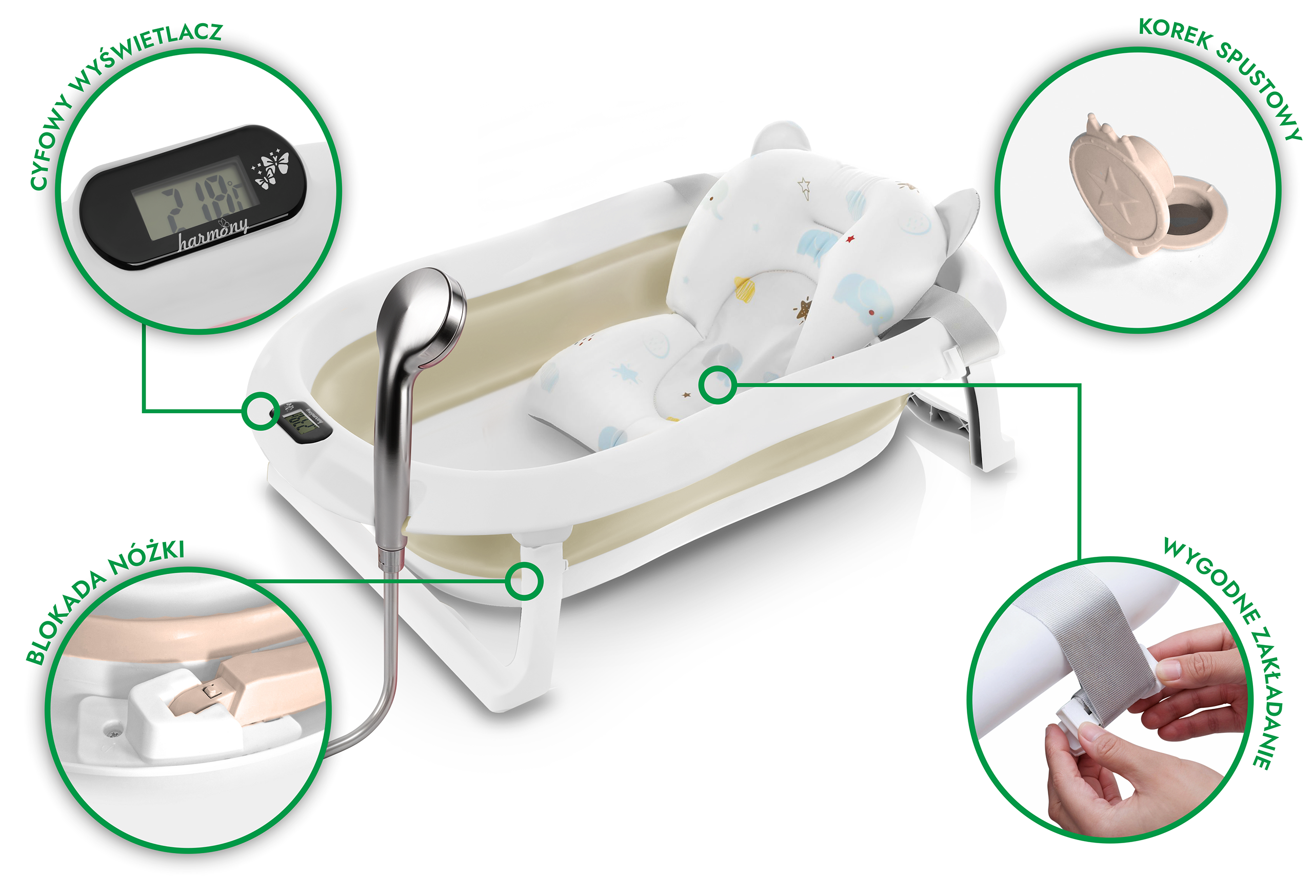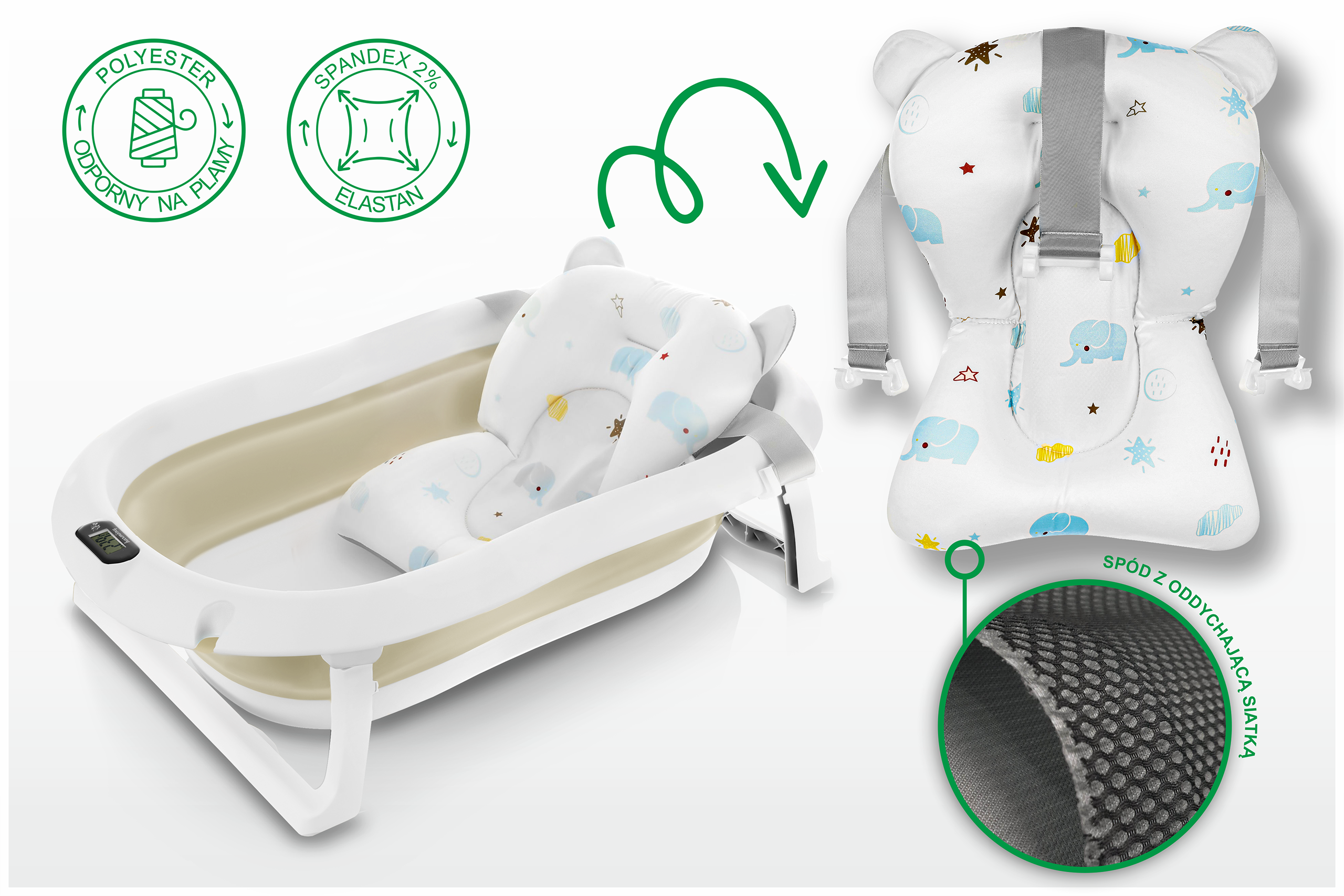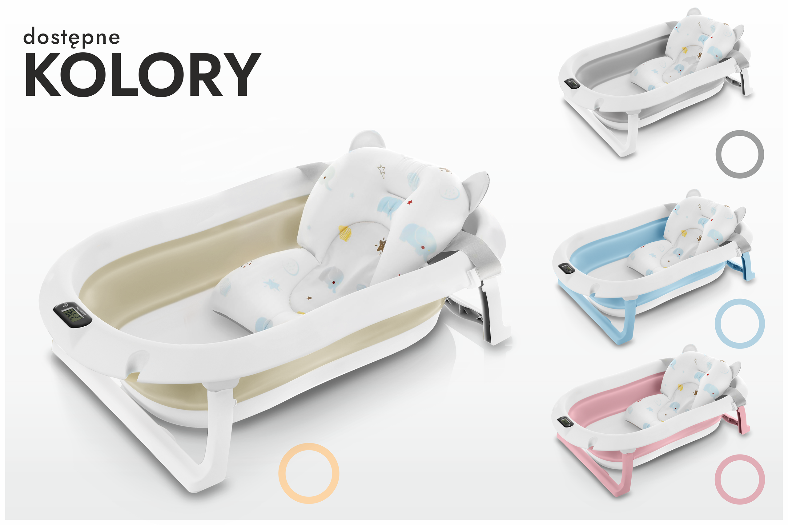 Wanienka została zaprojektowana z myślą o codziennej wygodzie rodziców. Dzięki składanej konstrukcji możesz ją łatwo przechowywać w szafie lub zabrać ze sobą w podróż. Wbudowany termometr pozwala na monitorowanie temperatury wody, co daje pewność, że maluszek będzie kąpany w komfortowych warunkach (przed włożeniem dziecka do wody, zawsze upewnij się, że jej temperatura jest odpowiednia!). Dodatkowa poduszka montowana na pasach pozwala na kąpiel noworodków, stabilizując jego pozycję.