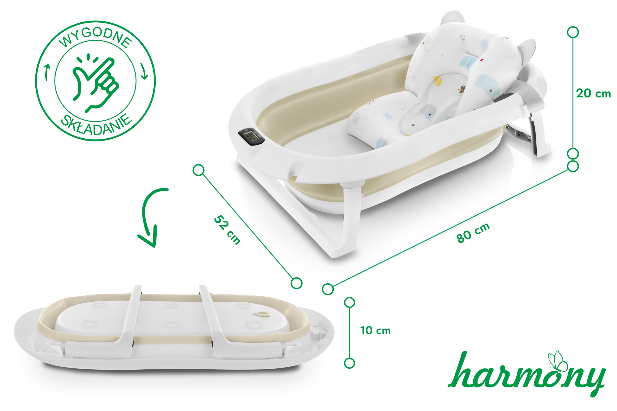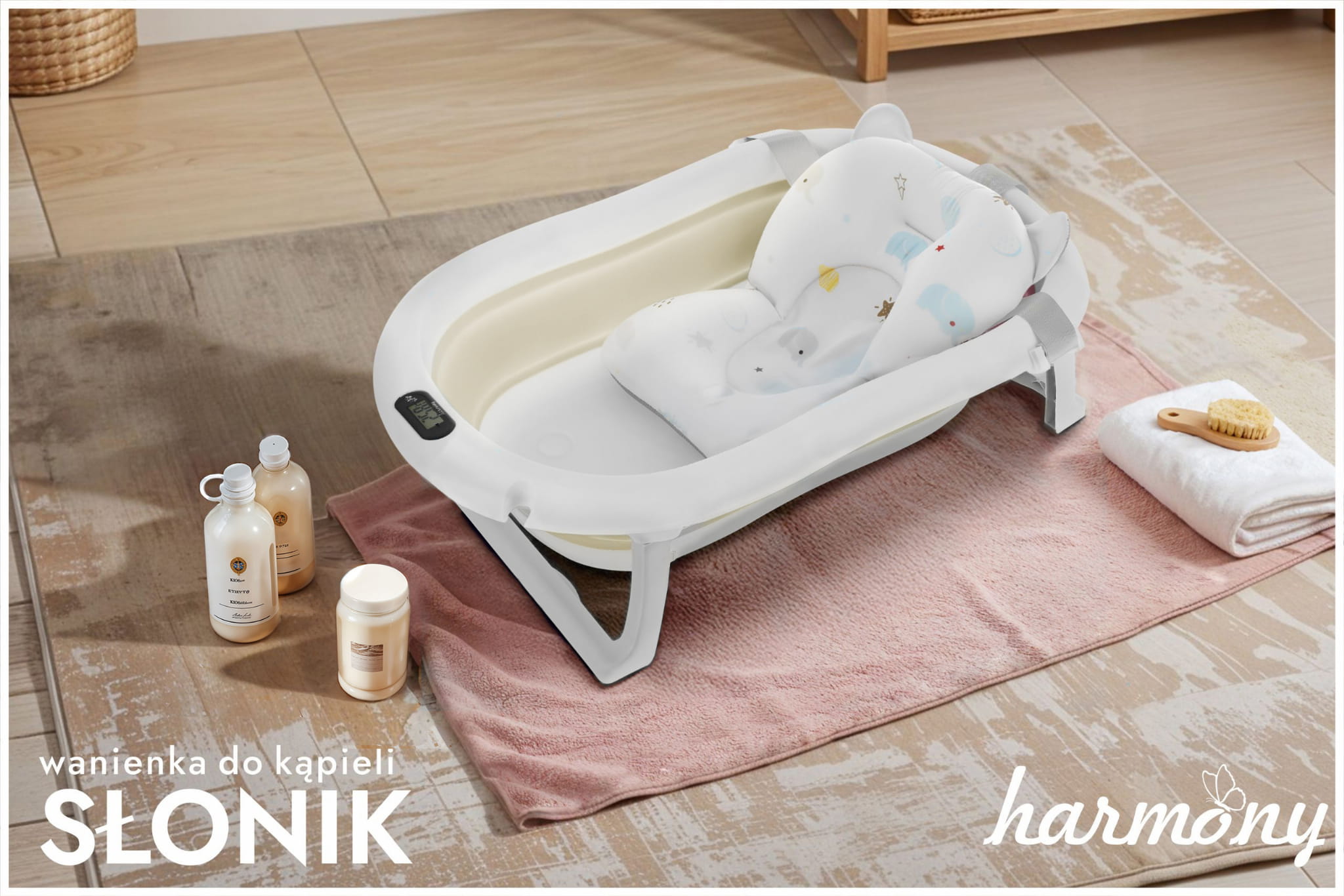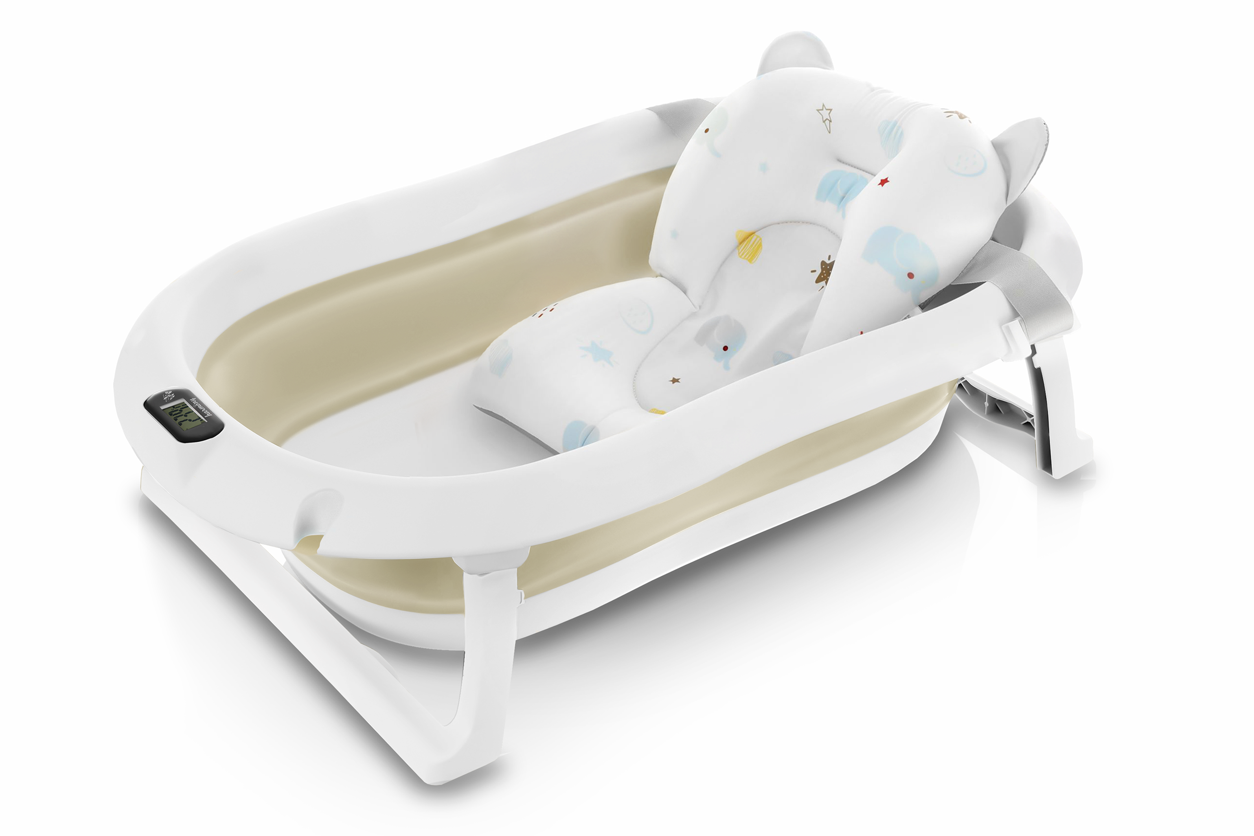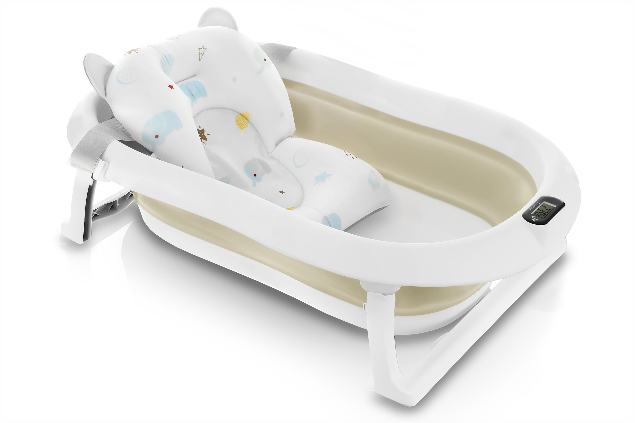 Wanienka została zaprojektowana z myślą o codziennej wygodzie rodziców. Dzięki składanej konstrukcji możesz ją łatwo przechowywać w szafie lub zabrać ze sobą w podróż. Wbudowany termometr pozwala na monitorowanie temperatury wody, co daje pewność, że maluszek będzie kąpany w komfortowych warunkach (przed włożeniem dziecka do wody, zawsze upewnij się, że jej temperatura jest odpowiednia!). Dodatkowa poduszka montowana na pasach pozwala na kąpiel noworodków, stabilizując jego pozycję.