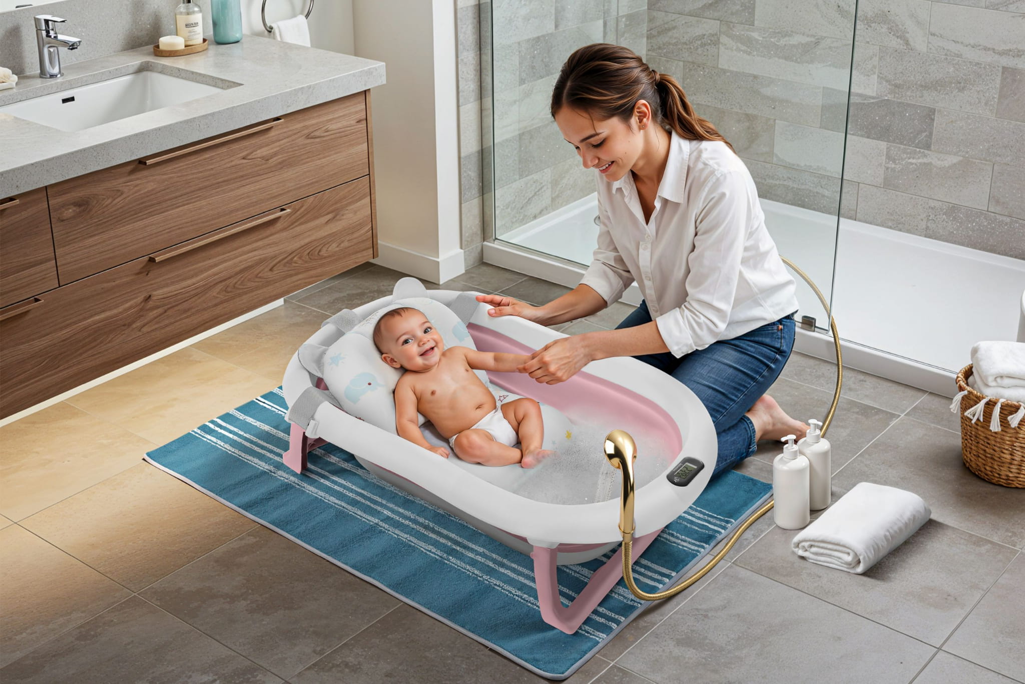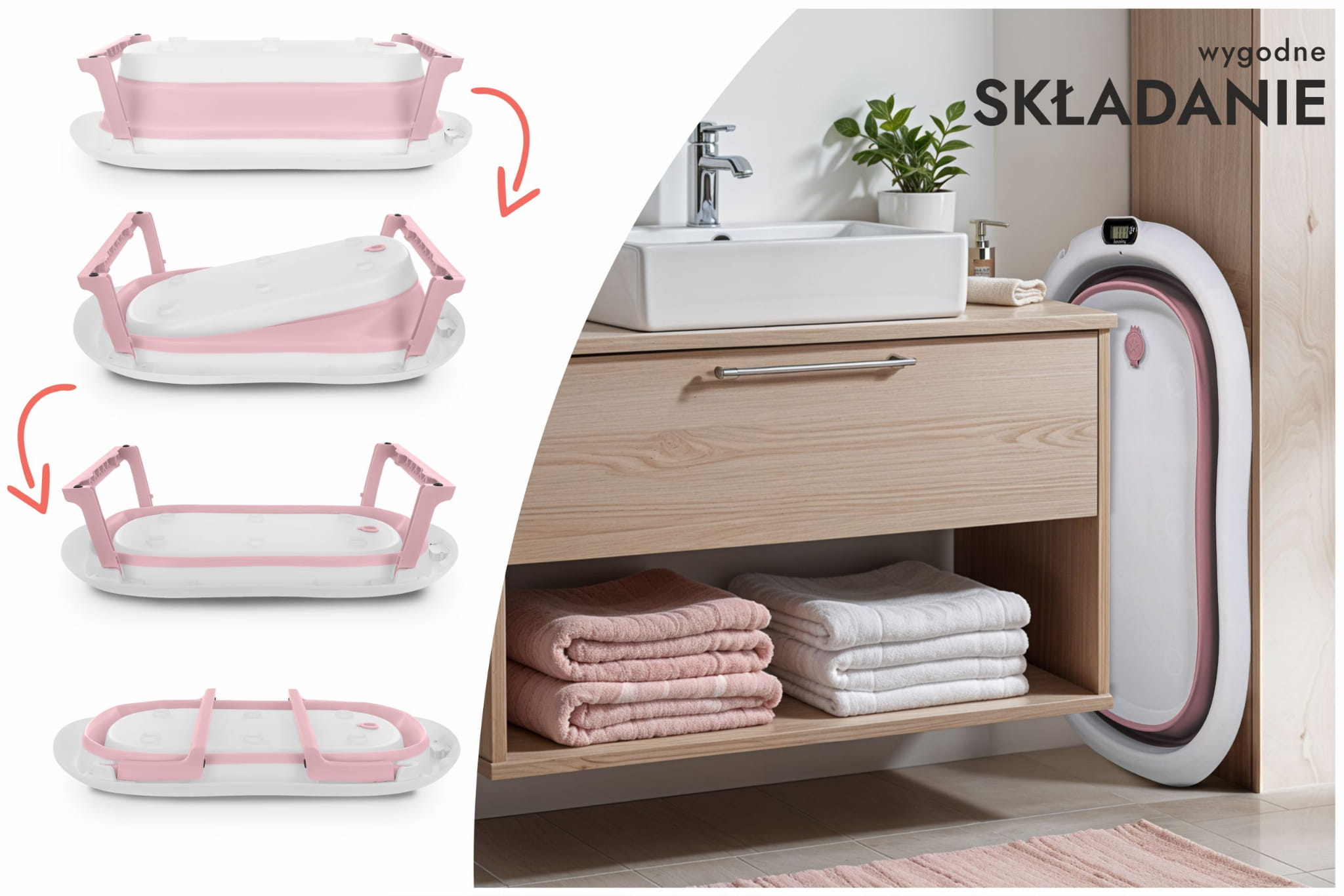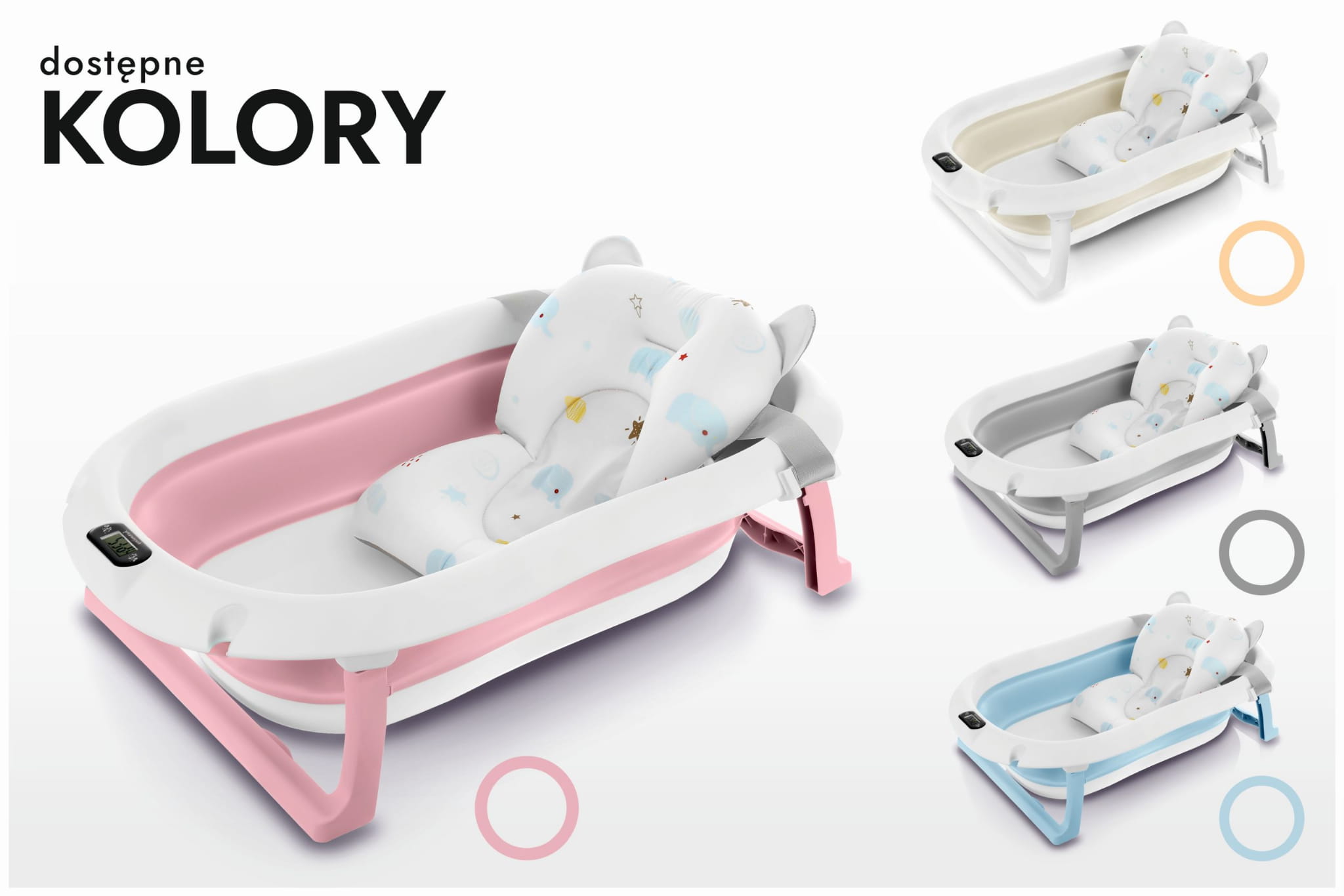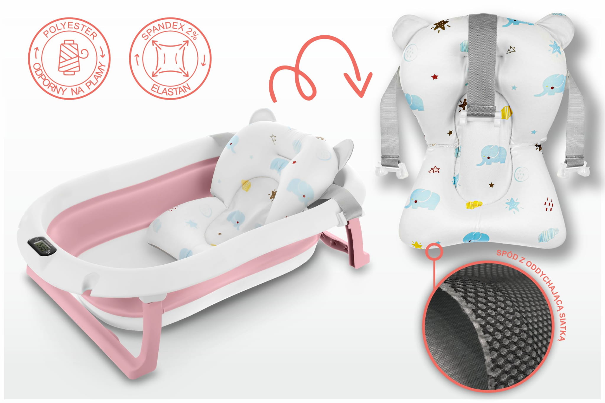 Wanienka została zaprojektowana z myślą o codziennej wygodzie rodziców. Dzięki składanej konstrukcji możesz ją łatwo przechowywać w szafie lub zabrać ze sobą w podróż. Wbudowany termometr pozwala na monitorowanie temperatury wody, co daje pewność, że maluszek będzie kąpany w komfortowych warunkach (przed włożeniem dziecka do wody, zawsze upewnij się, że jej temperatura jest odpowiednia!). Dodatkowa poduszka montowana na pasach pozwala na kąpiel noworodków, stabilizując jego pozycję.