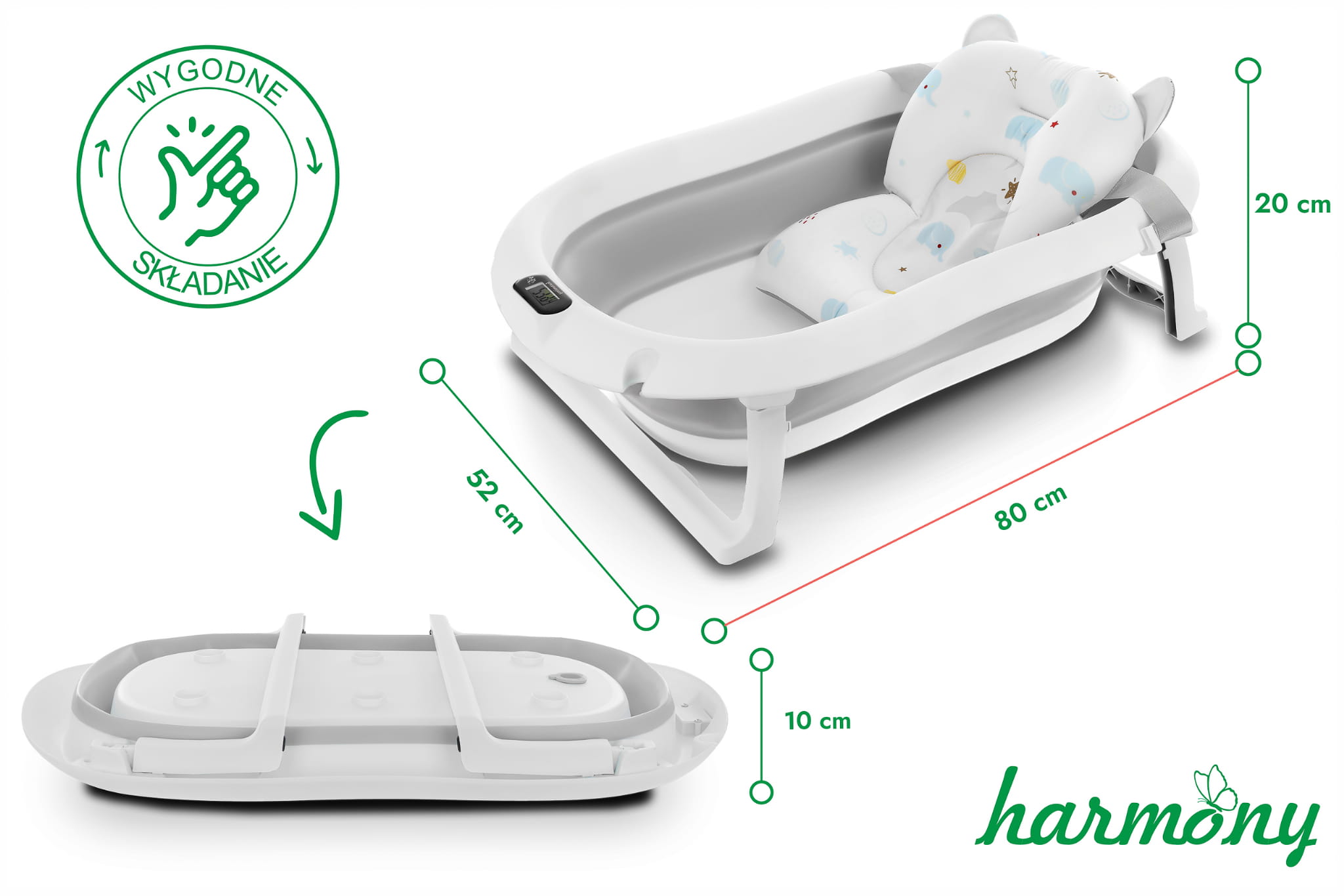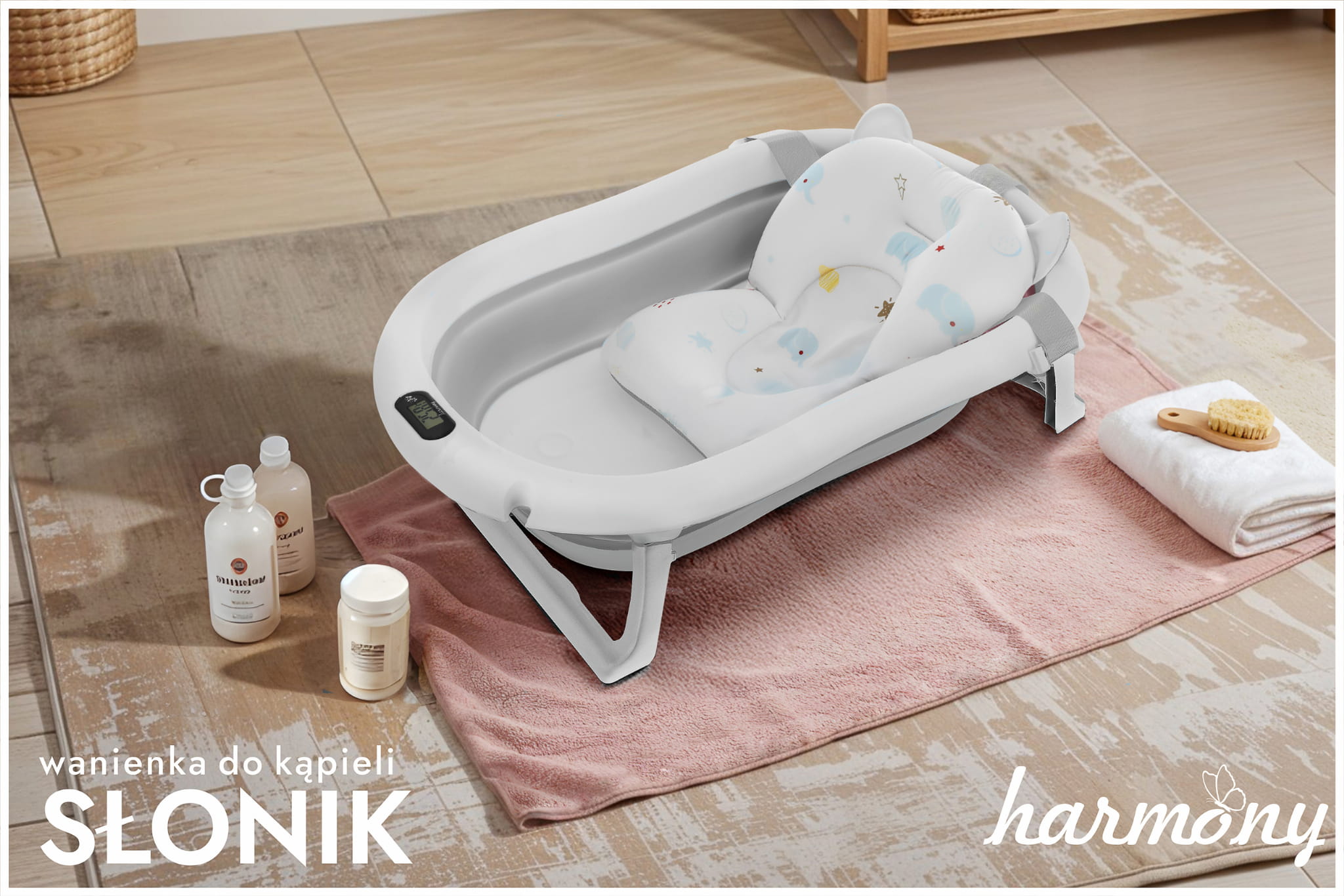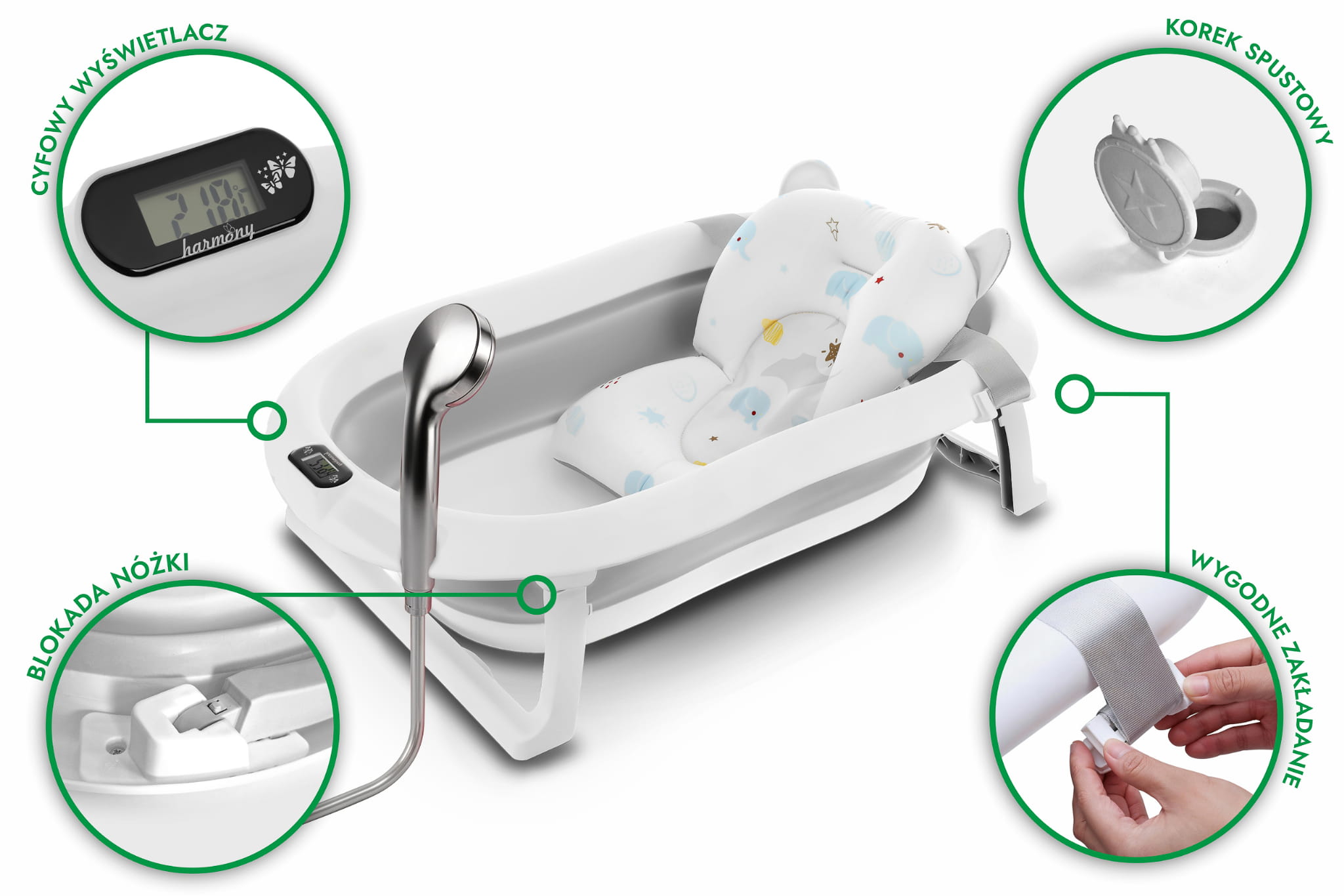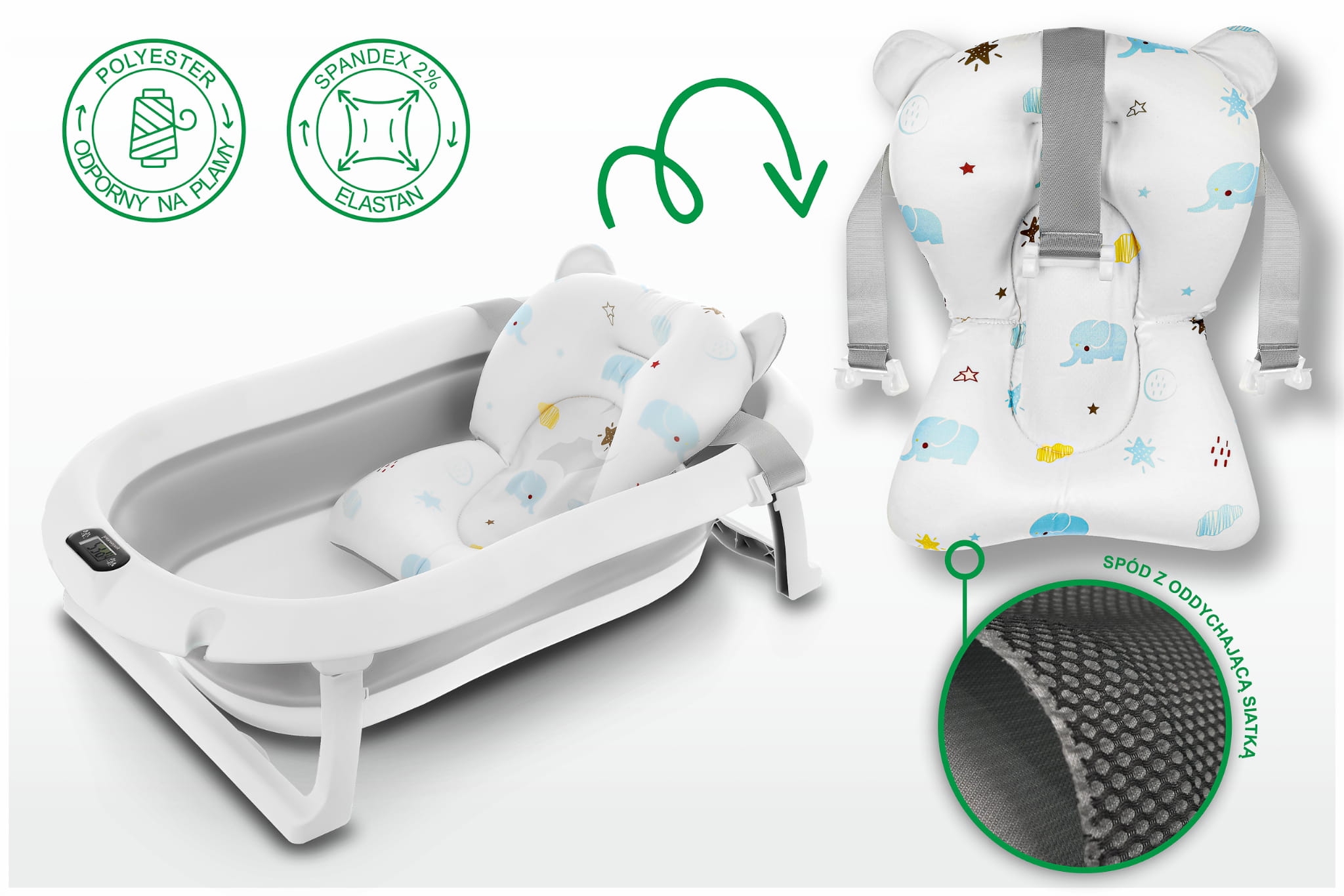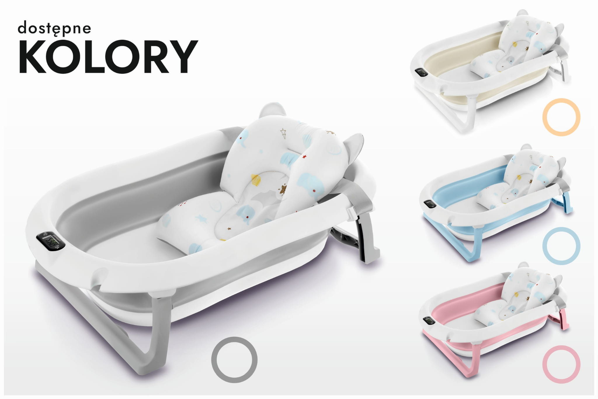 Wanienka została zaprojektowana z myślą o codziennej wygodzie rodziców. Dzięki składanej konstrukcji możesz ją łatwo przechowywać w szafie lub zabrać ze sobą w podróż. Wbudowany termometr pozwala na monitorowanie temperatury wody, co daje pewność, że maluszek będzie kąpany w komfortowych warunkach (przed włożeniem dziecka do wody, zawsze upewnij się, że jej temperatura jest odpowiednia!). Dodatkowa poduszka montowana na pasach pozwala na kąpiel noworodków, stabilizując jego pozycję.