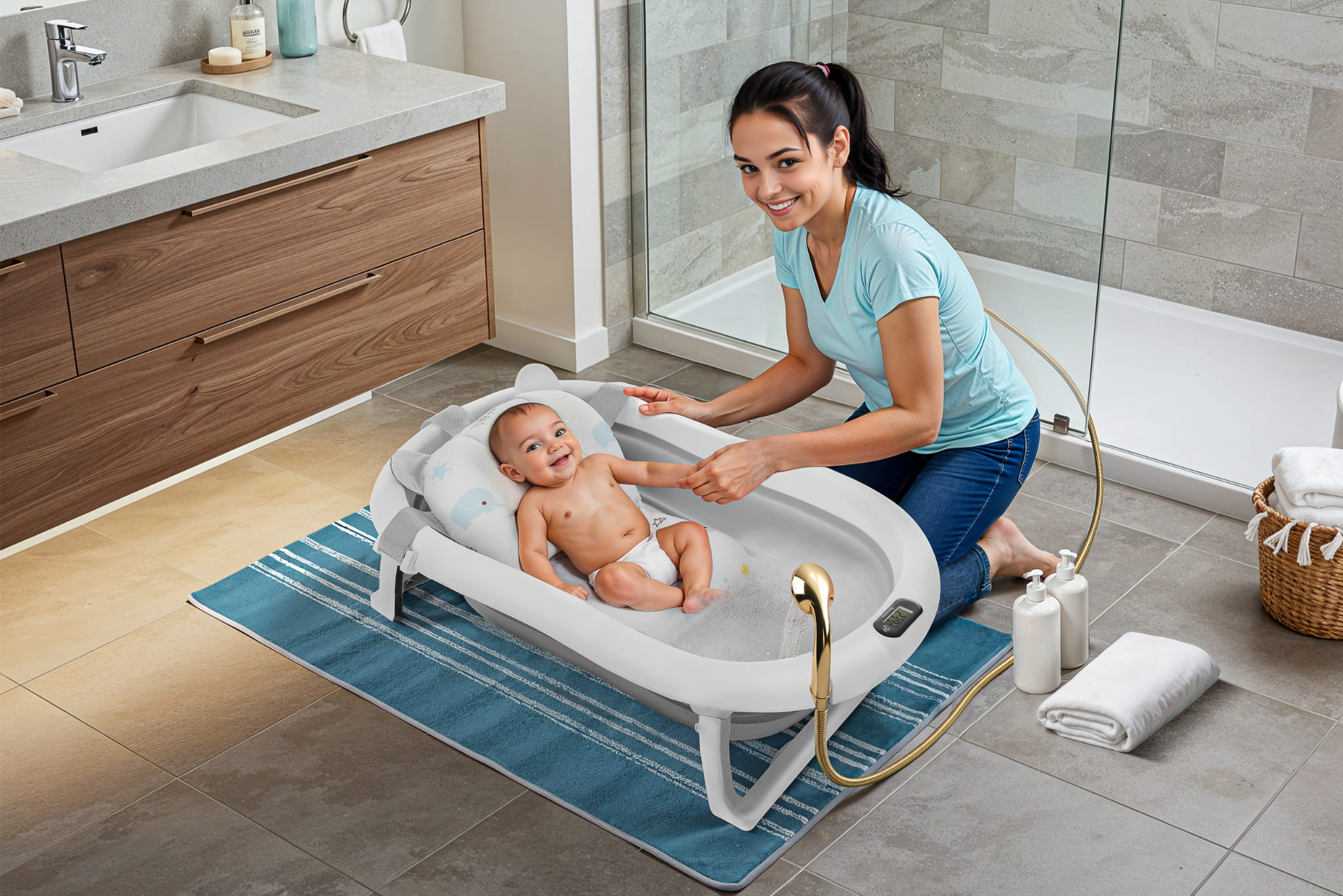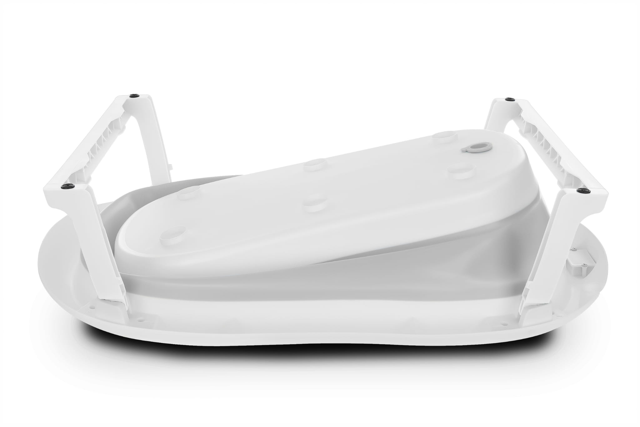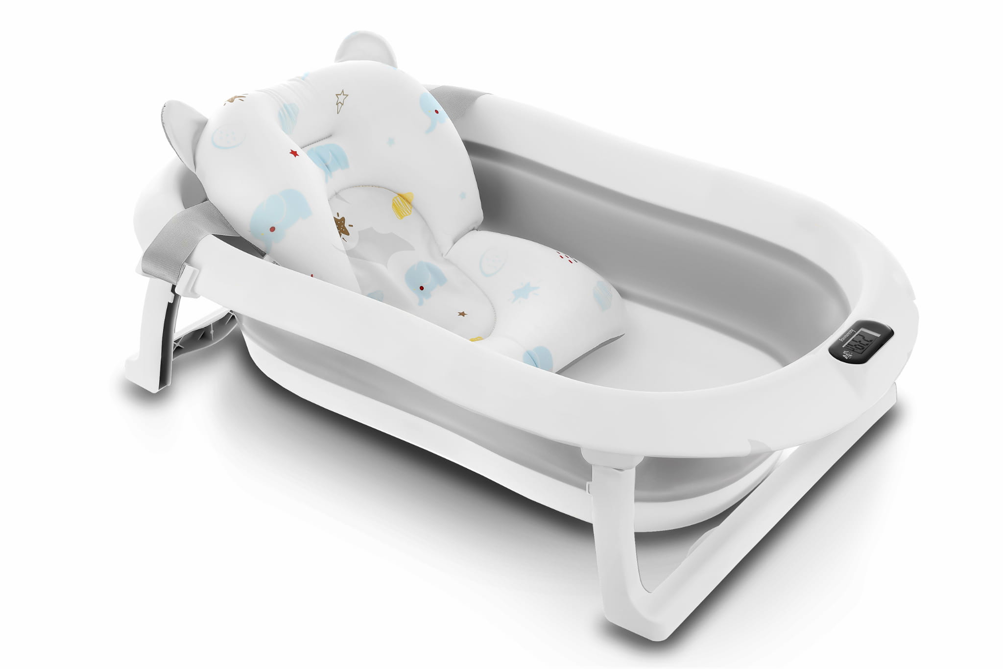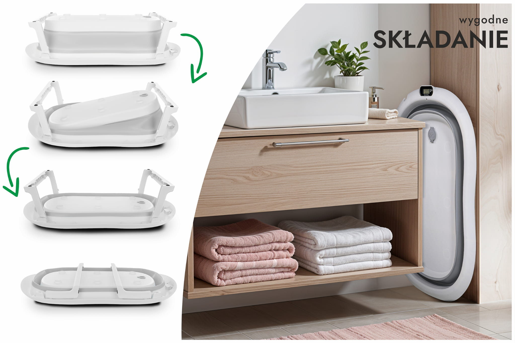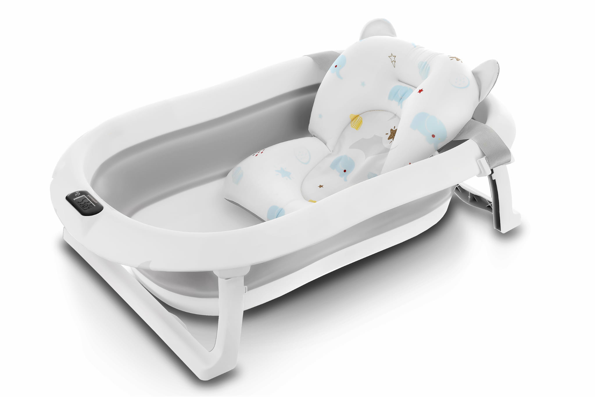 Wanienka została zaprojektowana z myślą o codziennej wygodzie rodziców. Dzięki składanej konstrukcji możesz ją łatwo przechowywać w szafie lub zabrać ze sobą w podróż. Wbudowany termometr pozwala na monitorowanie temperatury wody, co daje pewność, że maluszek będzie kąpany w komfortowych warunkach (przed włożeniem dziecka do wody, zawsze upewnij się, że jej temperatura jest odpowiednia!). Dodatkowa poduszka montowana na pasach pozwala na kąpiel noworodków, stabilizując jego pozycję.