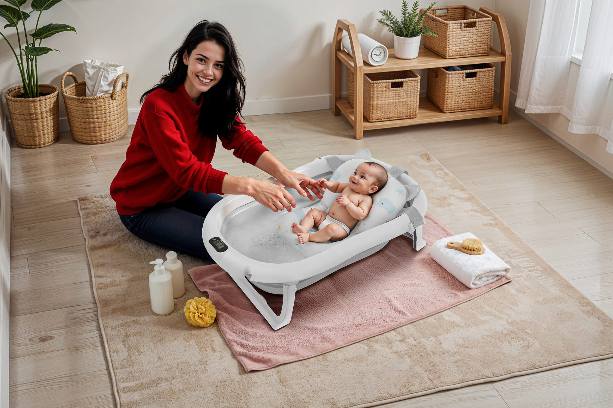 W codziennej opiece nad niemowlakiem nie brakuje wyzwań, dlatego z przyjemnością przedstawiamy naszą składaną wanienkę dziecięcą z wbudowanym termometrem. Dzięki swojej funkcjonalności i łatwości przechowywania, jest idealna do małych mieszkań, czy w trakcie podróży. Wanienka zapewnia komfort i bezpieczeństwo malutkim noworodkom dzięki dodatkowej poduszce. Jest ona łatwa do zdjęcia, dlatego wanienka posłuży także starszym dzieciom. Specyfikacja: