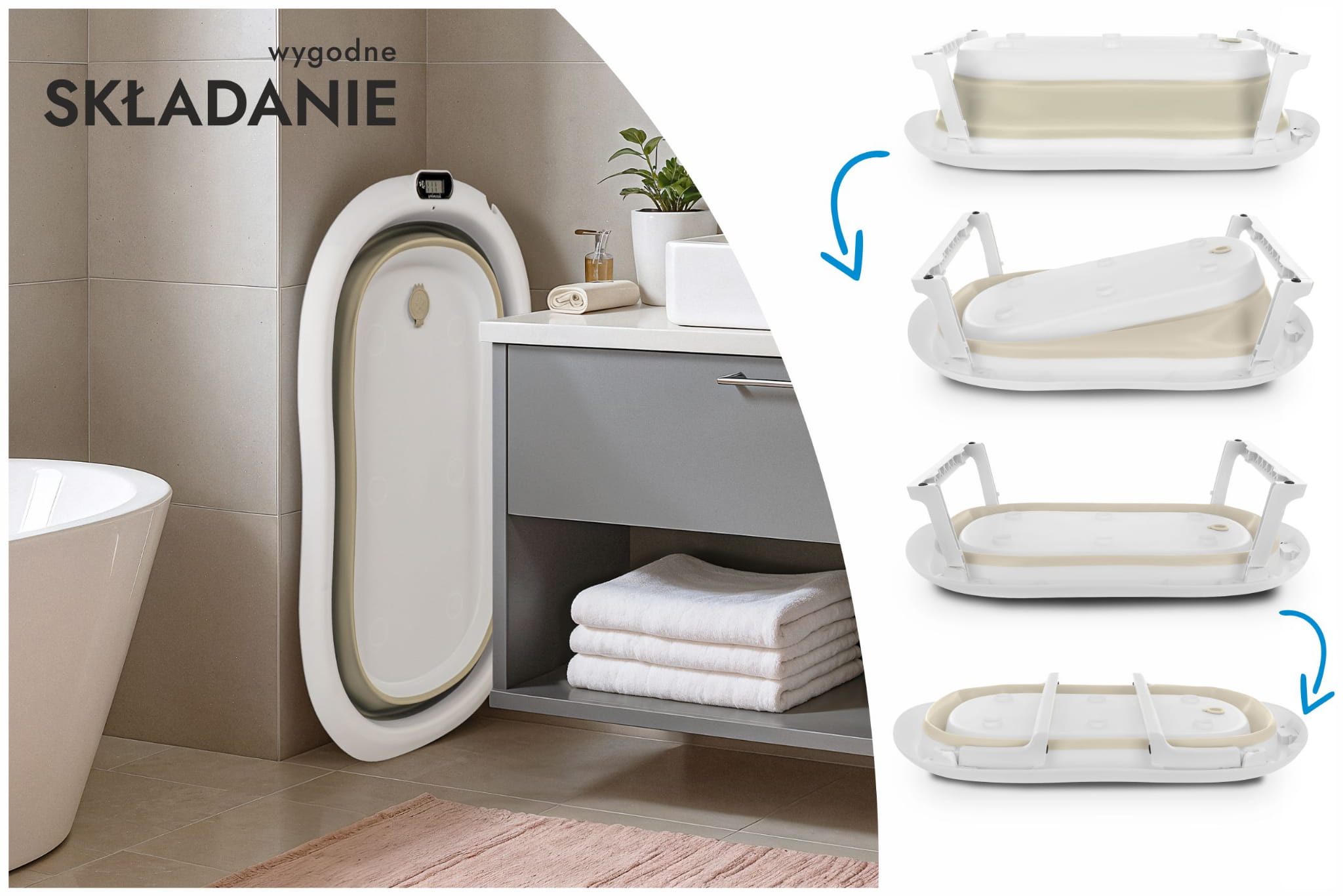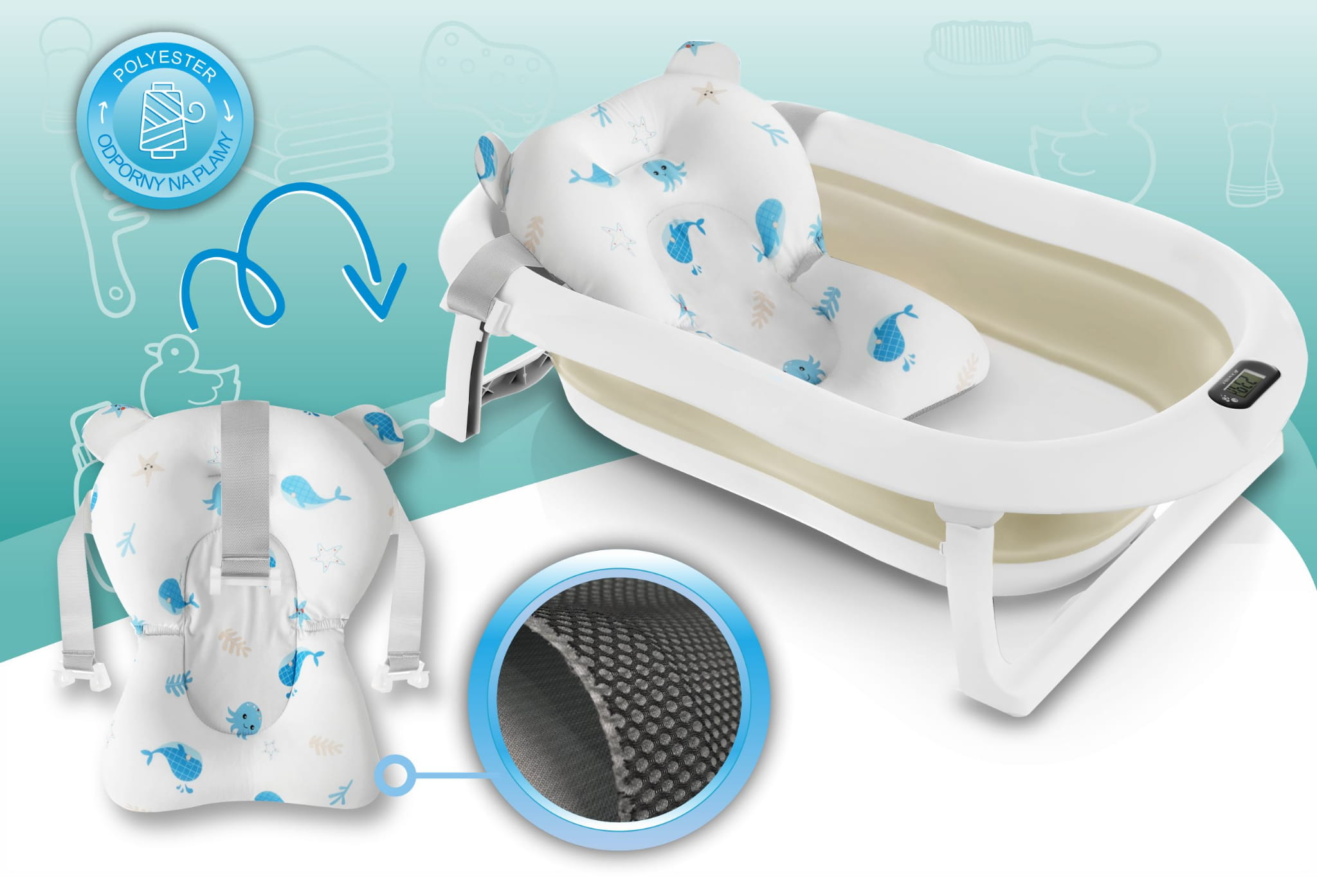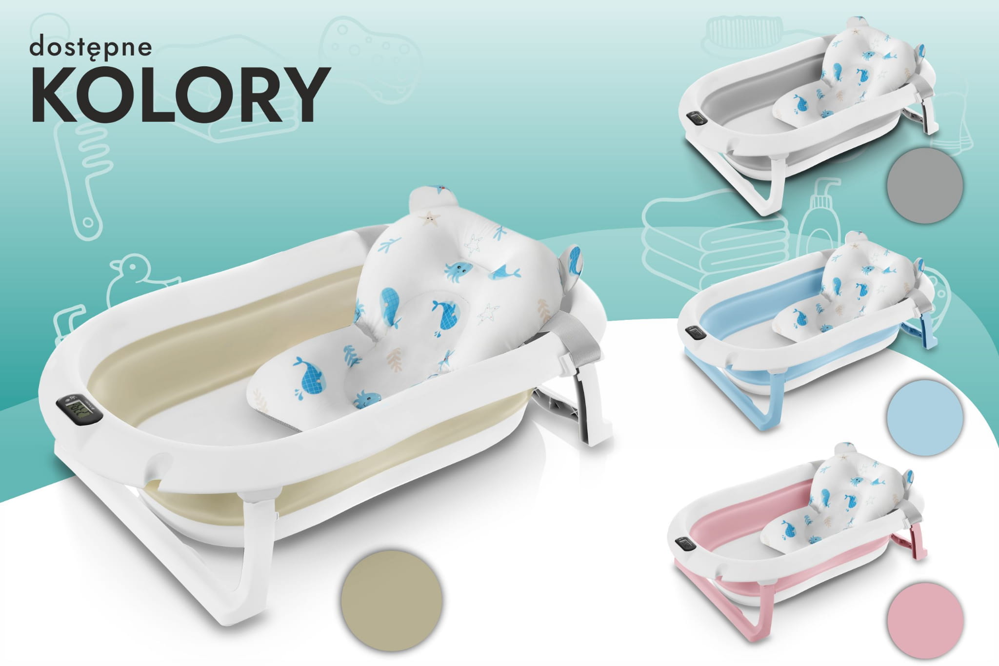 Wanienka została zaprojektowana z myślą o codziennej wygodzie rodziców. Dzięki składanej konstrukcji możesz ją łatwo przechowywać w szafie lub zabrać ze sobą w podróż. Wbudowany termometr pozwala na monitorowanie temperatury wody, co daje pewność, że maluszek będzie kąpany w komfortowych warunkach (przed włożeniem dziecka do wody, zawsze upewnij się, że jej temperatura jest odpowiednia!). Dodatkowa poduszka montowana na pasach pozwala na kąpiel noworodków, stabilizując jego pozycję.