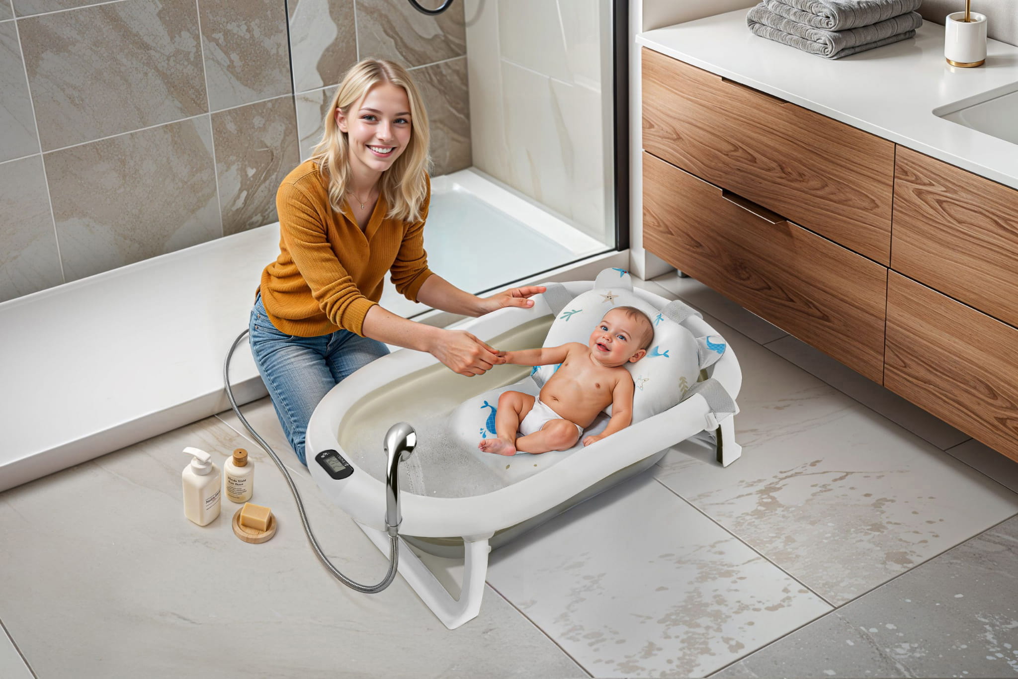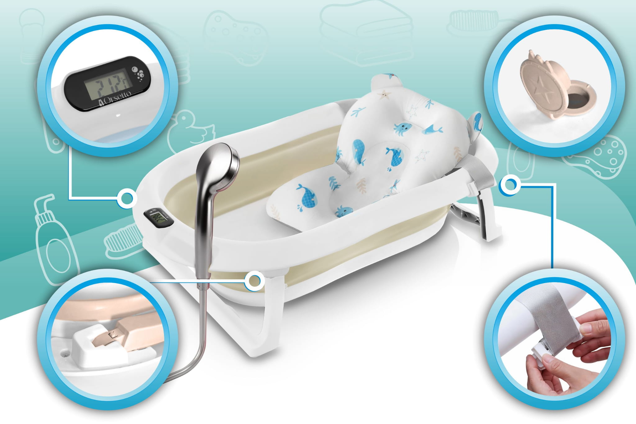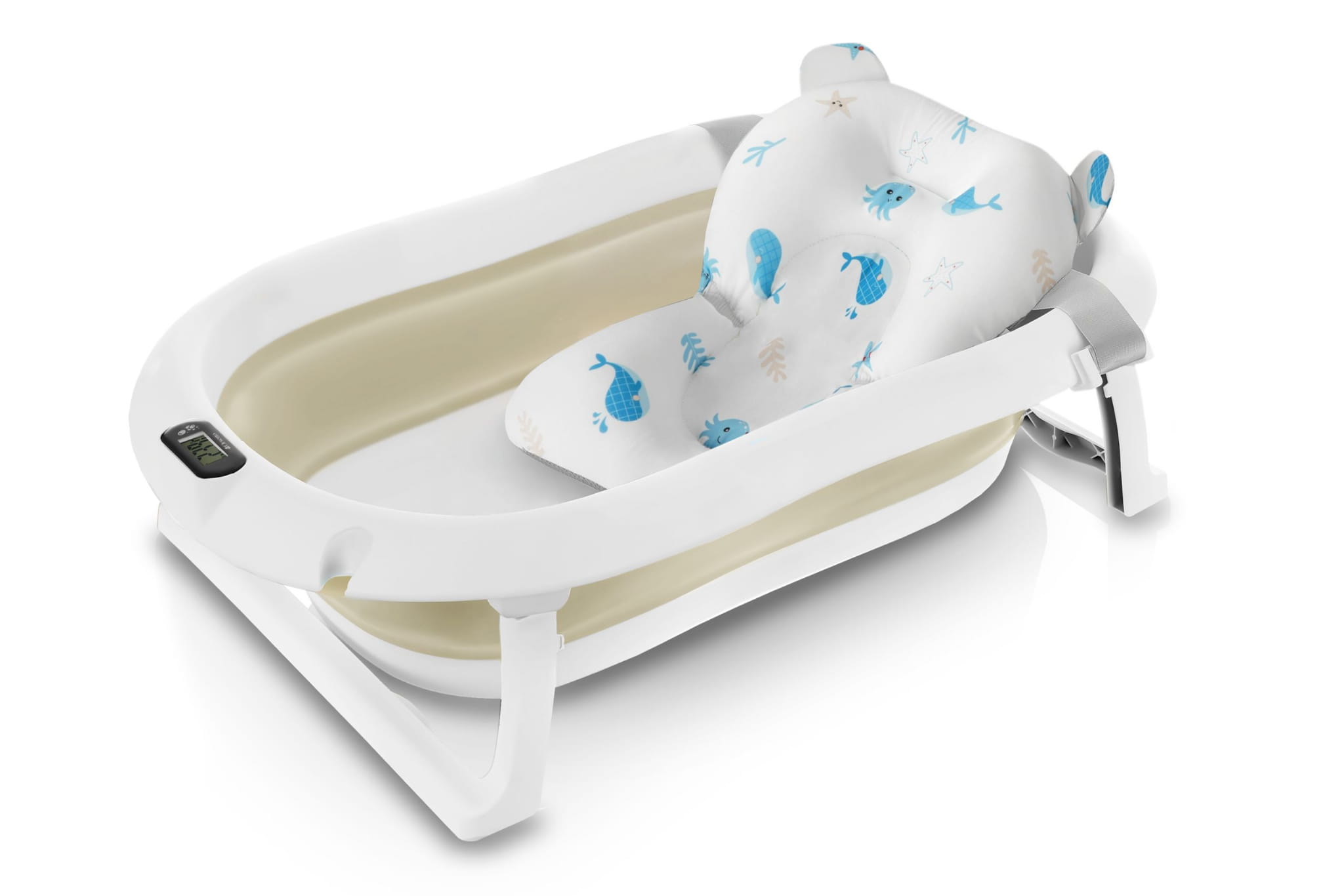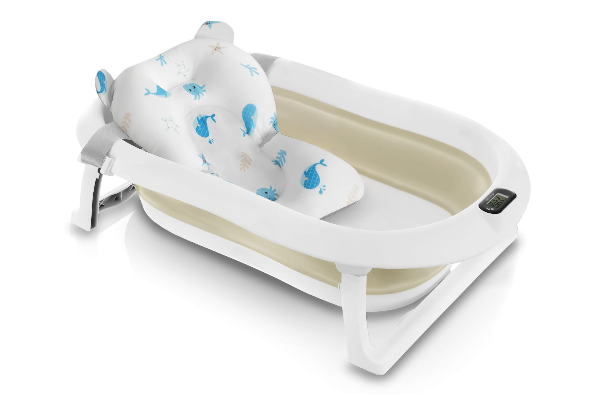 Wanienka została zaprojektowana z myślą o codziennej wygodzie rodziców. Dzięki składanej konstrukcji możesz ją łatwo przechowywać w szafie lub zabrać ze sobą w podróż. Wbudowany termometr pozwala na monitorowanie temperatury wody, co daje pewność, że maluszek będzie kąpany w komfortowych warunkach (przed włożeniem dziecka do wody, zawsze upewnij się, że jej temperatura jest odpowiednia!). Dodatkowa poduszka montowana na pasach pozwala na kąpiel noworodków, stabilizując jego pozycję.