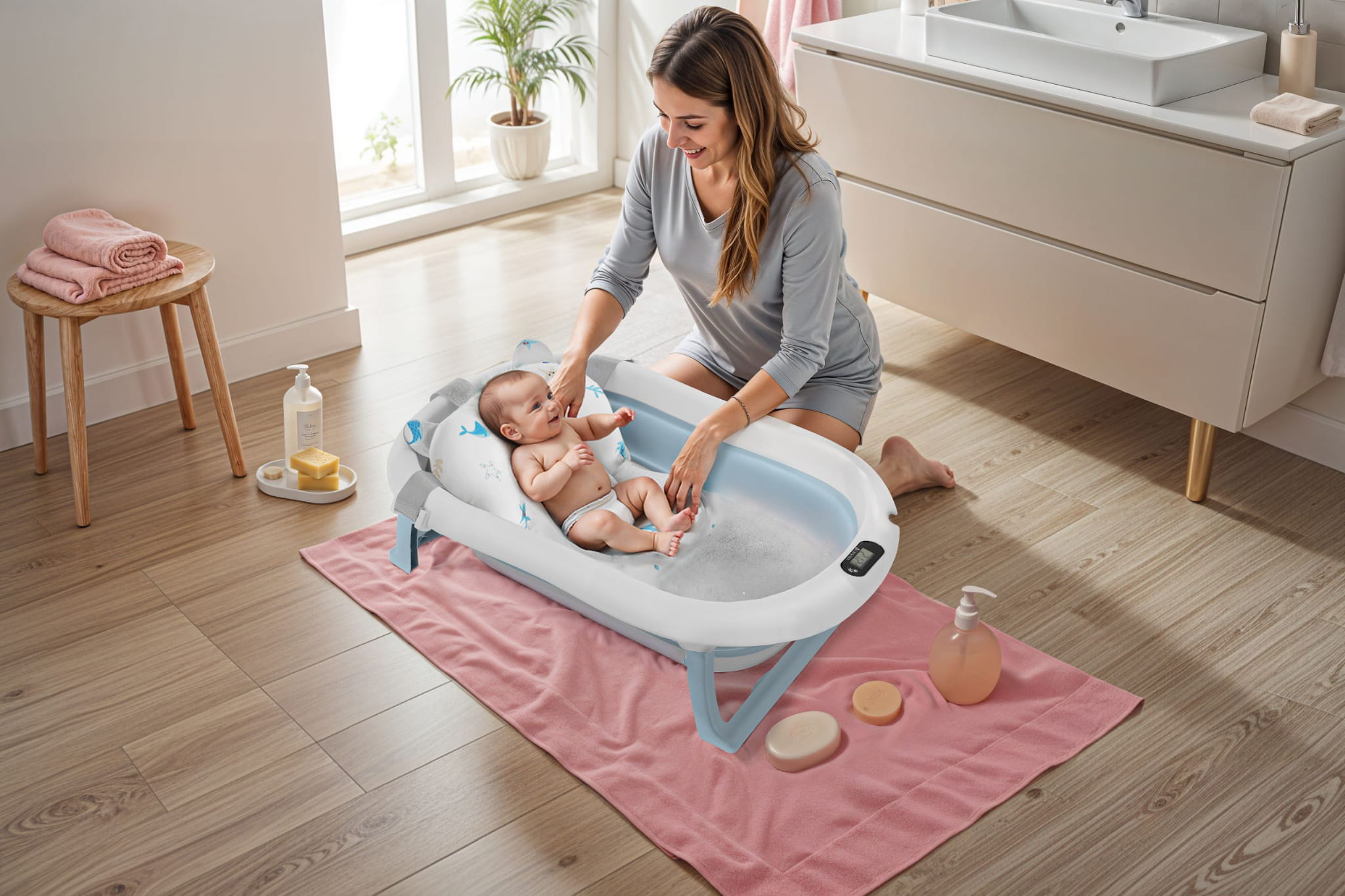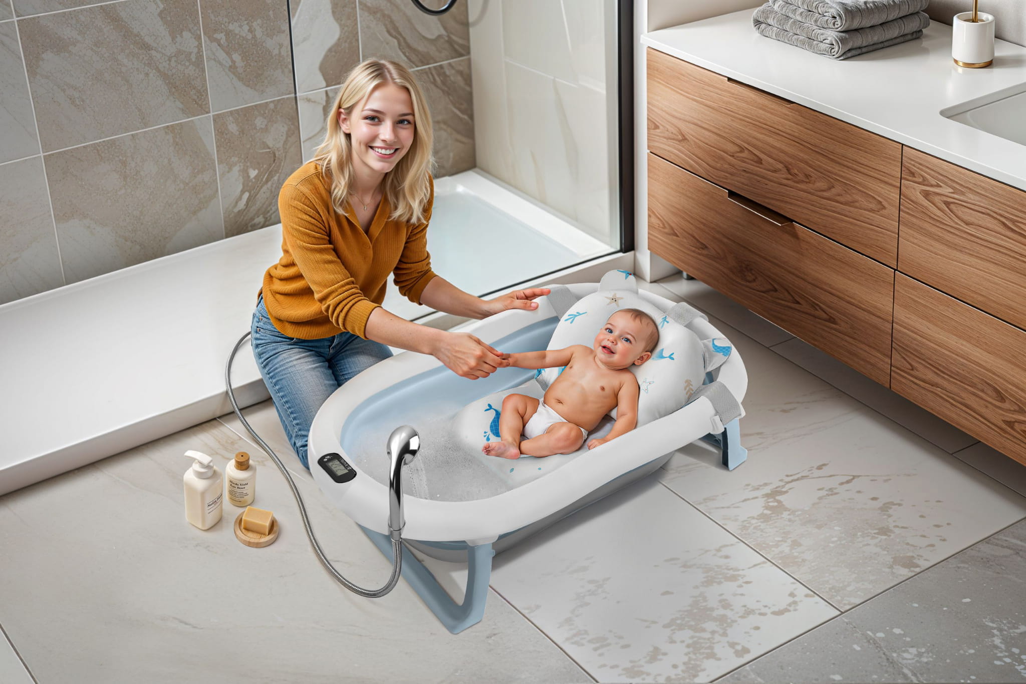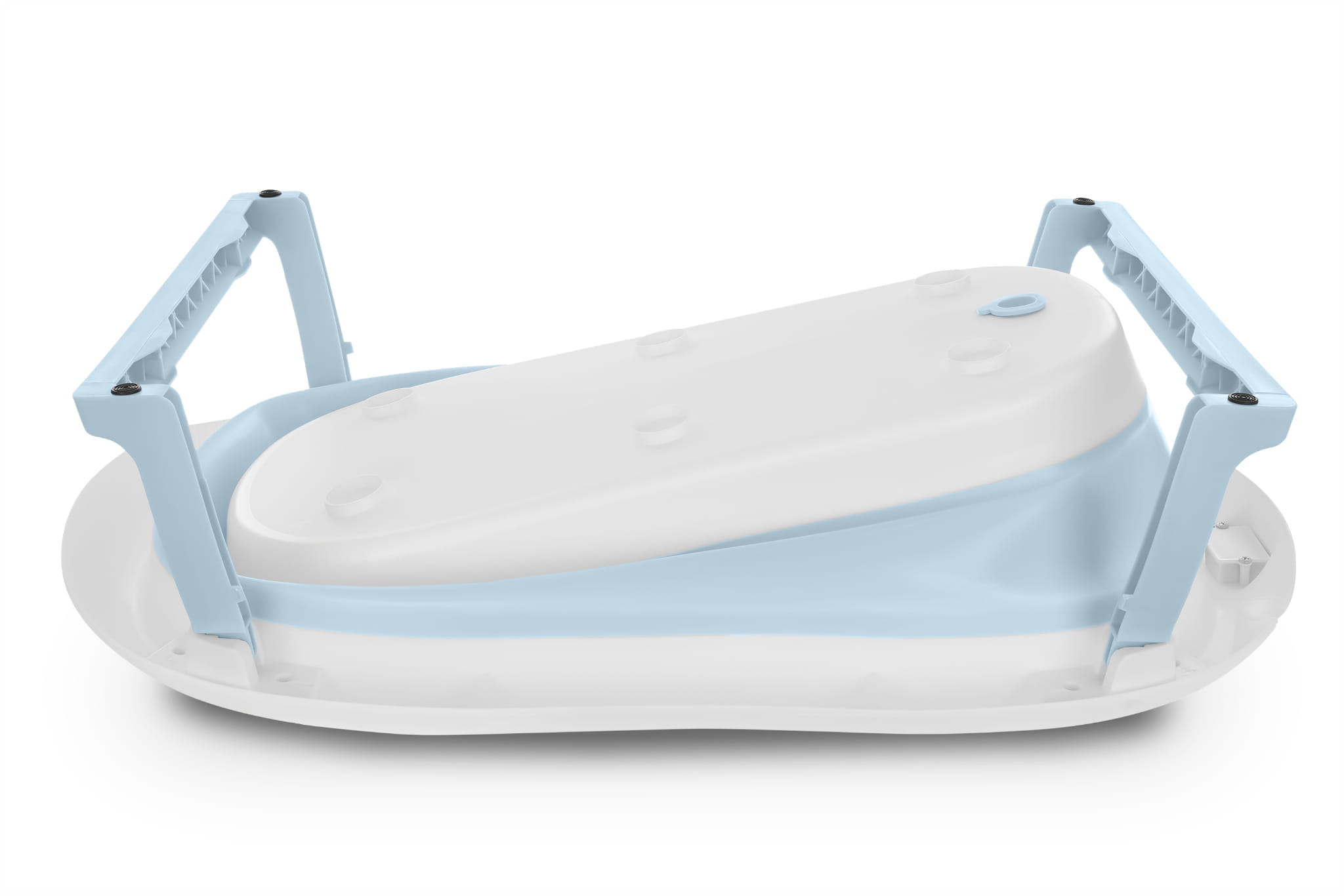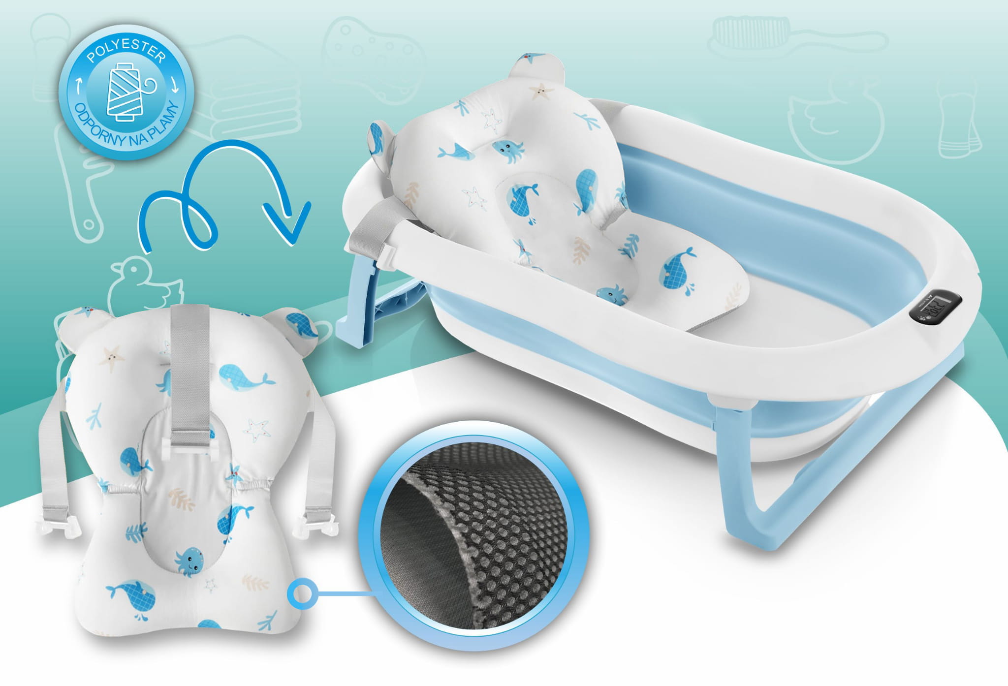 Wanienka została zaprojektowana z myślą o codziennej wygodzie rodziców. Dzięki składanej konstrukcji możesz ją łatwo przechowywać w szafie lub zabrać ze sobą w podróż. Wbudowany termometr pozwala na monitorowanie temperatury wody, co daje pewność, że maluszek będzie kąpany w komfortowych warunkach (przed włożeniem dziecka do wody, zawsze upewnij się, że jej temperatura jest odpowiednia!). Dodatkowa poduszka montowana na pasach pozwala na kąpiel noworodków, stabilizując jego pozycję.
