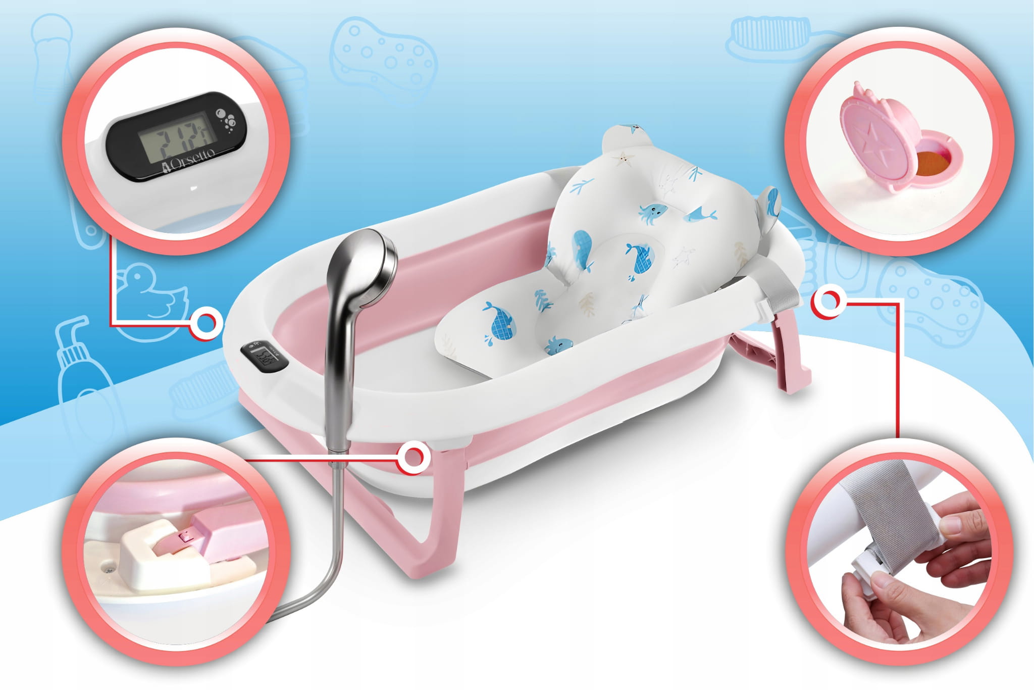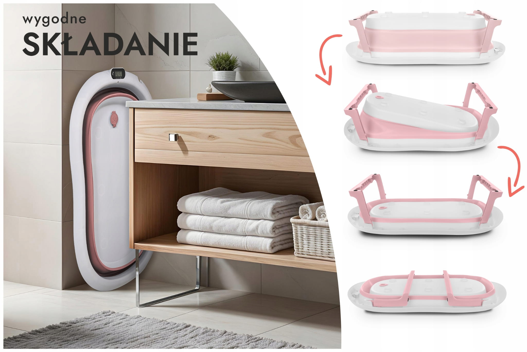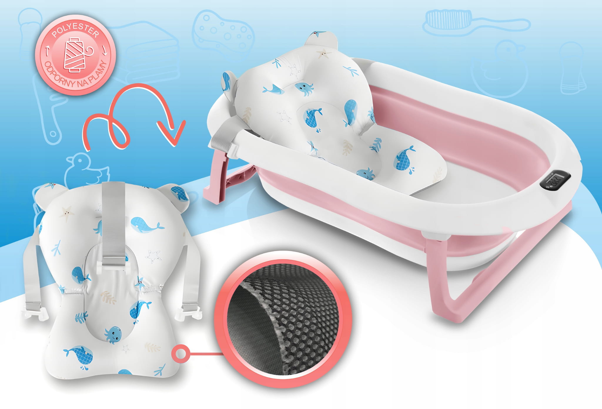 Wanienka została zaprojektowana z myślą o codziennej wygodzie rodziców. Dzięki składanej konstrukcji możesz ją łatwo przechowywać w szafie lub zabrać ze sobą w podróż. Wbudowany termometr pozwala na monitorowanie temperatury wody, co daje pewność, że maluszek będzie kąpany w komfortowych warunkach (przed włożeniem dziecka do wody, zawsze upewnij się, że jej temperatura jest odpowiednia!). Dodatkowa poduszka montowana na pasach pozwala na kąpiel noworodków, stabilizując jego pozycję.