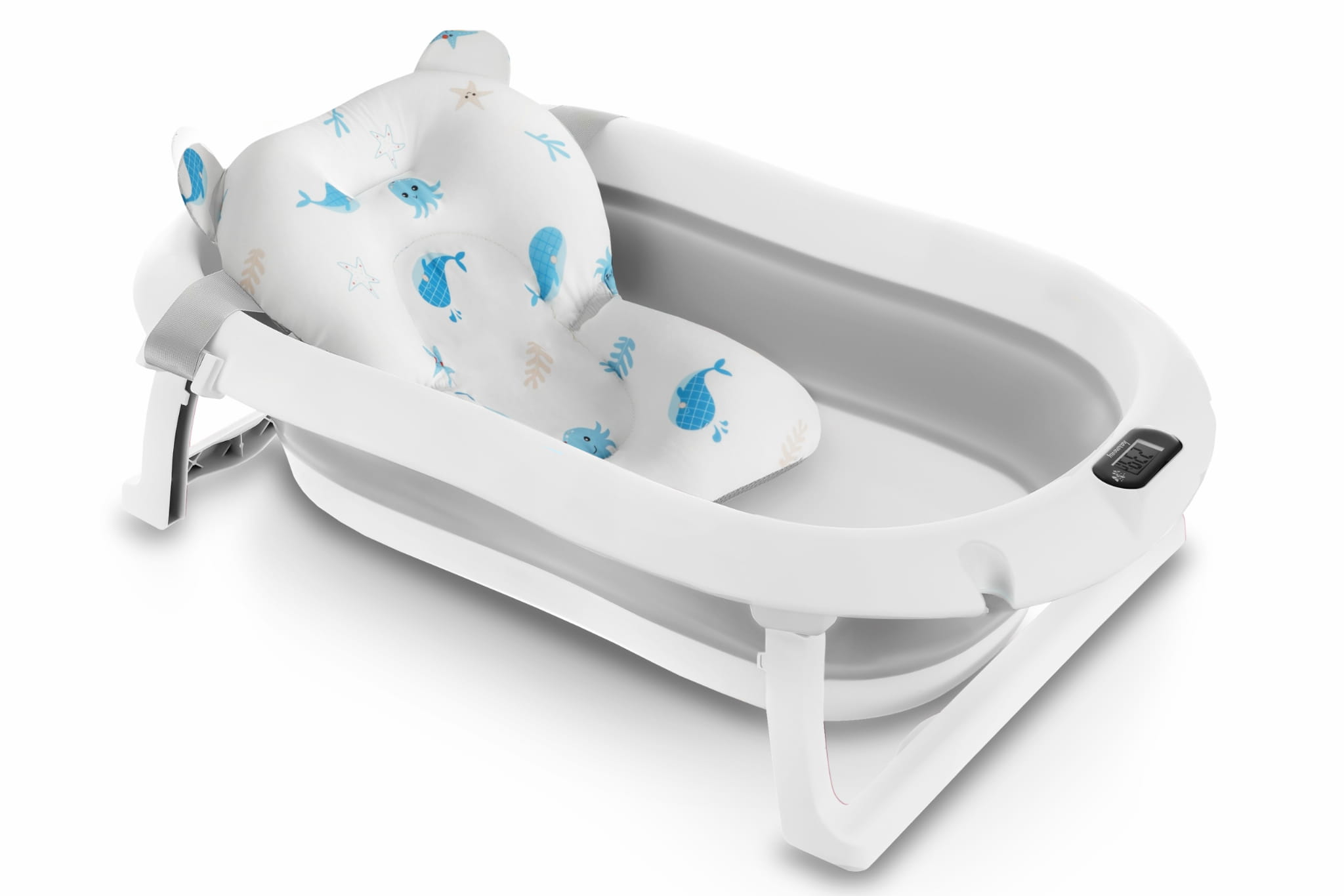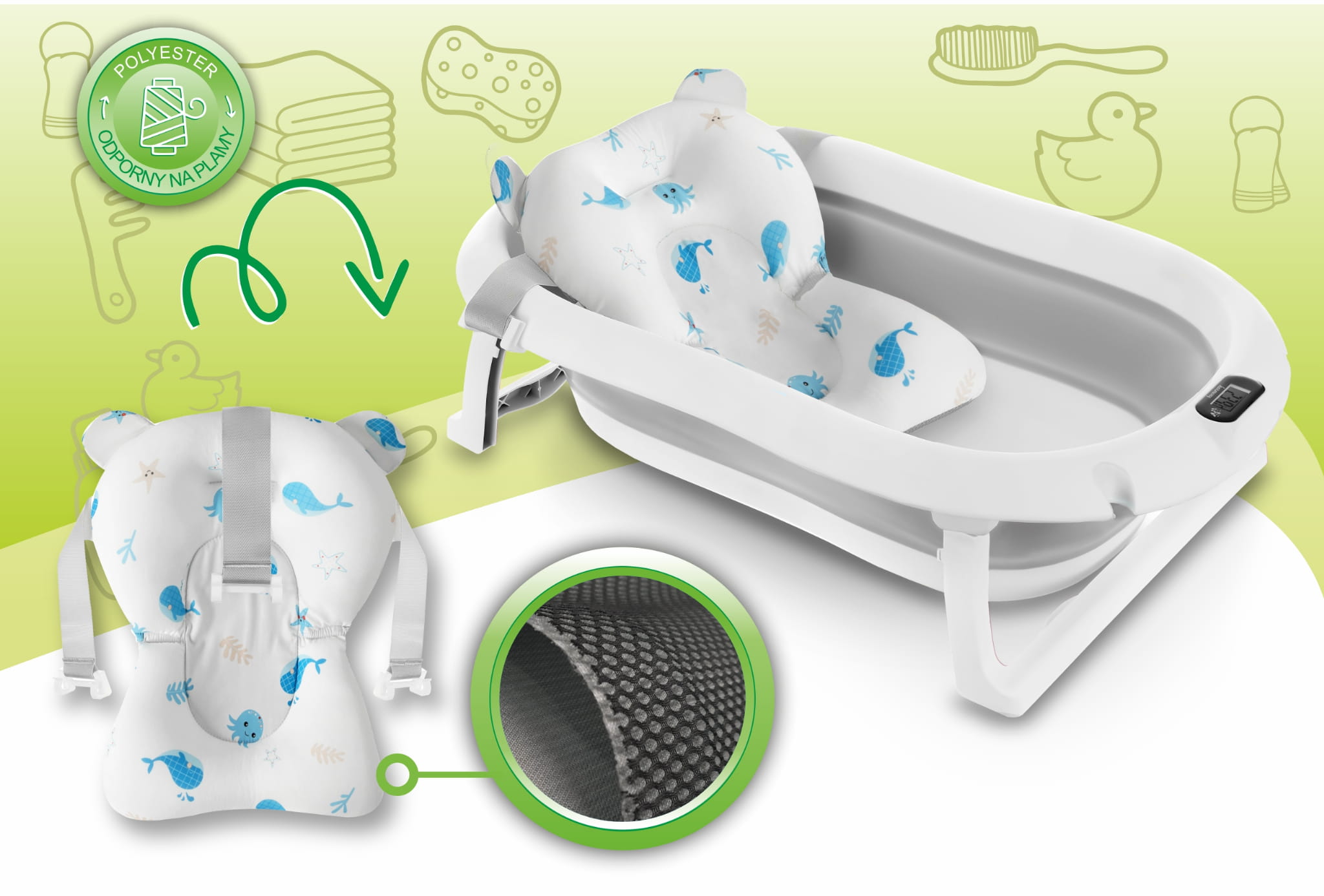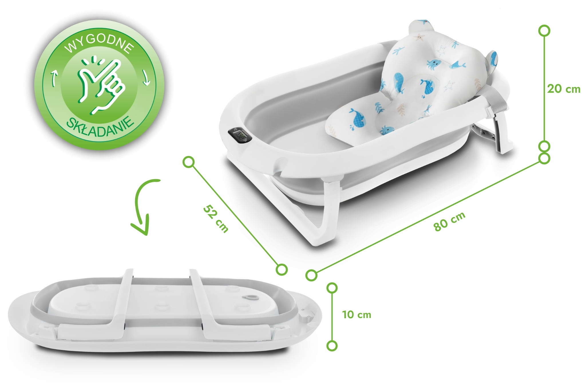 Wanienka została zaprojektowana z myślą o codziennej wygodzie rodziców. Dzięki składanej konstrukcji możesz ją łatwo przechowywać w szafie lub zabrać ze sobą w podróż. Wbudowany termometr pozwala na monitorowanie temperatury wody, co daje pewność, że maluszek będzie kąpany w komfortowych warunkach (przed włożeniem dziecka do wody, zawsze upewnij się, że jej temperatura jest odpowiednia!). Dodatkowa poduszka montowana na pasach pozwala na kąpiel noworodków, stabilizując jego pozycję.
