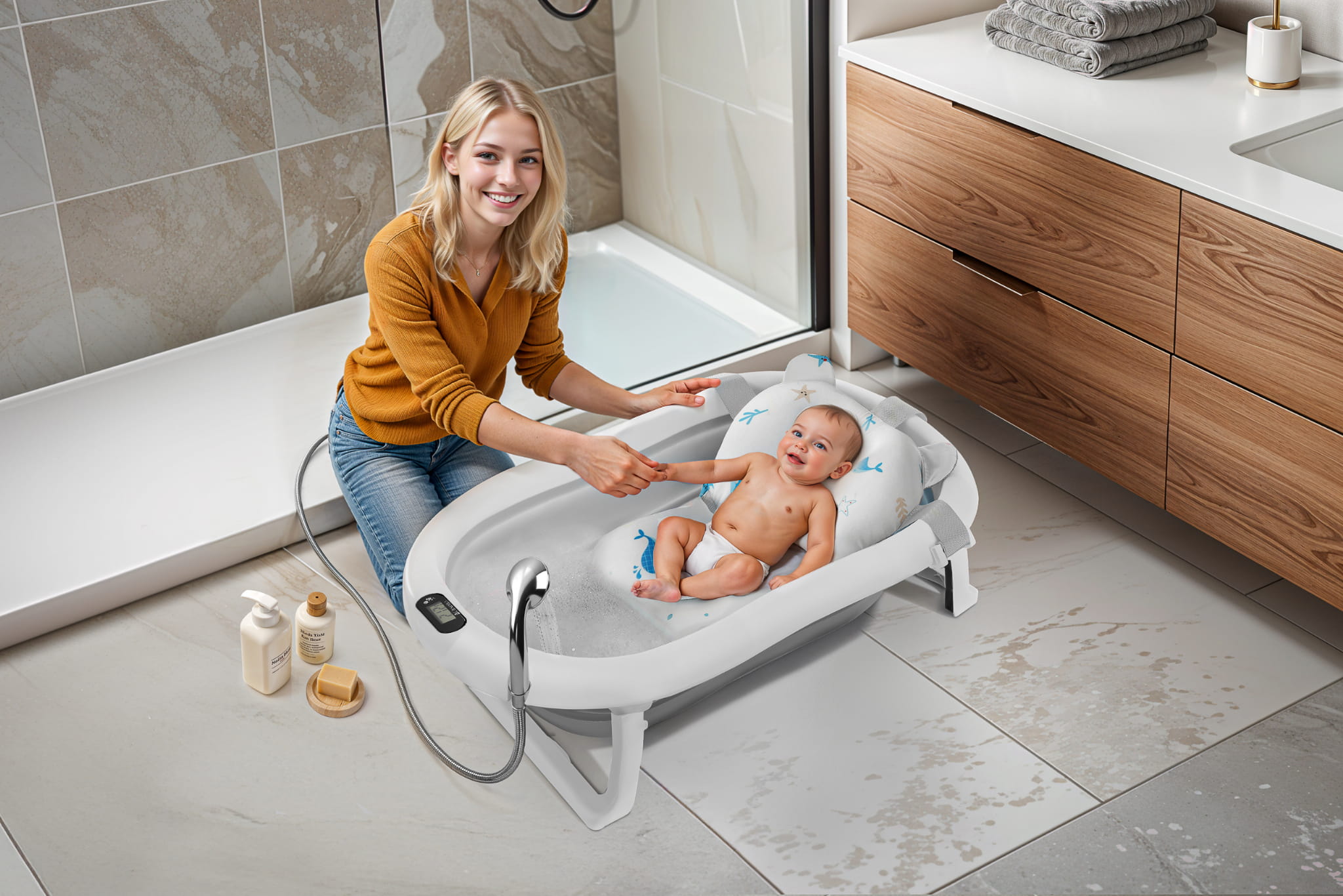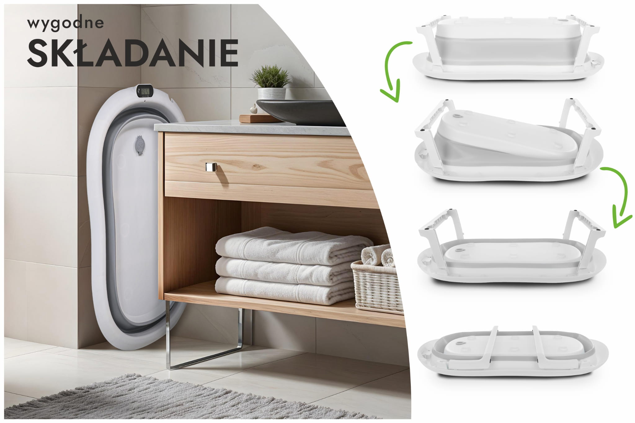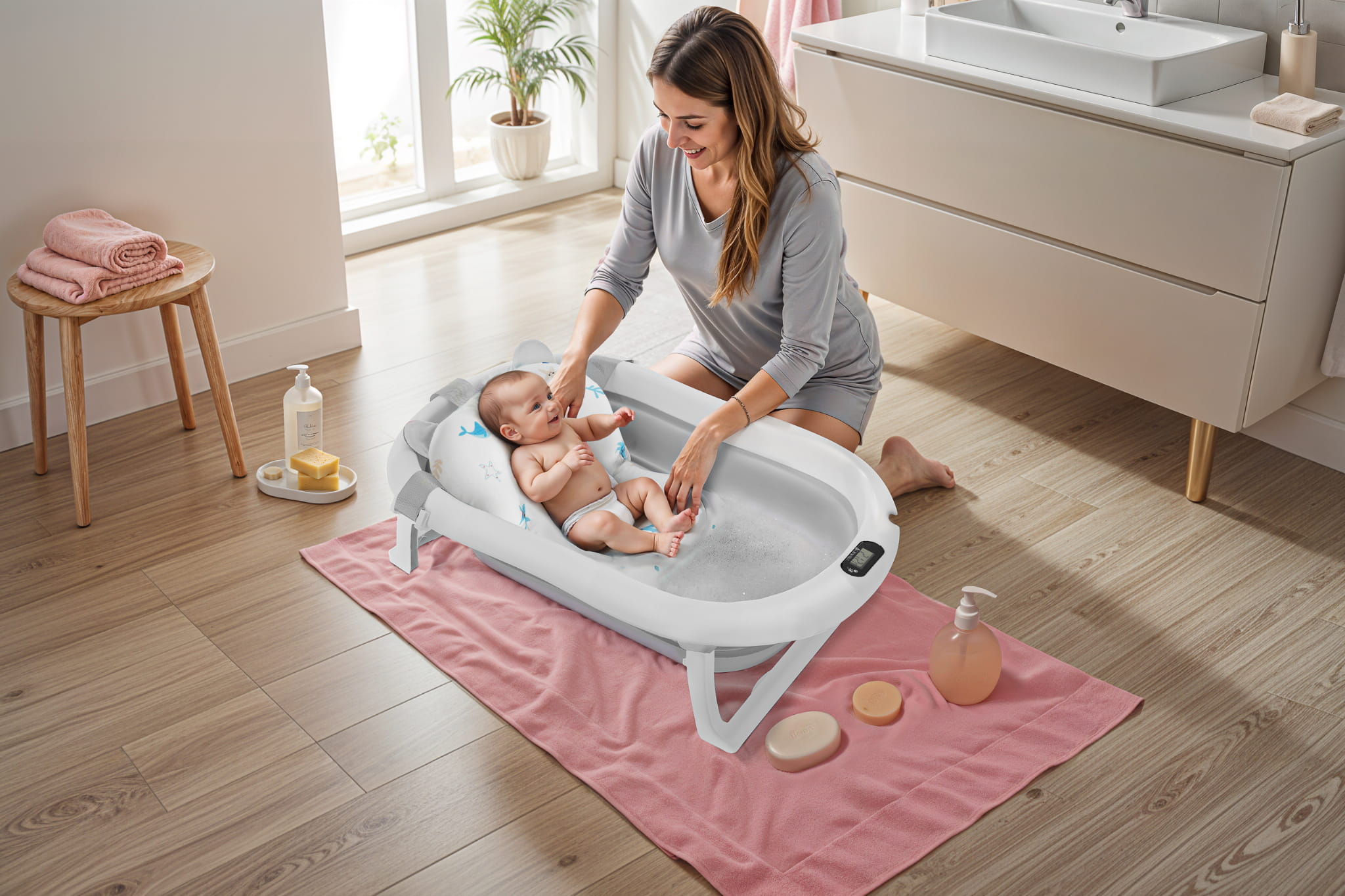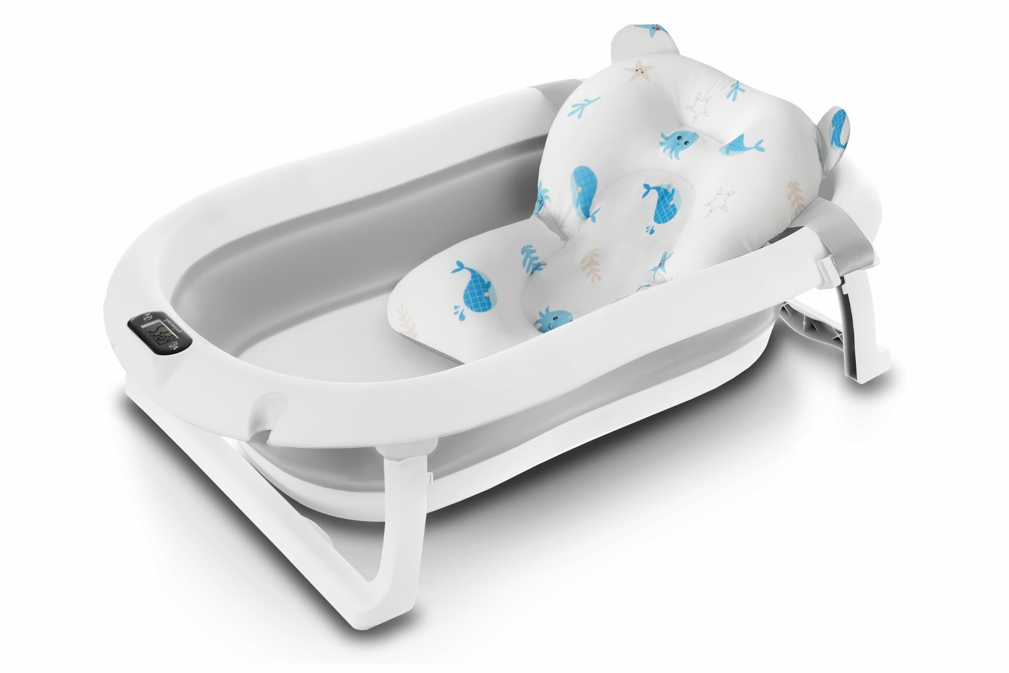 Wanienka została zaprojektowana z myślą o codziennej wygodzie rodziców. Dzięki składanej konstrukcji możesz ją łatwo przechowywać w szafie lub zabrać ze sobą w podróż. Wbudowany termometr pozwala na monitorowanie temperatury wody, co daje pewność, że maluszek będzie kąpany w komfortowych warunkach (przed włożeniem dziecka do wody, zawsze upewnij się, że jej temperatura jest odpowiednia!). Dodatkowa poduszka montowana na pasach pozwala na kąpiel noworodków, stabilizując jego pozycję.