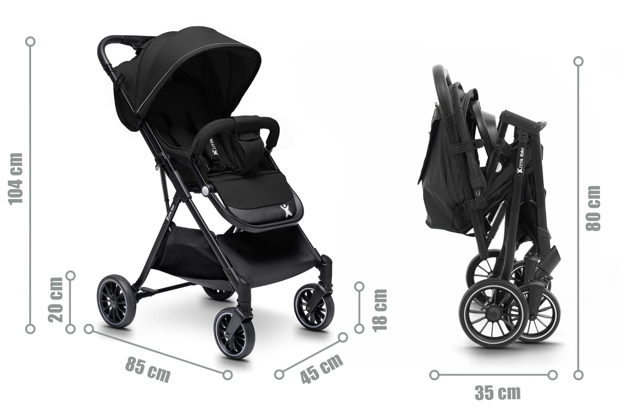 • Wymiary rozłożonego wózka: 104 x 85 x 45 cm
