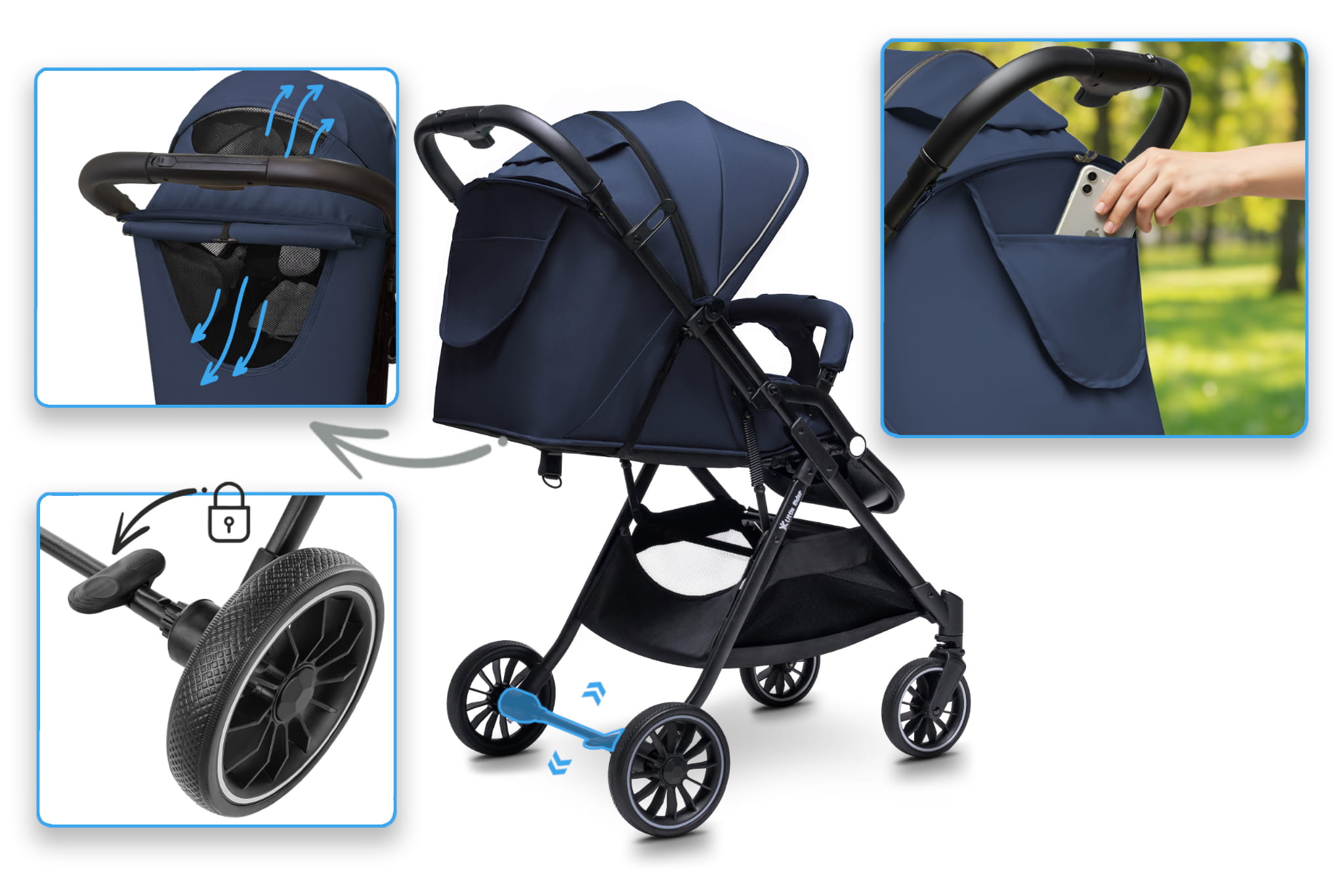 • Łatwy system składania jedną ręką – w kilka sekund złożysz wózek do kompaktowych rozmiarów, co jest niezwykle praktyczne podczas codziennych spacerów czy podróży.