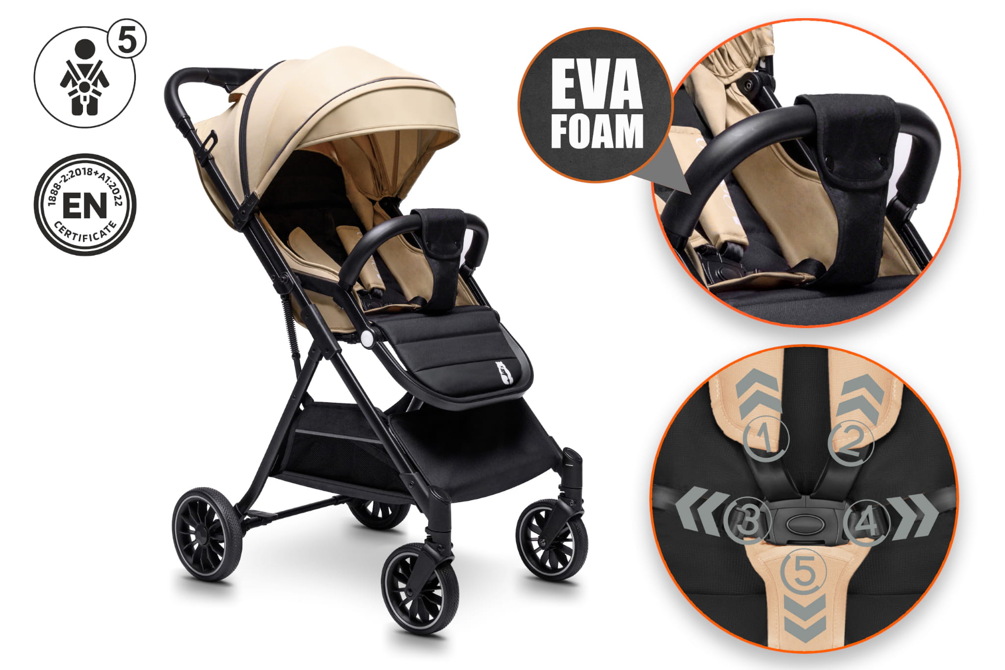 • 5-punktowe pasy z miękkimi nakładkami – zapewniają maksymalne bezpieczeństwo dziecka i komfort bez podrażnień skóry.