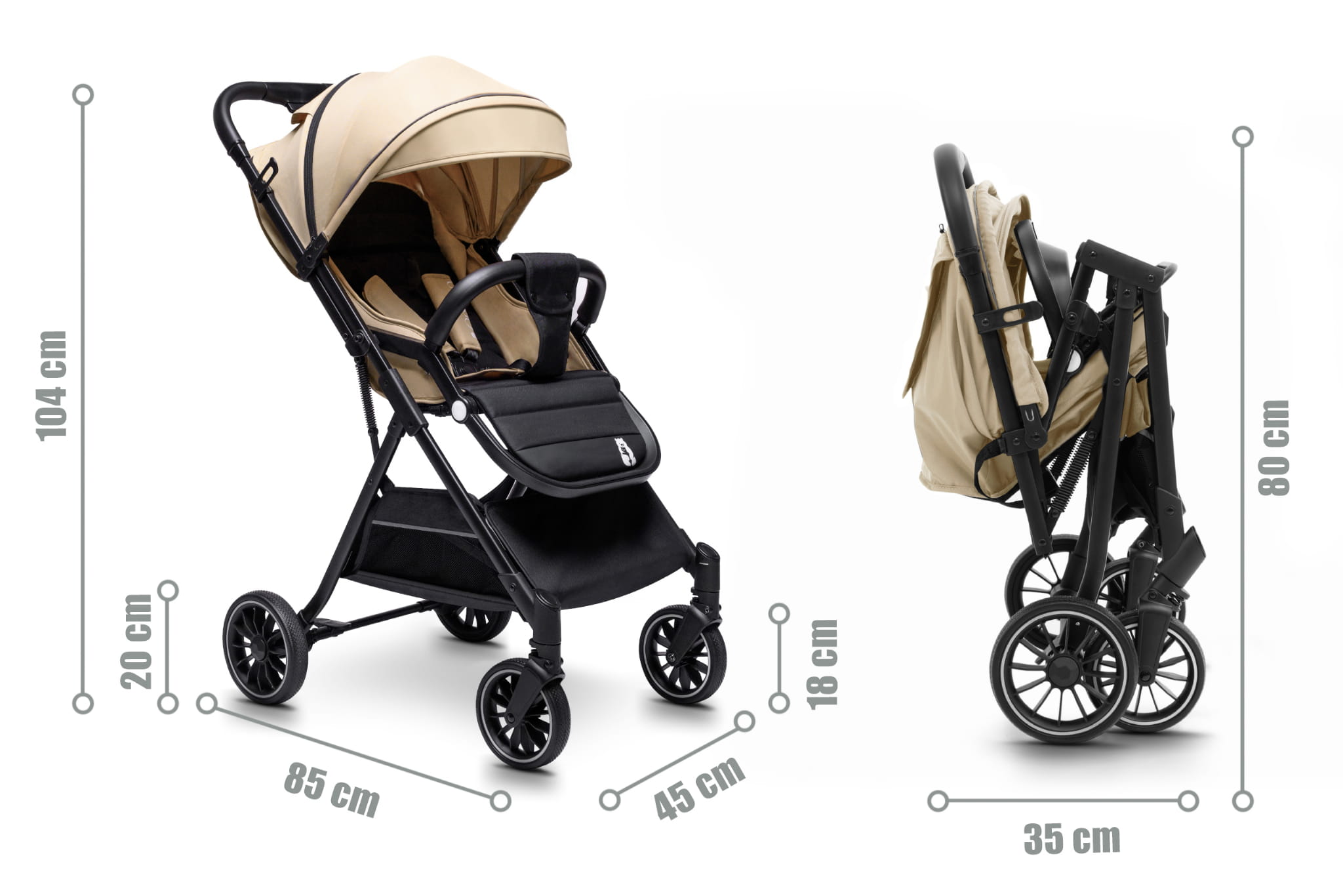 • Wymiary rozłożonego wózka: 104 x 85 x 45 cm