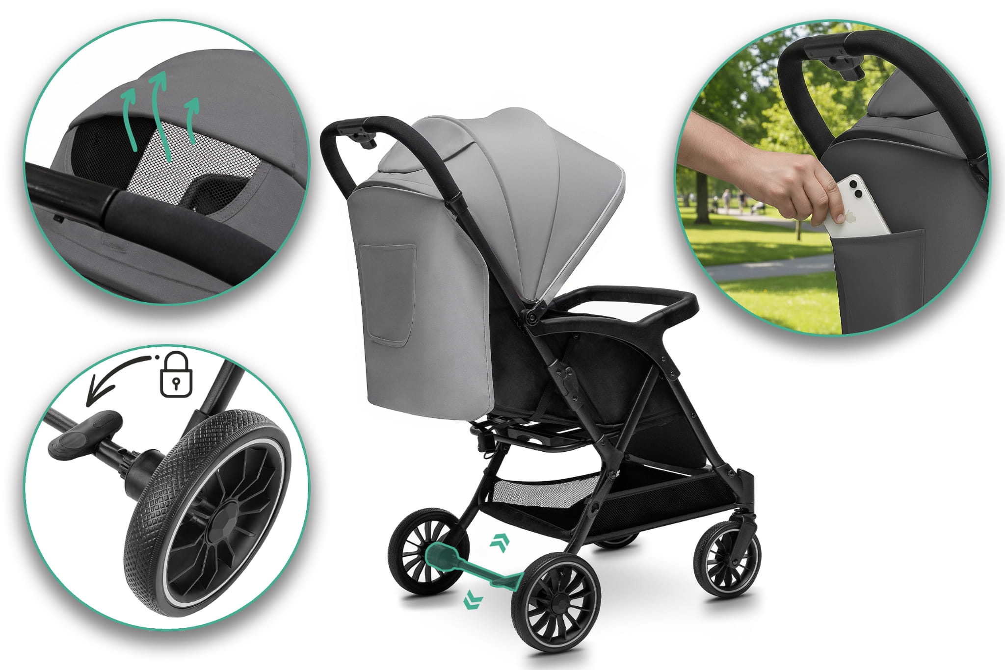 • Łatwy system składania jedną ręką – w kilka sekund złożysz wózek do kompaktowych rozmiarów, co jest niezwykle praktyczne podczas codziennych spacerów czy podróży.